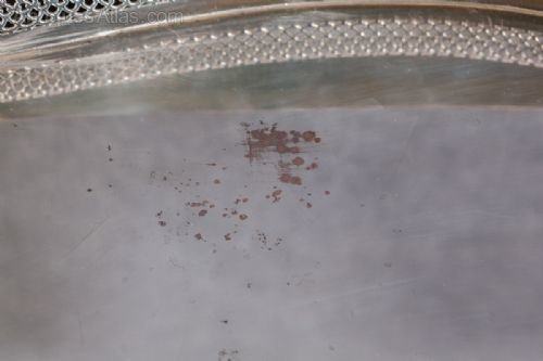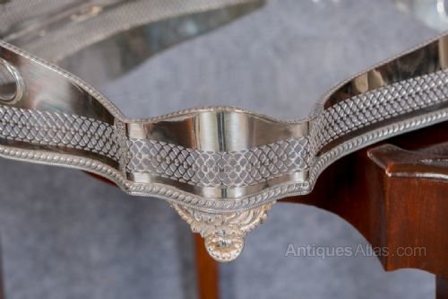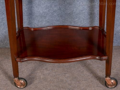 A useful Edwardian silver plated and pierced galleried tray of serpentine form with shaped feet. The tray feet fit snuggly into the mahogany trolley which is of conforming serpentine form and stands on square tapering legs with an under tier and copper casters with rubber wheels. The whole runs very smoothly, the tray with a minor blemish which can be seen in the photos and is associated with age and use. More photos available. Dimensions:- Height…29.5’’/ 75cm. Width…24’’/ 61cm. Depth…16.25’’/ 41cm.