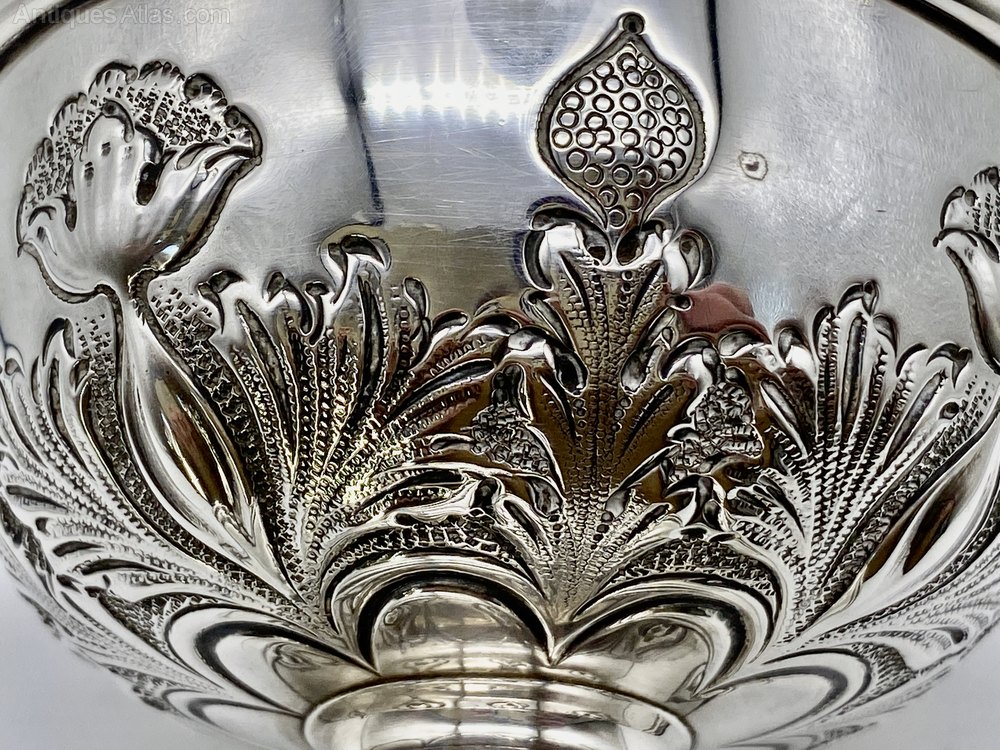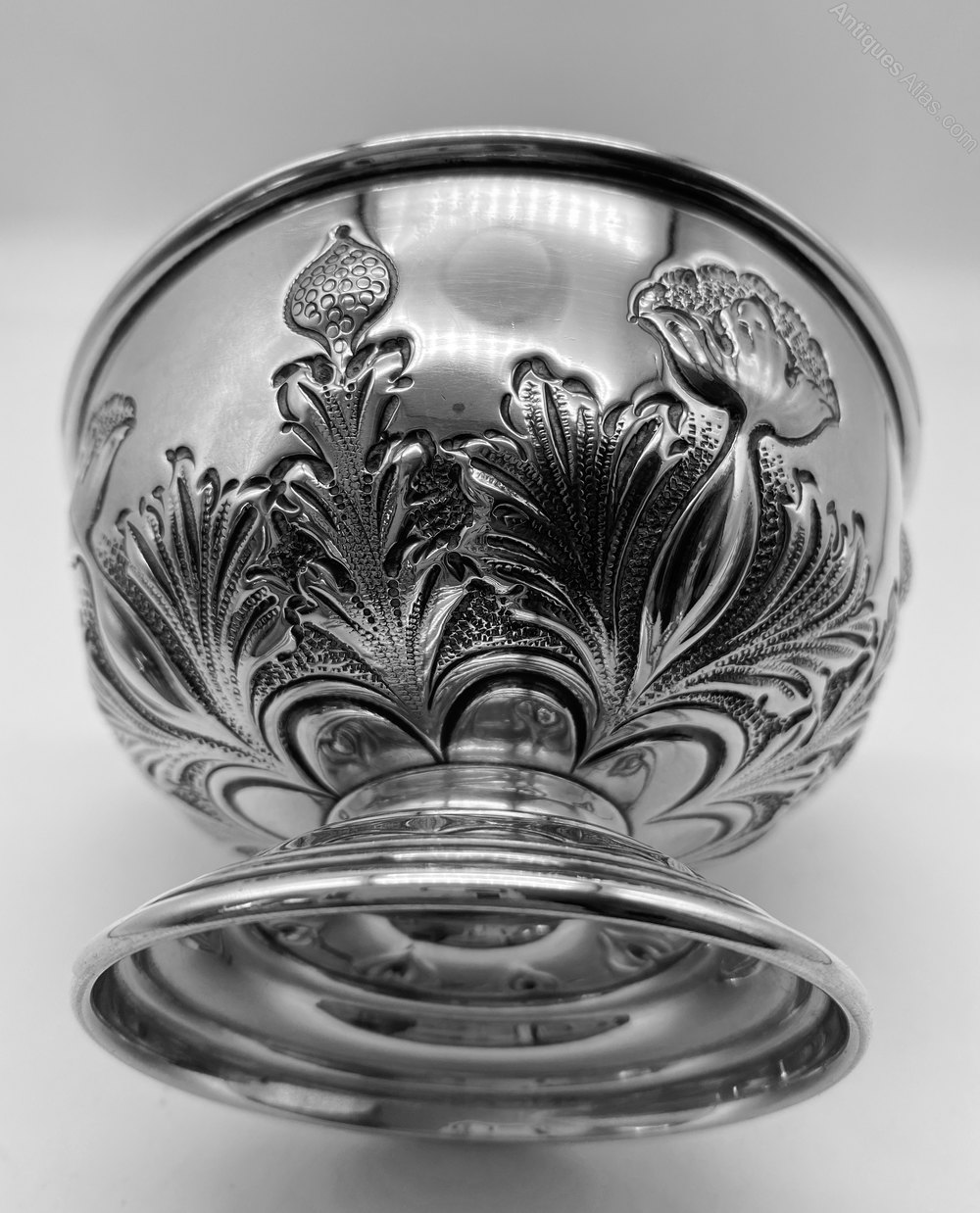 Heavy Gauge Silver Bowl on stepped Pedestal Base.Quality embossed all round and on Pedestal with Leaves and Flowers.Full Hallmarks for Sheffield 1929 by Henry Wigfull.Dimensions:-10.5 x 7 x 7.5cms. Weighs 118 grammes.Excellent condition.