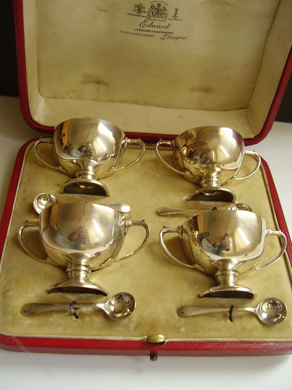 Set of 4 solid silver salts and spoons, original case, the salts assayed 1908 in chester,silversmiths David Herbert Edward & George Edward trading as Edward & Sons,Goldsmiths, silversmiths and jewellers, 92 Buchanan Street Glasgow, the spoons assayed birmingham 1908 silversmith William Aitkin.