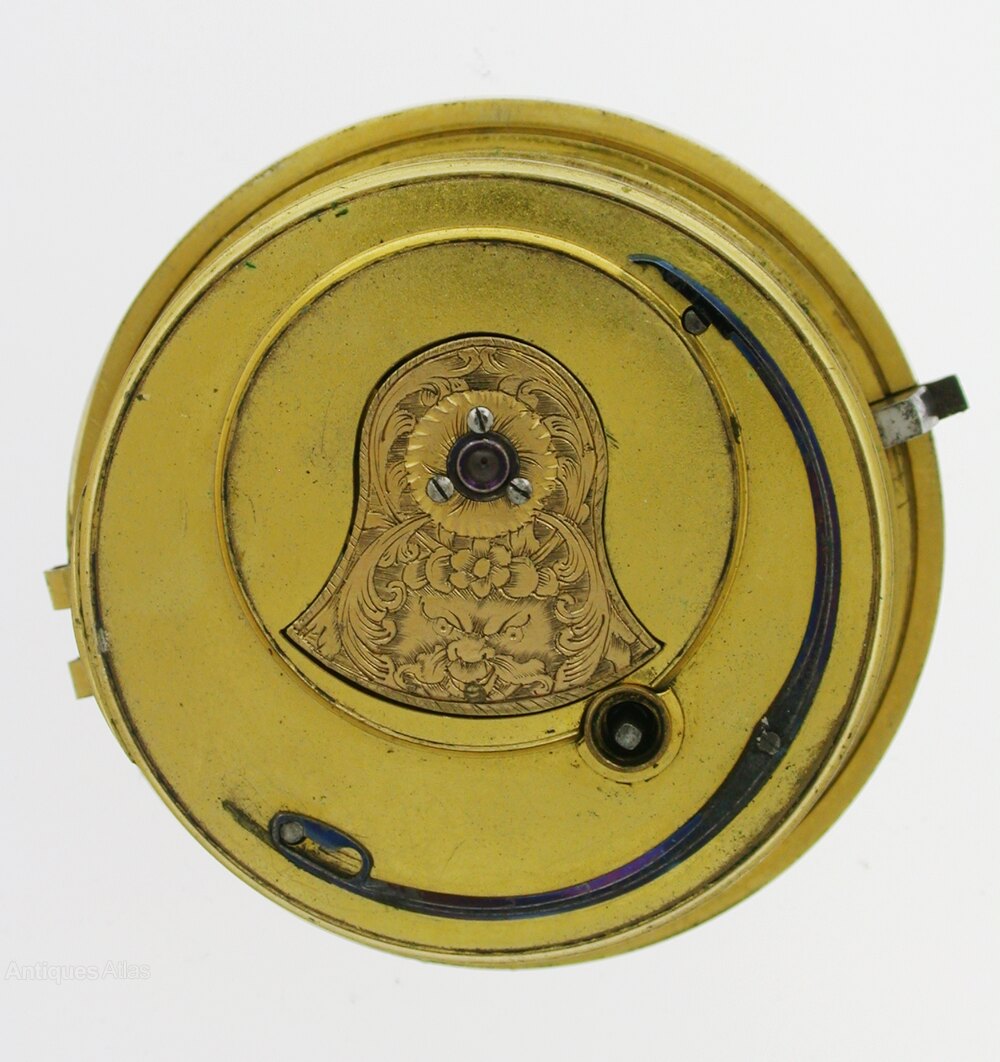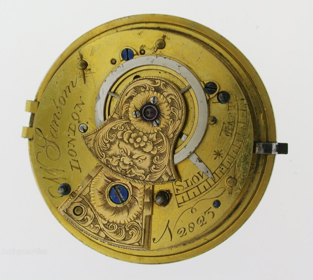 Movement: The silver verge escapement movement is pierced and has a lovely engraved bridge cock. The movement has a regulator and has round cylinder shaped baluster pillars. All around the movement there are nice engravings. The watch is in working order, however we cannot guarantee accuracy for an antique pocket watch. The movement is signed: " M. Samson London N° 2825".