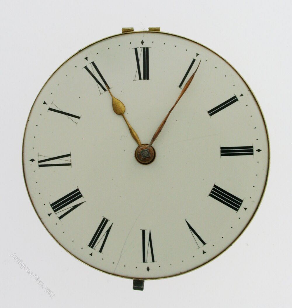 Dial: The white enamel dial has black handwritten Roman numerals and gilt hands. There is a slight hair crack on the dial between the 6 and 7.