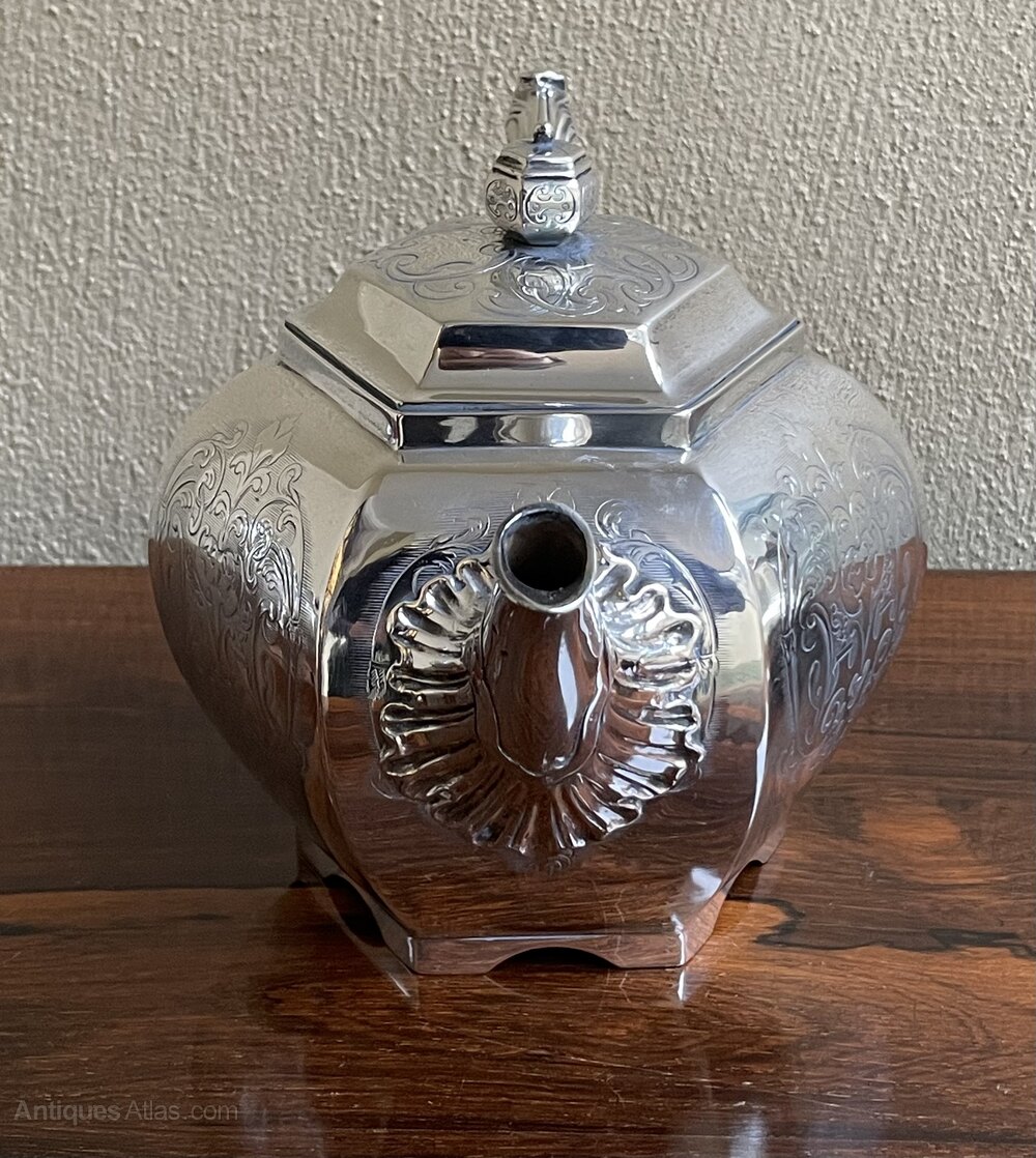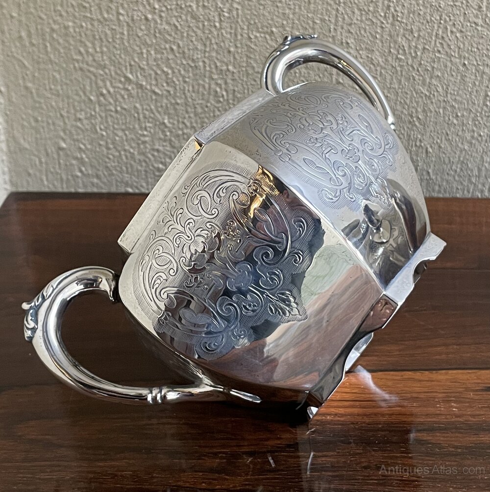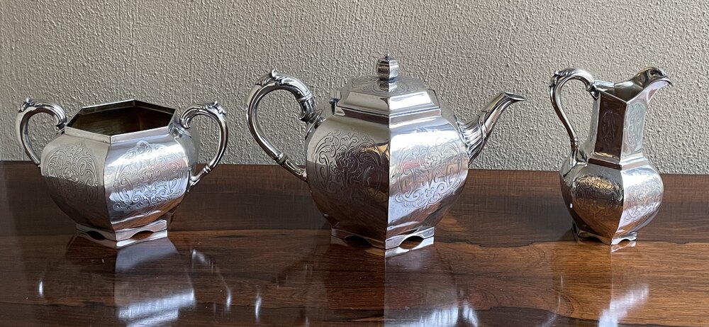 A superb early Victorian solid silver three piece tea set comprising teapot, milk jug and twin handled sugar basin.