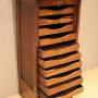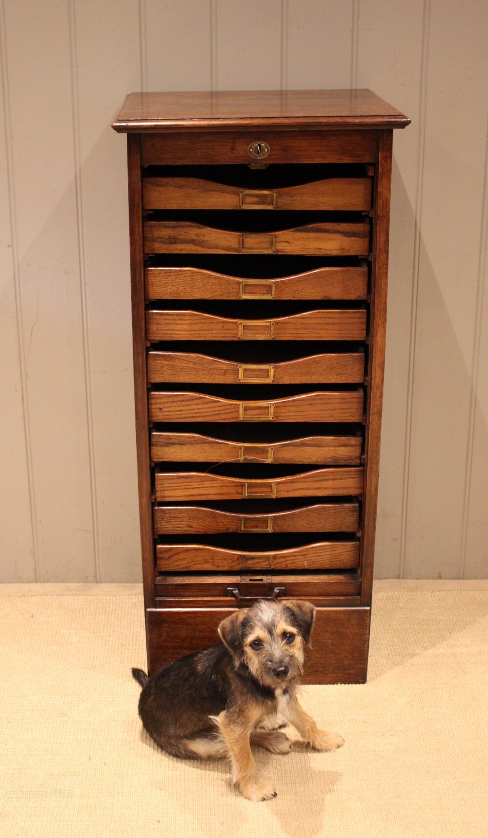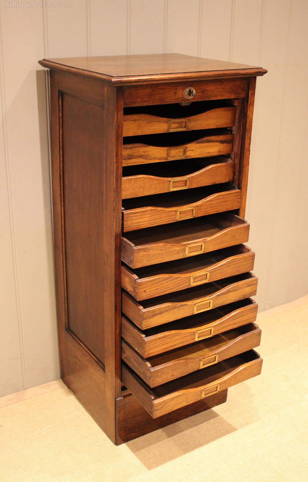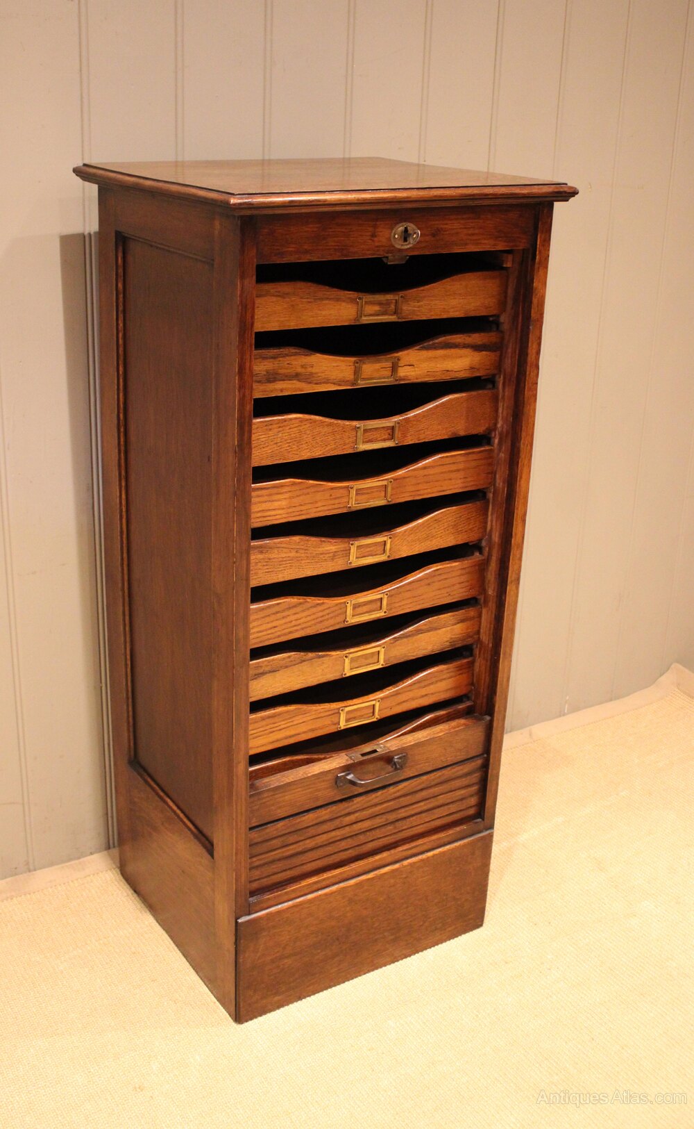 Oak single tambour front filing cabinet having ten slide out drawers having brass label holders , raised on a plinth base . The drawer dimensions are 7 cm high 37.5 cm wide and 29 cm deep