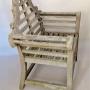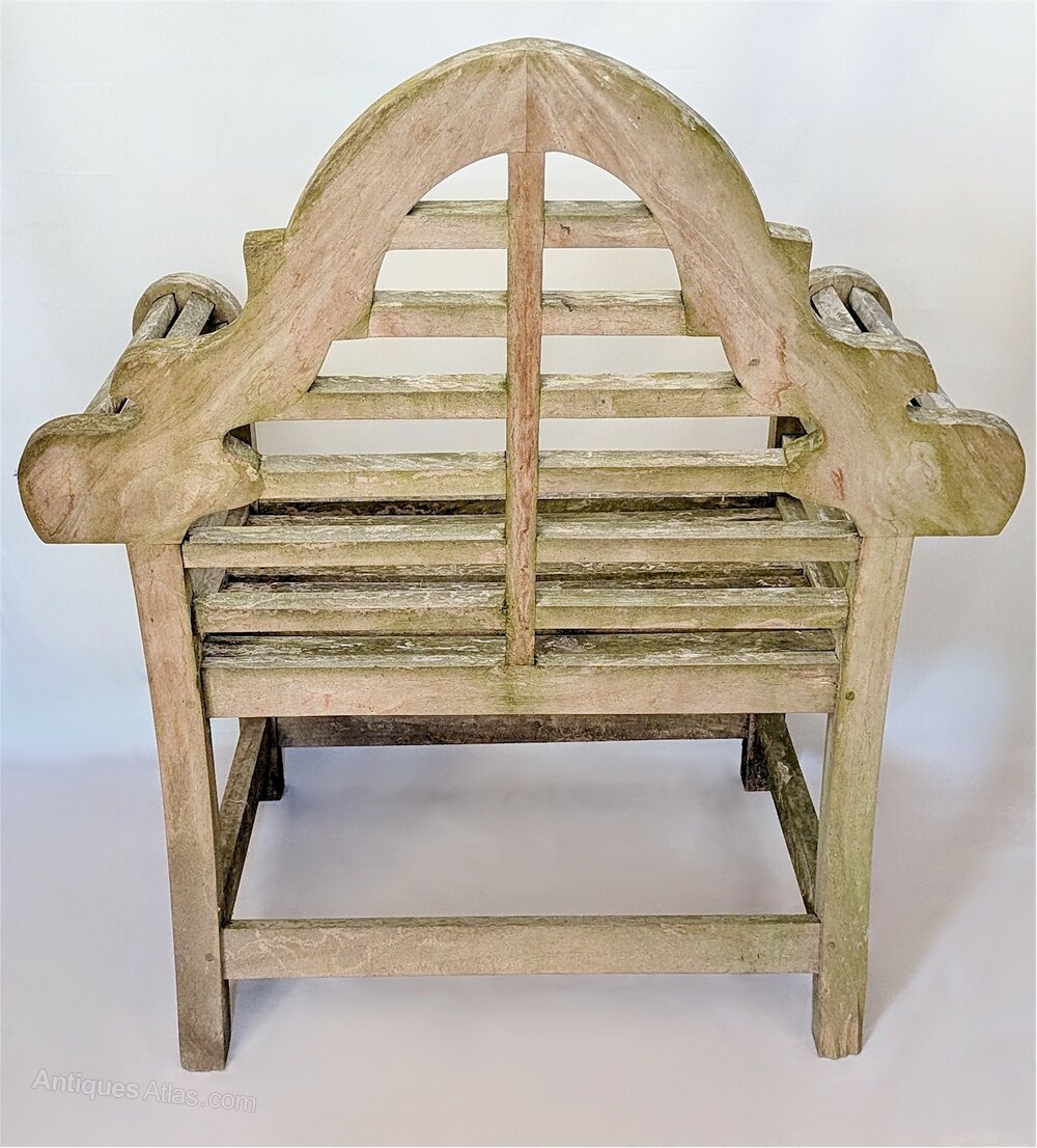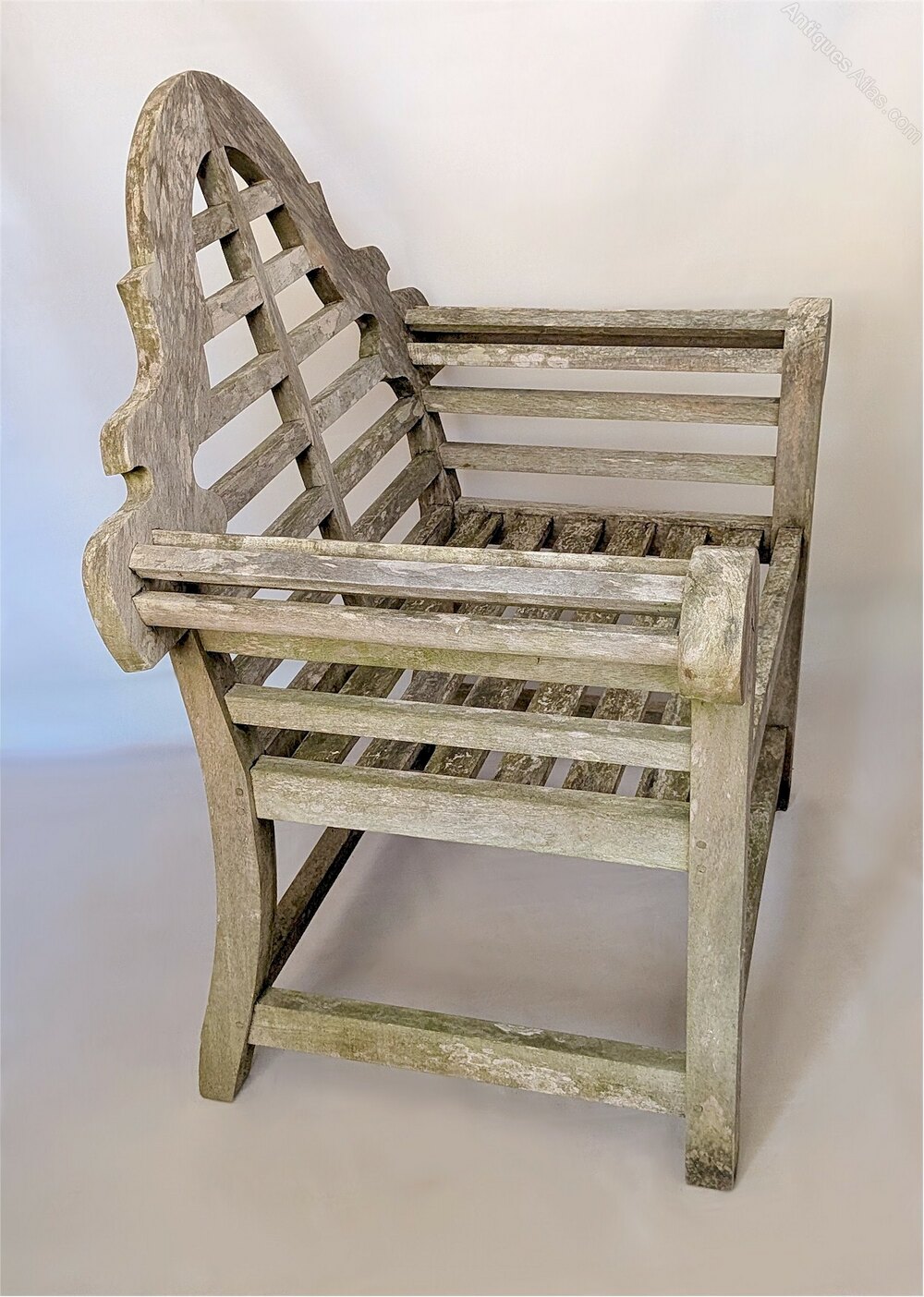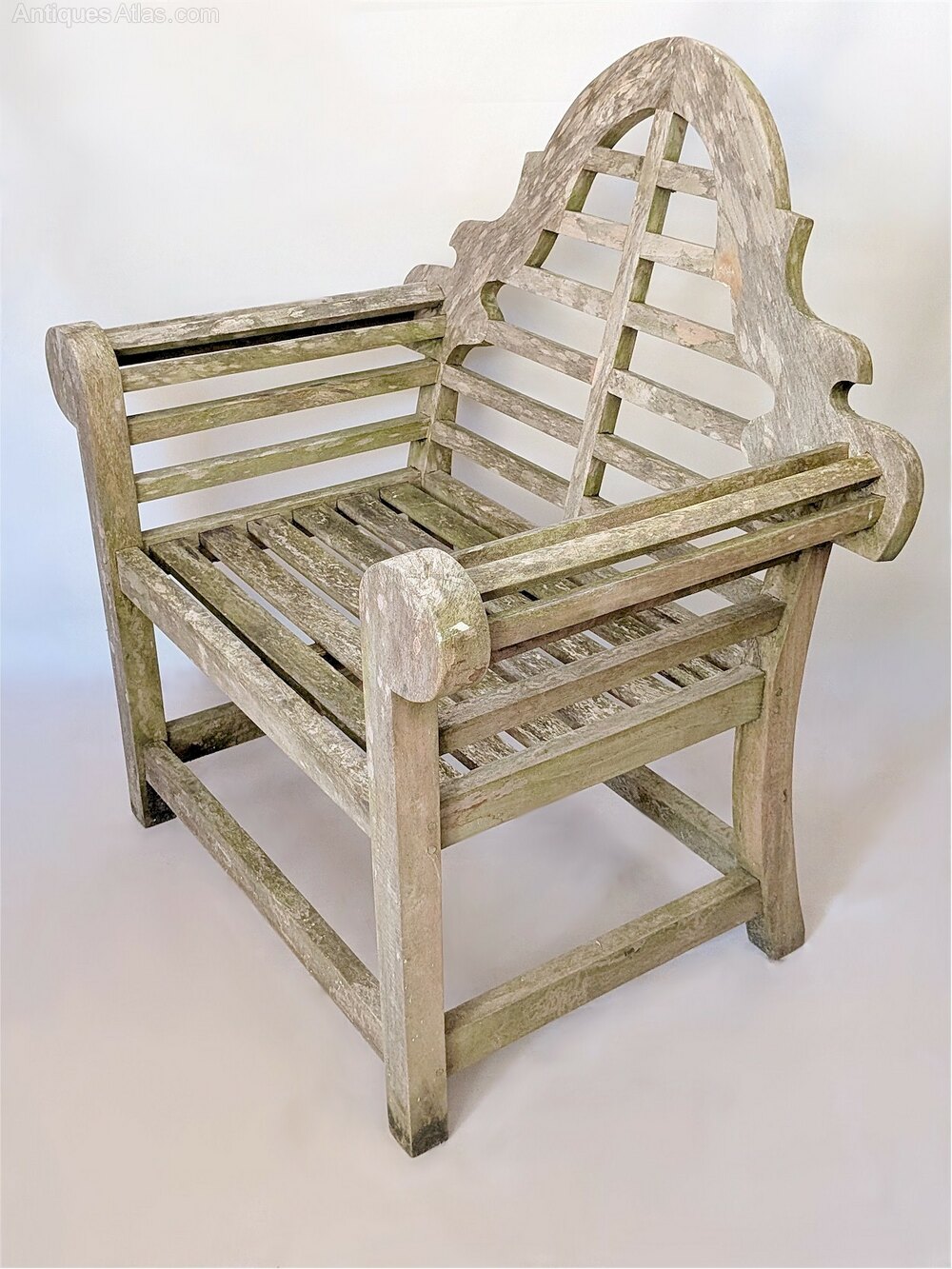 After a design by Sir Edward Lutyens , this single garden chair is made from teak . All the doweled joints are strong and sturdy with no movement and the chair has a pleasant weathered finish .