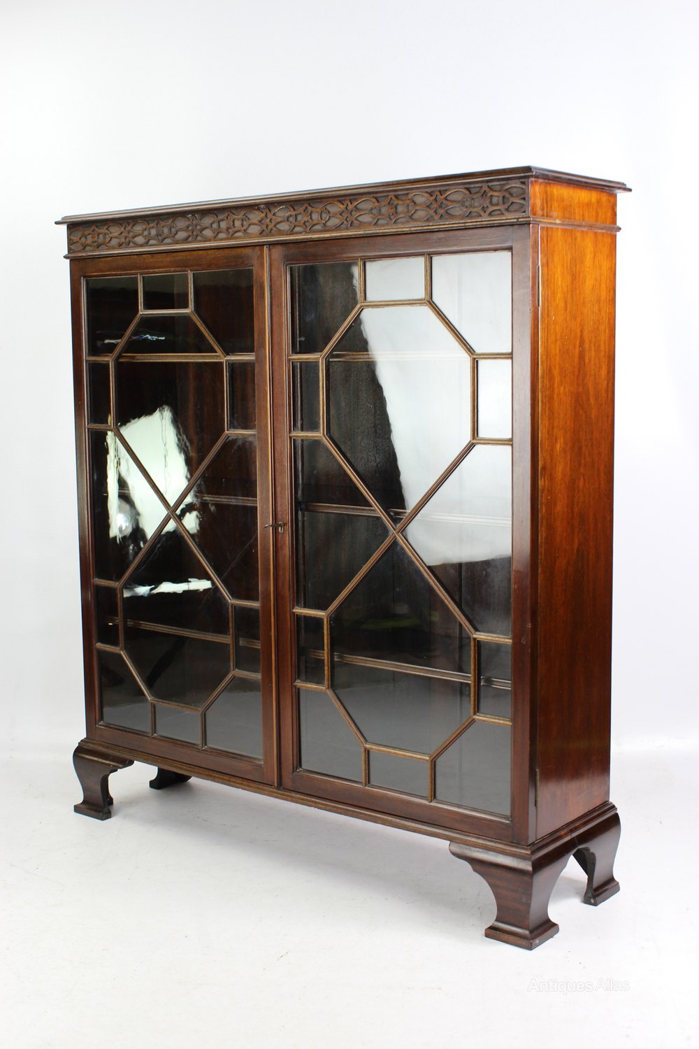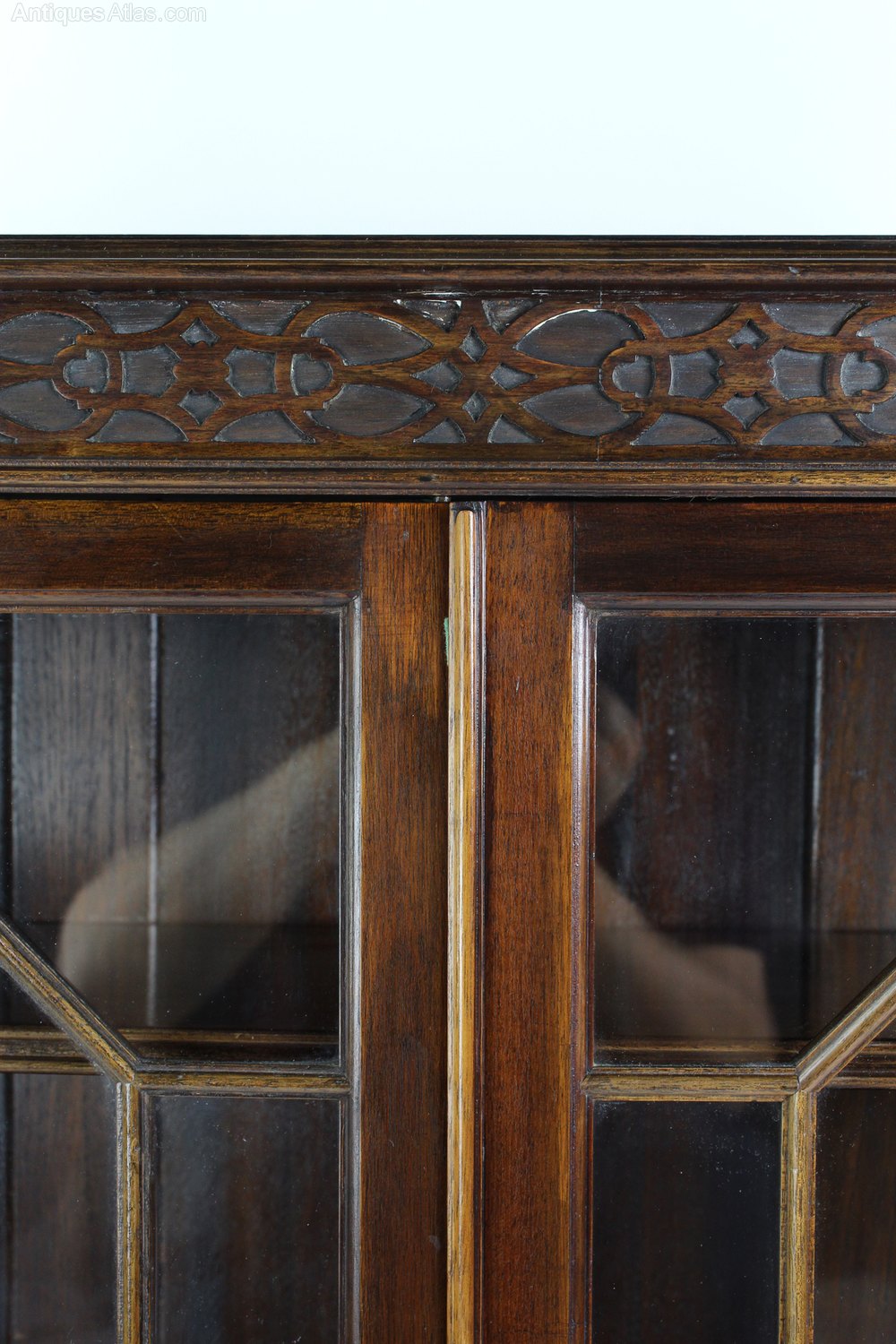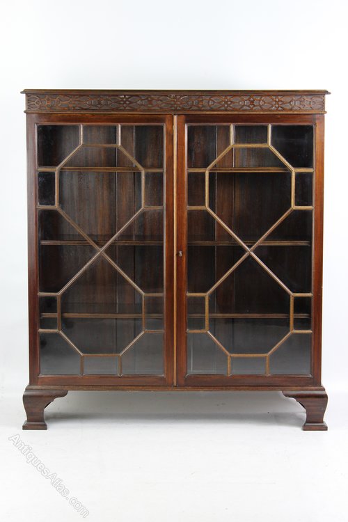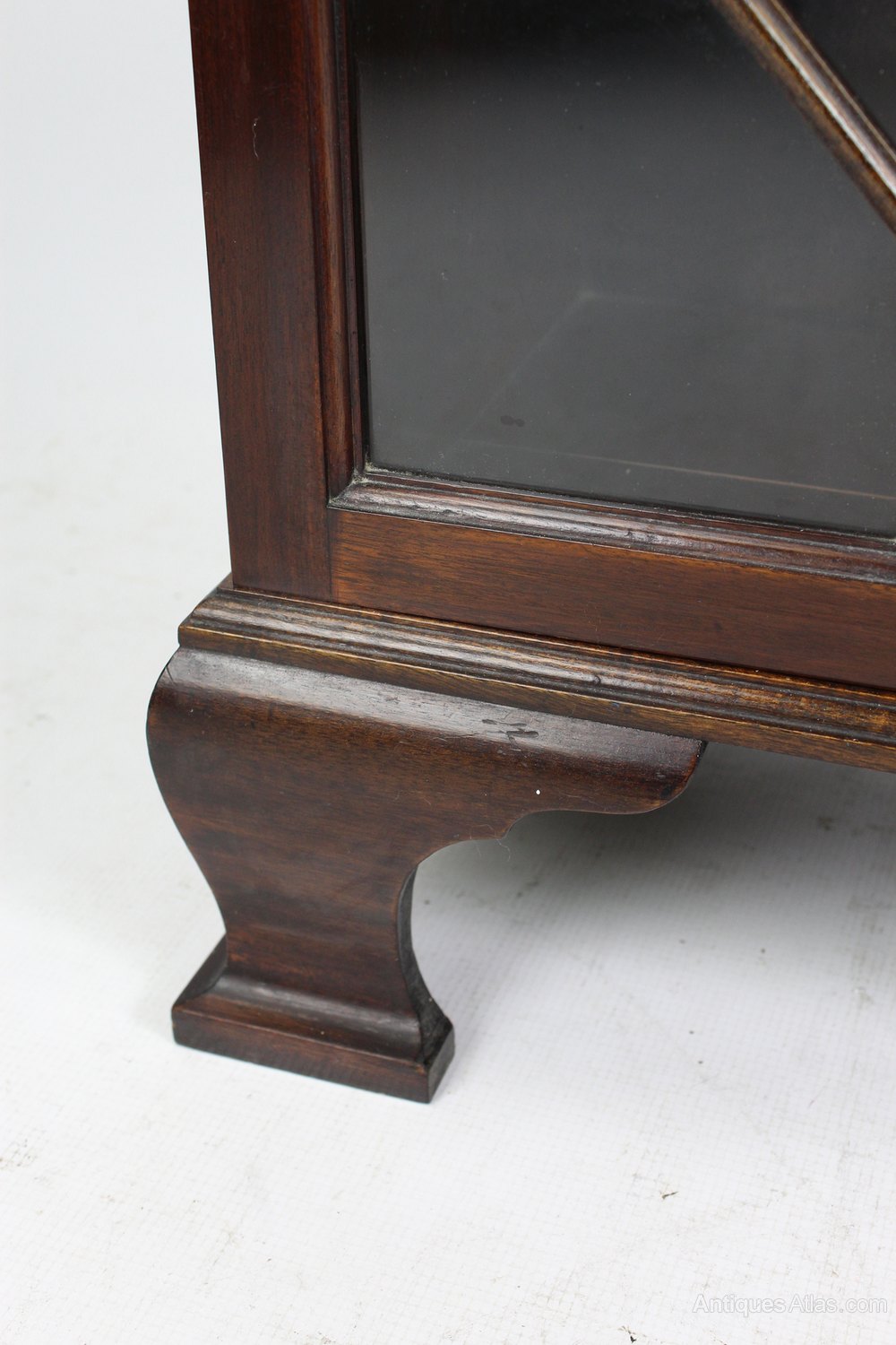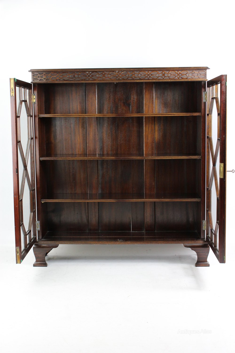 A good quality antique Edwardian mahogany bookcase of slim proportions dating from circa 1910. With twin astragal glazed doors enclosing 3 fully adjustable shelves it stands on ogee bracket feet and has a blind fretwork frieze to the top. The doors lock and it comes with a key. In beautifully figured dark mahogany with good glossy patina. A simple but elegant bookcase that would look stunning in a hall, study or living room.