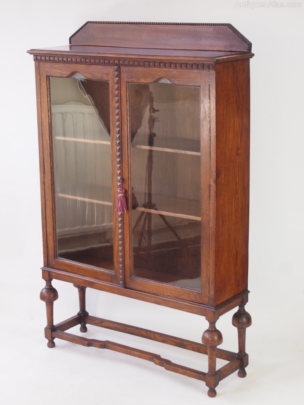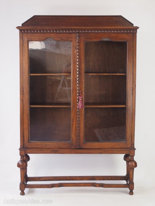 A handsome antique Edwardian solid oak bookcase with glazed doors dating from circa 1910. In a lovely aged oak it has two doors and 3 fully adjustable shelves to the interior and comes with working lock and key. It stands on bulbous turned legs united by cross stretchers to front and back. To the top is a pediment and it has applied carvings to the doors. A good quality and elegant bookcase that would look stunning in a hall, study or living room. Good condition, door slightly warped to bottom.