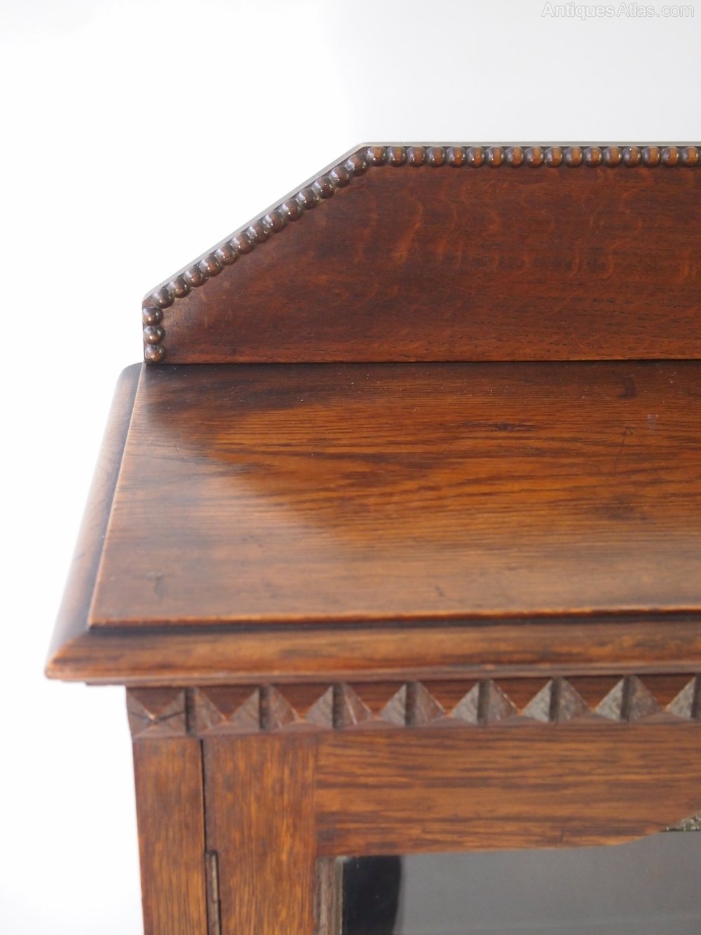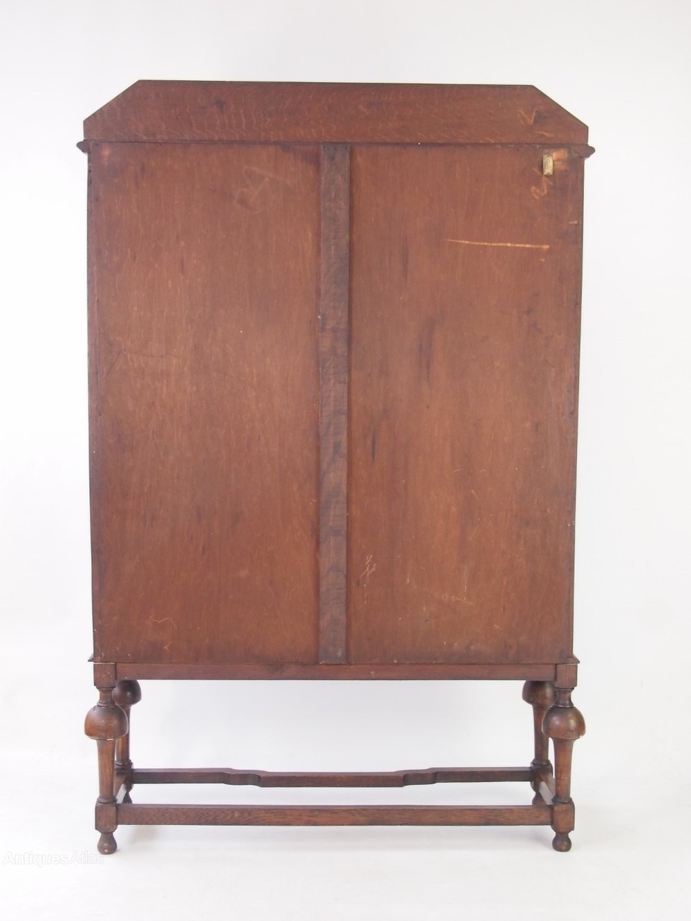 Good condition, warm patina to oak, locks and comes with working key, Door slightly warped to bottom with small gap where two doors meet.