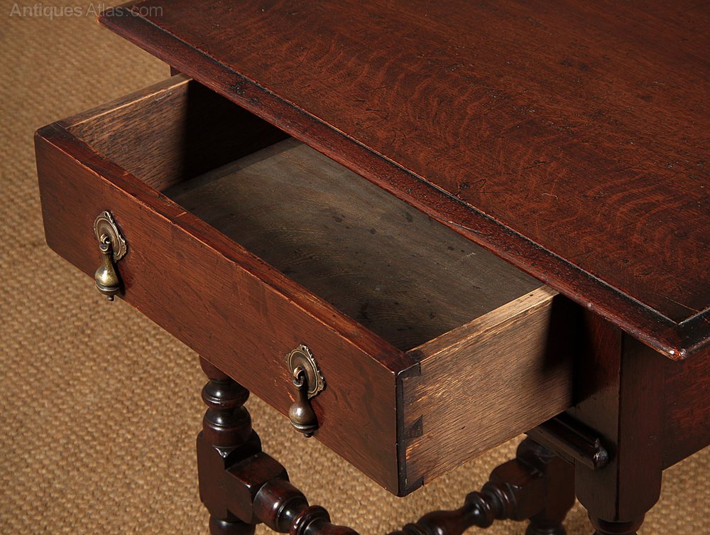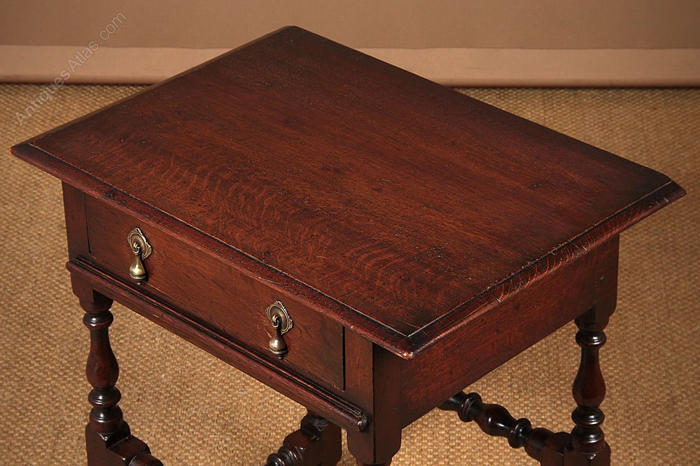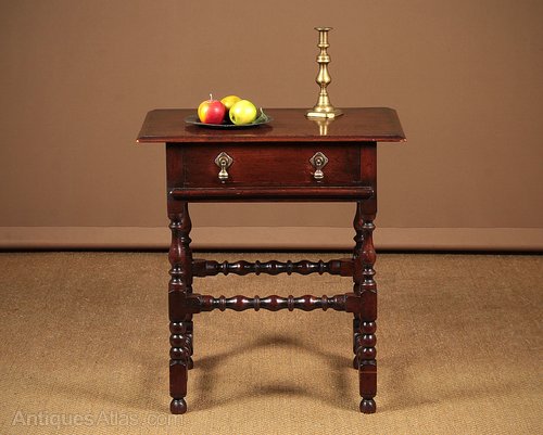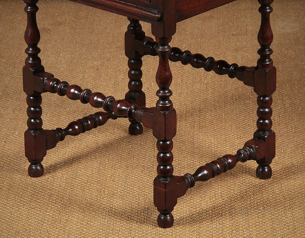 Attractive little 17th.c. style oak lowboy or side table c.1900. Just 27″ wide. Solid oak throughout. Table top with a moulded edge to the front and sides, over a single oak lined drawer with brass drop handles. Raised on turned and block stiles joined with lovely turned stretchers to each side. Excellent colour and condition, cleaned and waxed in our workshops. Dimensions: width 27″, depth 19″, height 29″.