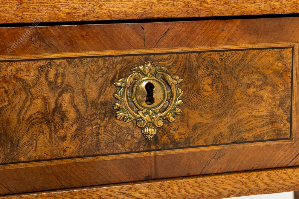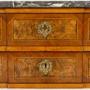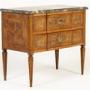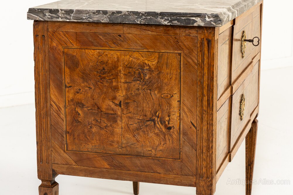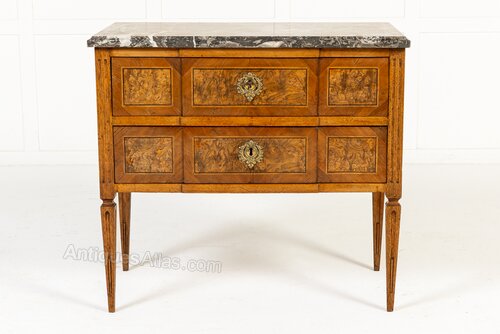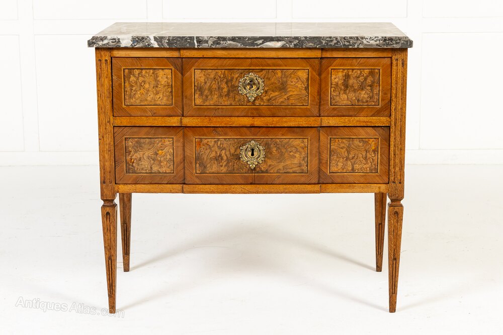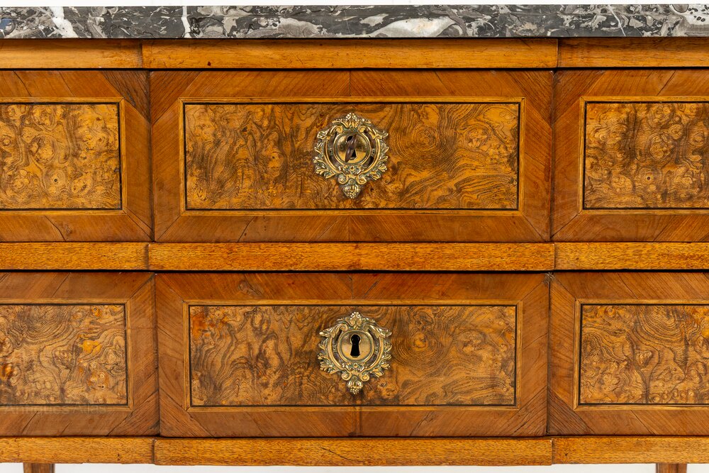 This lovely Louis XVI period commode is of rectangular form with a subtle breakfront shape to the drawer fronts, the centres set forward very slightly. The drawer fronts are quartered veneered in straight grained walnut, laid geometrically, with strung panels of highly figured burr walnut to the centres. The grey and white veined marble top has a moulded edge. The sides of the piece are inlaid with bookmatched burr walnut panels in the centres and the commode stands on tapering square sectioned legs.