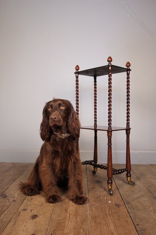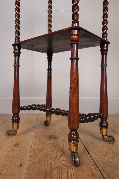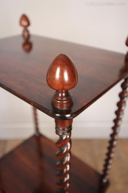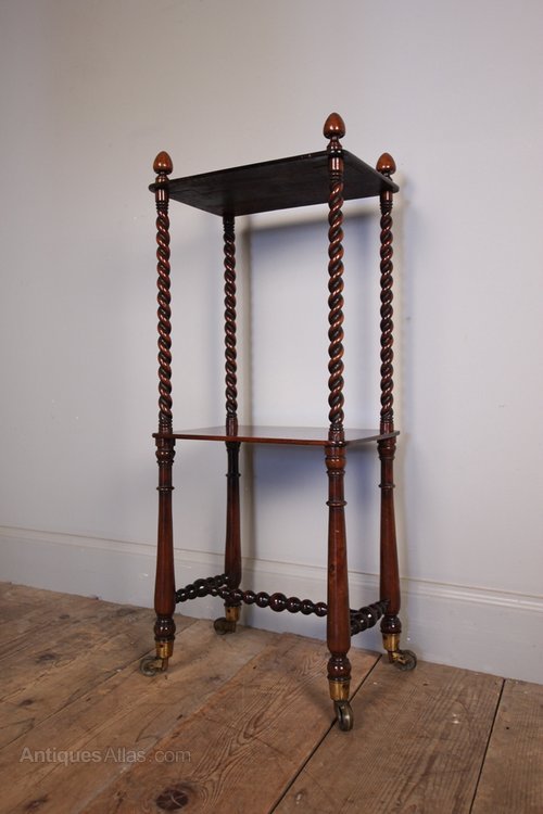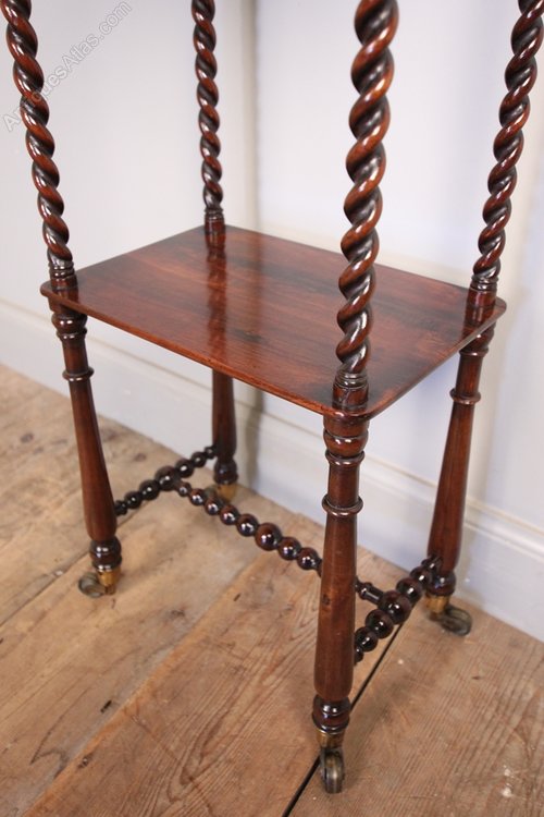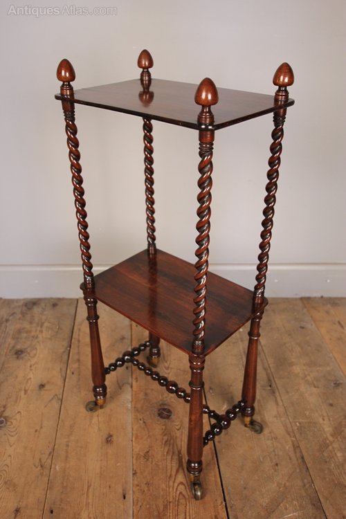 A small and perfectly formed Rosewood Whatnot, having 2 tiers adjoined by twisted supports and 'H' stretcher with acorn finials. Super colour and lustre to this versatile and firm standing little whatnot. English, Circa 1860