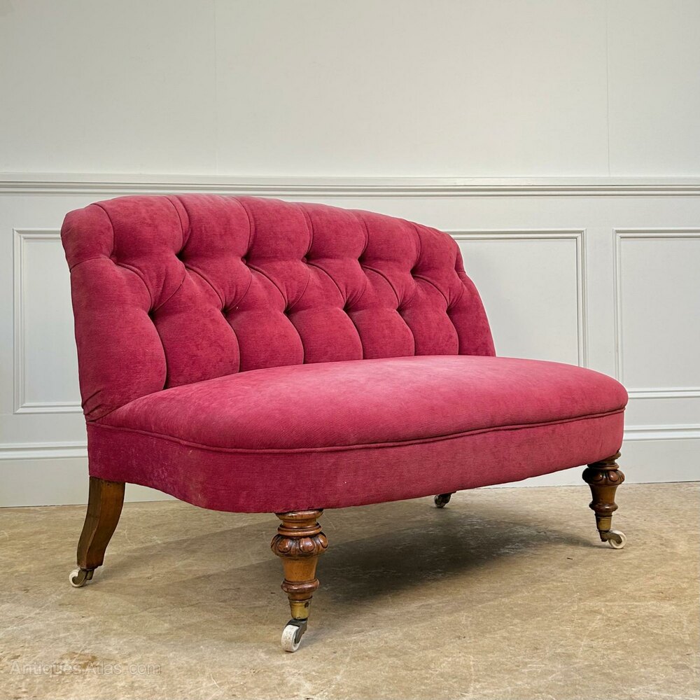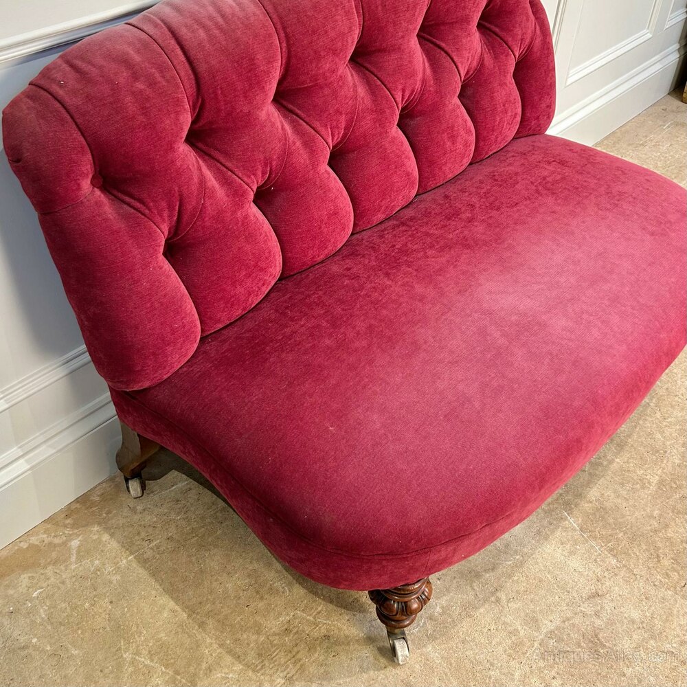 A 19th century banquette sofa of small proportions. Having a buttoned back and a sprung seat. The whole riased on carved tapering walnut legs with the original brass and porcelain castors. Super original condition and ready for re-upholstery. English, Circa 1860.