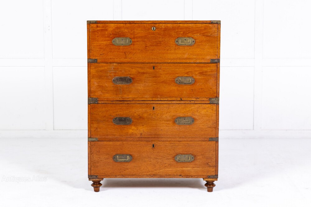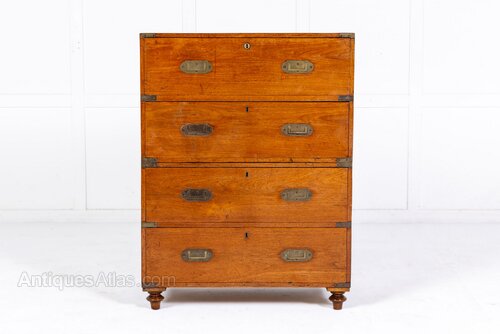 Made in two pieces so as to be easy to transport, chests of this sort are frequently referred to as "campaign chests" due to their popularity with military officers who took them on campaign and used them in their tents. Chests of this sort were also very popular on board ships in officers' cabins and the use of teak might suggest a Colonial origin - perhaps Anglo-Indian or Anglo-Chinese. The recessed handles are of a typical pattern - designed to be space saving in cramped tents or cabins. The secretaire drawer is particularly nicely finished, the pigeon holes having nicely shaped mouldings to the top recalling Mughal architecture and again perhaps suggesting an Anglo-Indian origin.