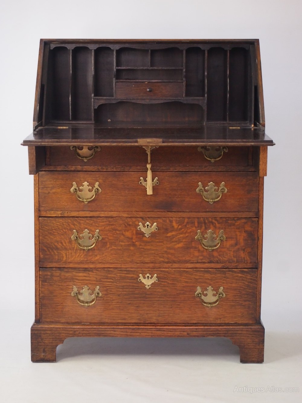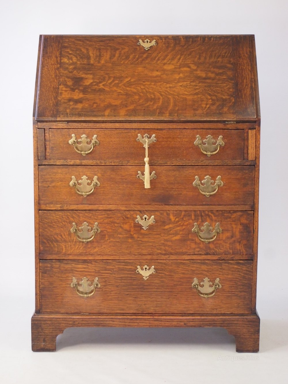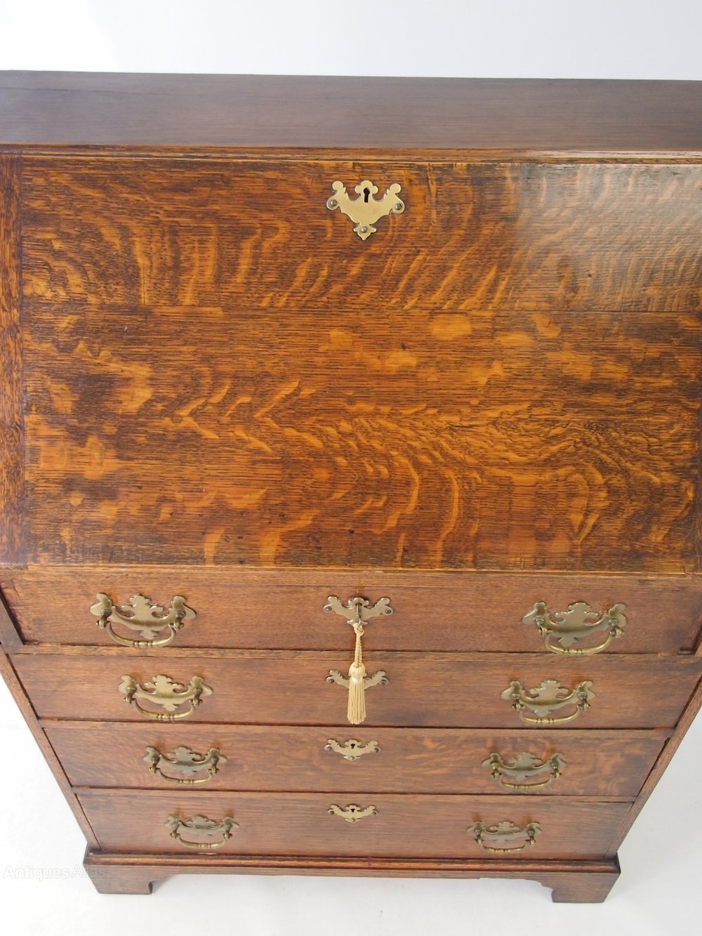 A handsome small antique Edwardian oak bureau in a Georgian revival design. With superb colour and beautifully figured solid oak, it has 4 single drawers with original brass handles and escutcheons and stands on bracket feet. The fall front drops down on brass arms to reveal pigeon holes and a small drawer to the interior. A really good quality bureau, in good condition with beautifully figured oak with good colour and original warm patina. Dating from circa 1910.