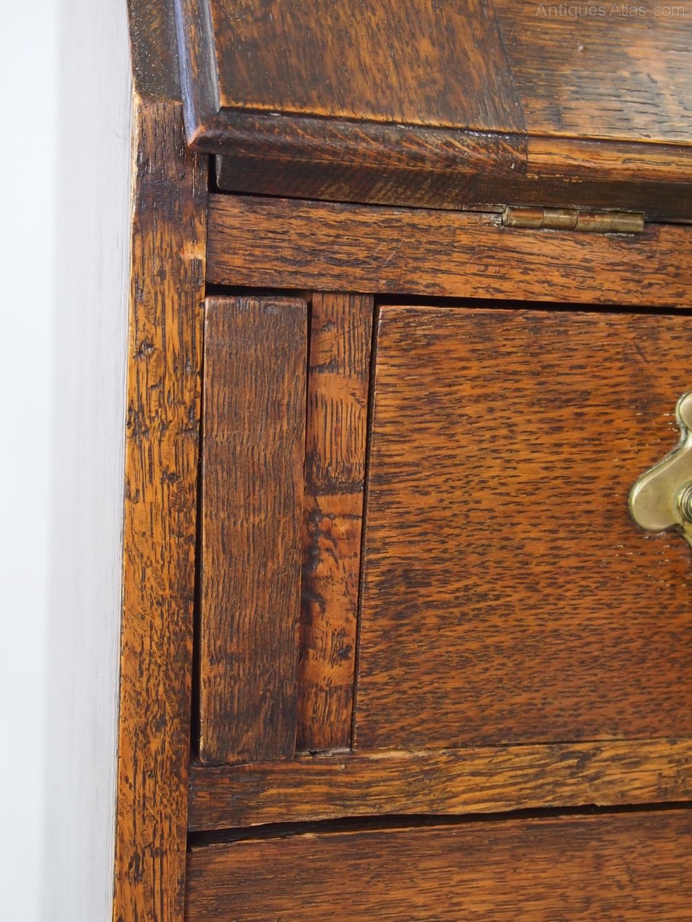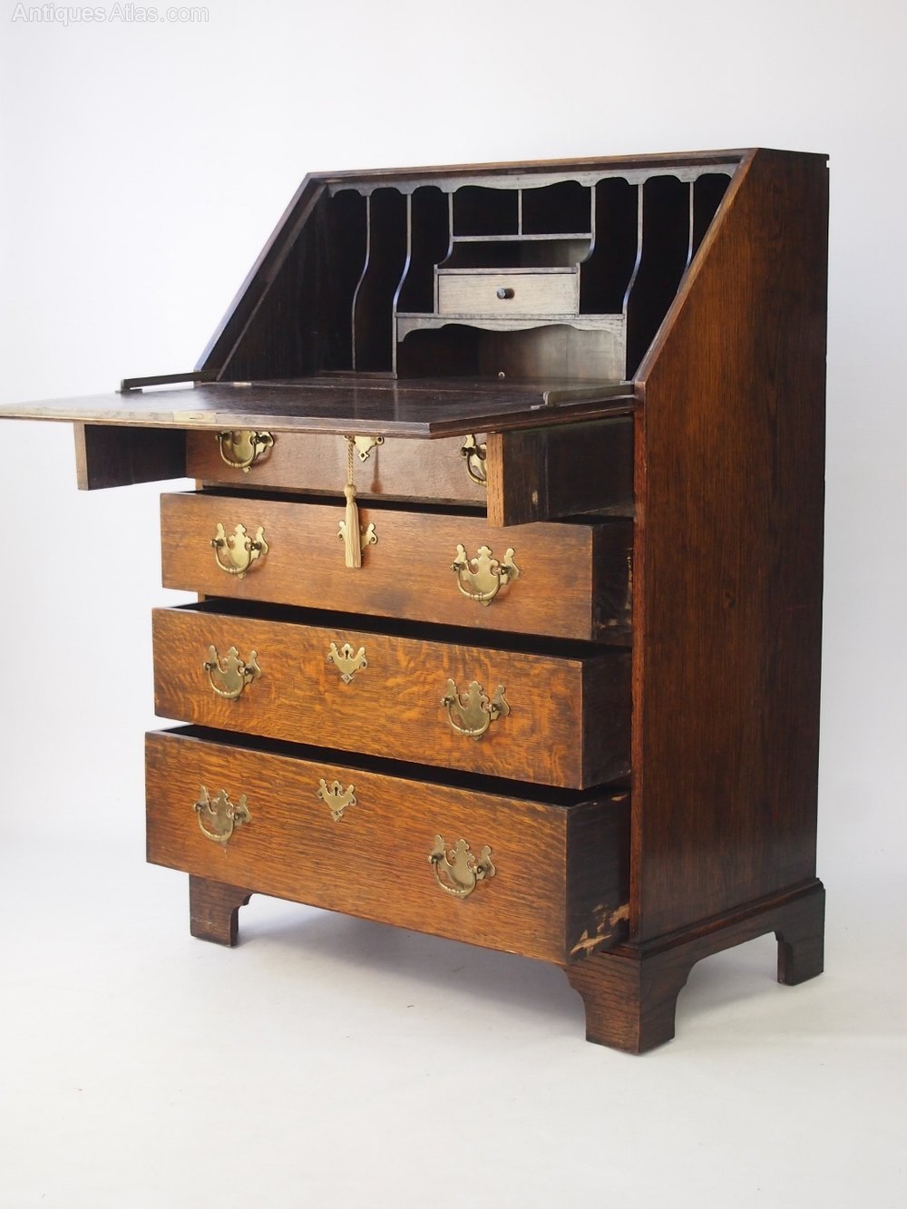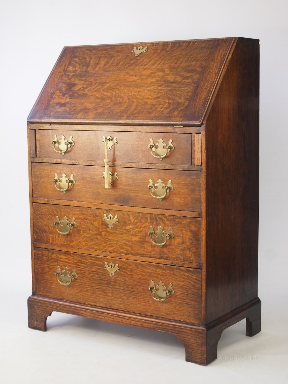 A handsome small antique Edwardian oak bureau in a Georgian revival design. With superb colour and beautifully figured solid oak, it has 4 single drawers with original brass handles and escutcheons and stands on bracket feet. The fall front drops down on brass arms to reveal pigeon holes and a small drawer to the interior. A really good quality bureau, in good condition with beautifully figured oak with good colour and original warm patina. Dating from circa 1910.