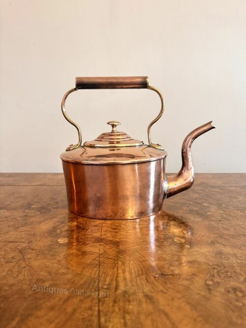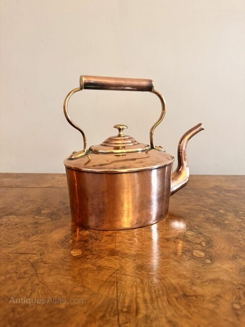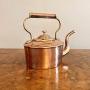 Small antique George III quality copper kettle, having a quality copper kettle with a removable lid with the original brass knob, having a shaped handle to the back and a shaped spout.