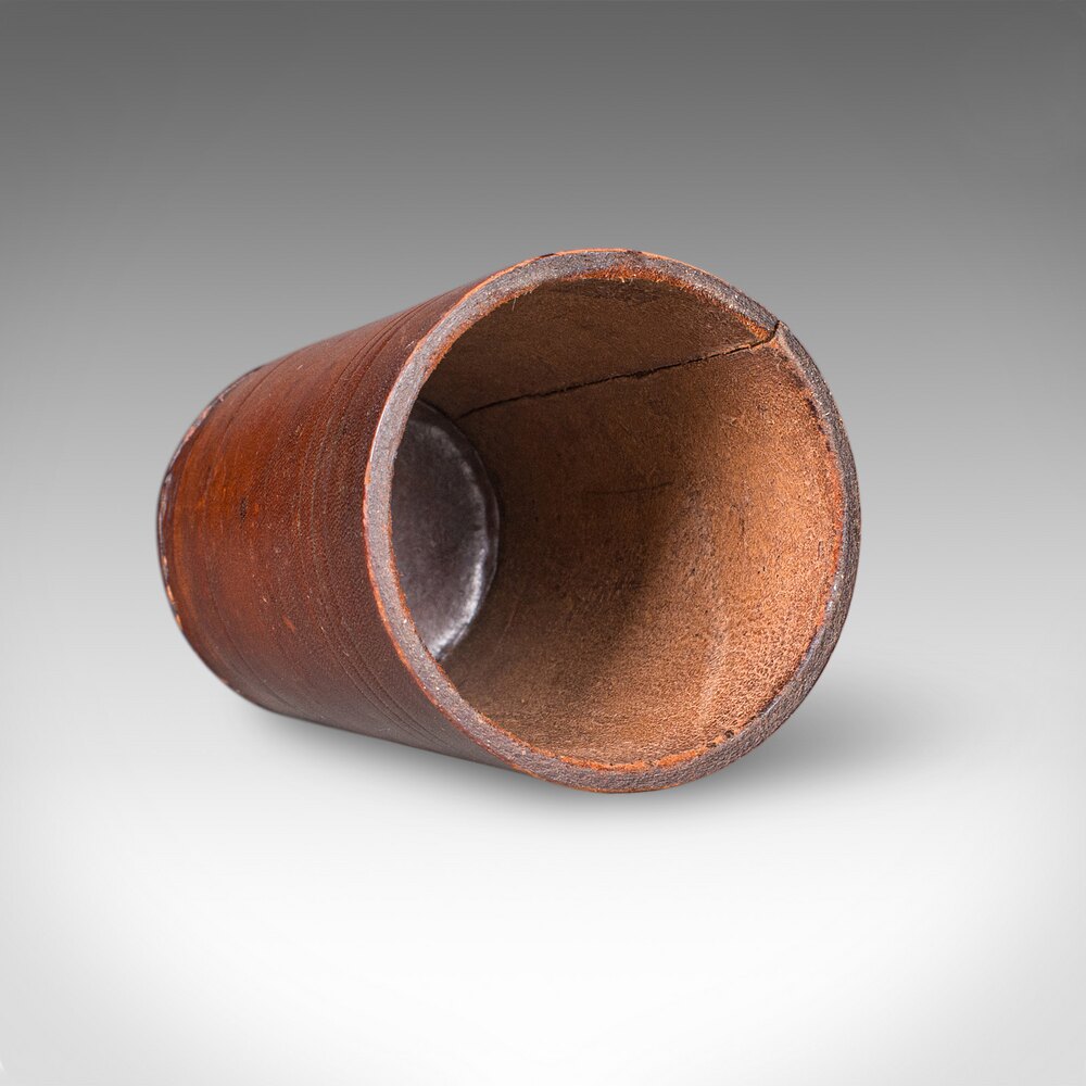 This is a small antique Jacquet dice pot. A French, leather craps or gaming tumbler, dating to the early 20th century, circa 1920. A tactile and characterful dice cup, offering refined charm for collectors of gaming antiques and leisure accessories.