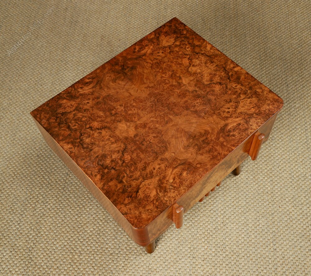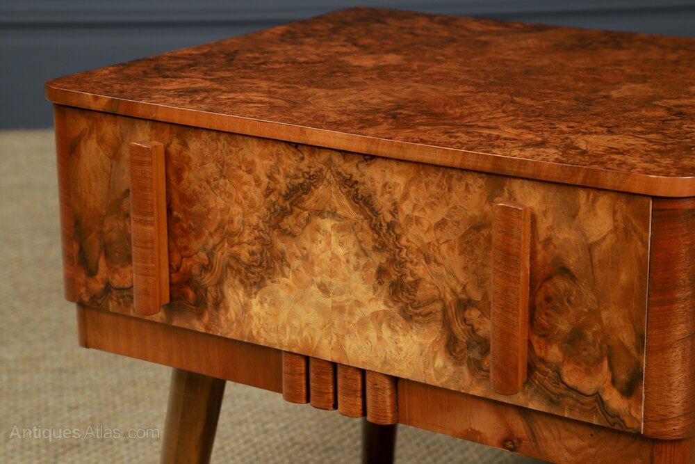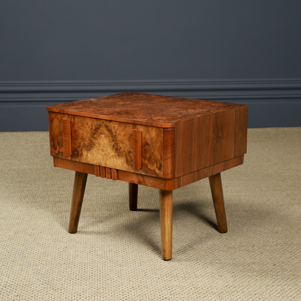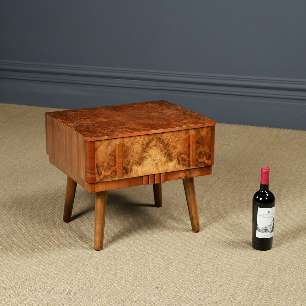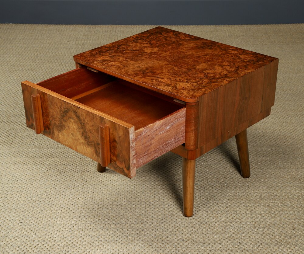 Condition This is a good quality English small Art Deco table, ideal for use as a small bedside or lamp table, featuring a single drawer, constructed from lovely burr walnut timbers, circa 1930, with later adapted legs, in excellent condition. This small Art Deco occasional table has been cleaned and French polished by hand, to a professional standard in our workshop. Nominal old use marks to the leading edges and inside drawer bottom, but nothing significant considering the age of them. The table has been adapted from an Art Deco dressing table, with the legs being later additions. The legs are sturdy and are free from any breaks. The drawer is free-running and closes flush to the frame. The drawer retains the original Bakelite handle. This small Art Deco table is well constructed, solid in joint and ready to use.