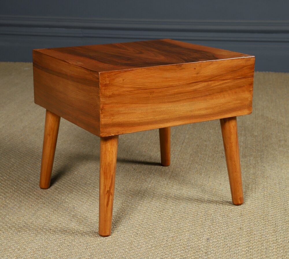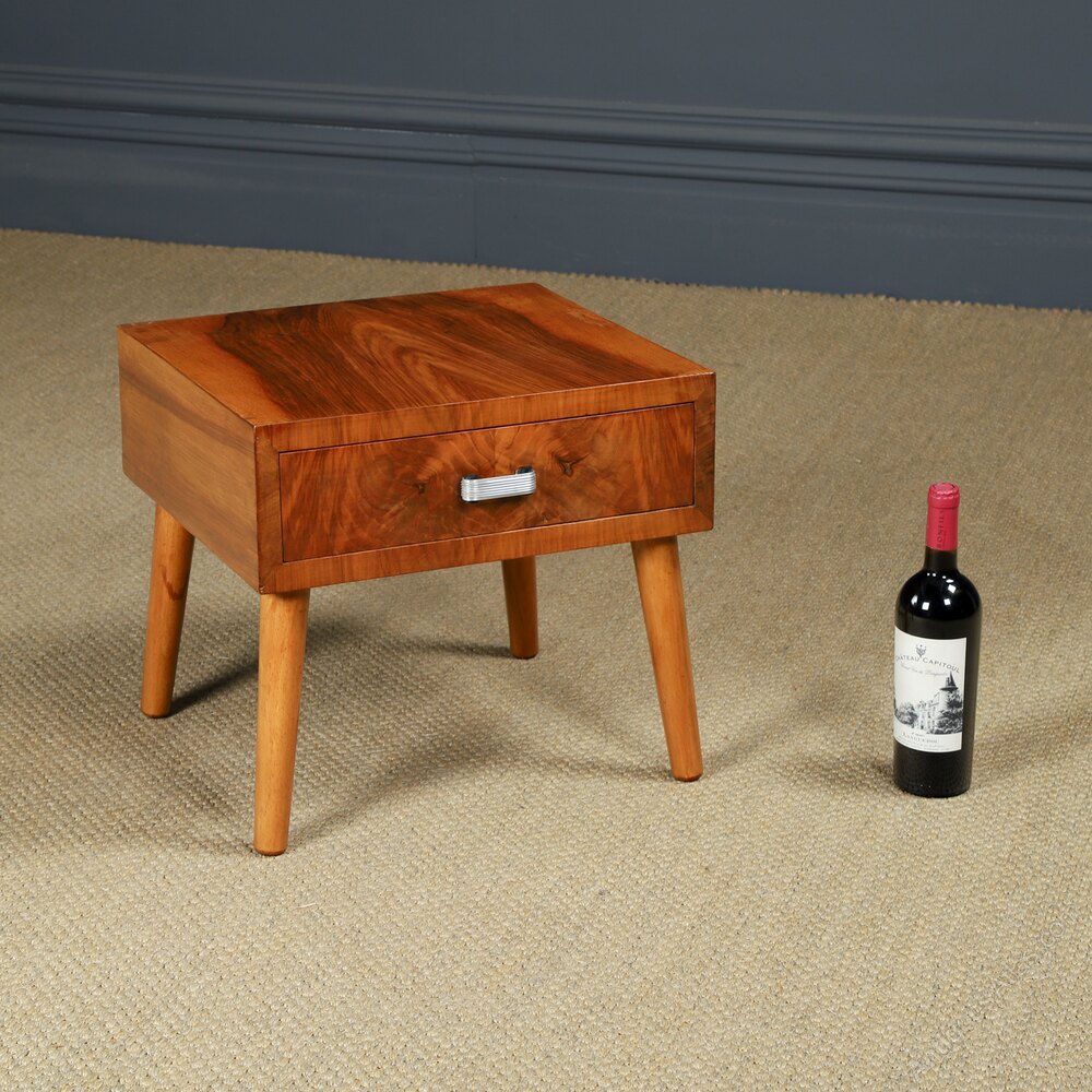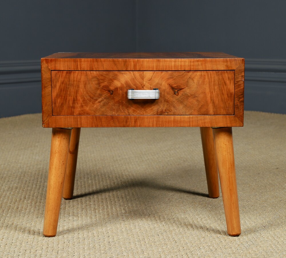 Condition This is a good quality English small Art Deco side table, ideal for use as a small bedside or lamp table, featuring a single drawer, constructed from lovely burr walnut timbers, circa 1930, with later adapted legs, in excellent condition. This small Art Deco occasional table has been cleaned and French polished by hand, to a professional standard in our workshop. Nominal old use marks to the leading edges and inside drawer bottom, but nothing significant considering the age of them. The table has been adapted from an Art Deco dressing table, with the legs being later additions. The legs are sturdy and are free from any breaks. The drawer is free-running and closes flush to the frame. The drawer retains the original Bakelite handle. This small Art Deco side table is well constructed, solid in joint and ready to use.