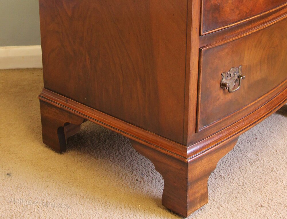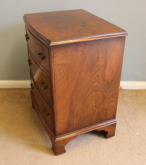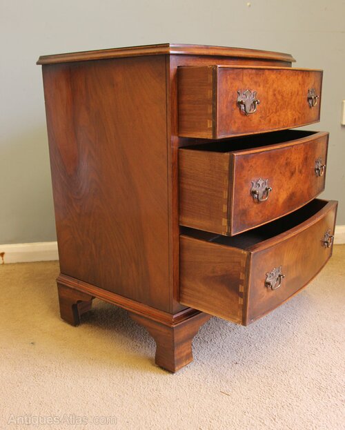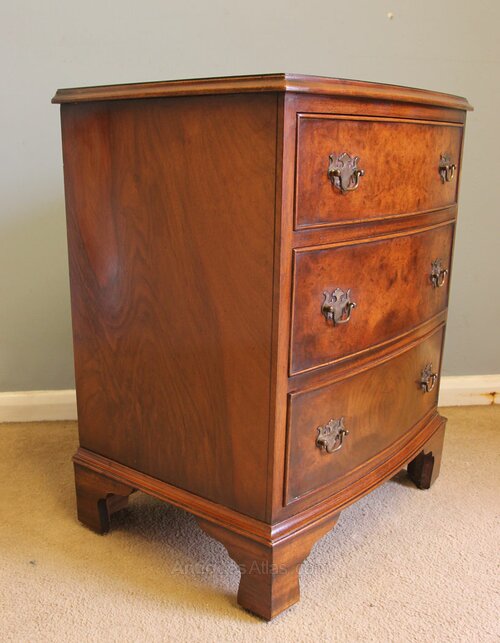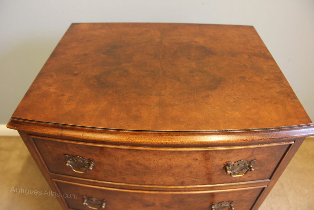 Antique Walnut Bedside Chest of Drawers, This lovely burr walnut bowfront small chest of drawers has a burr walnut top with moulded edge under having three graduated drawers with lovely burr walnut drawer fronts all standing on short bracket style feet.