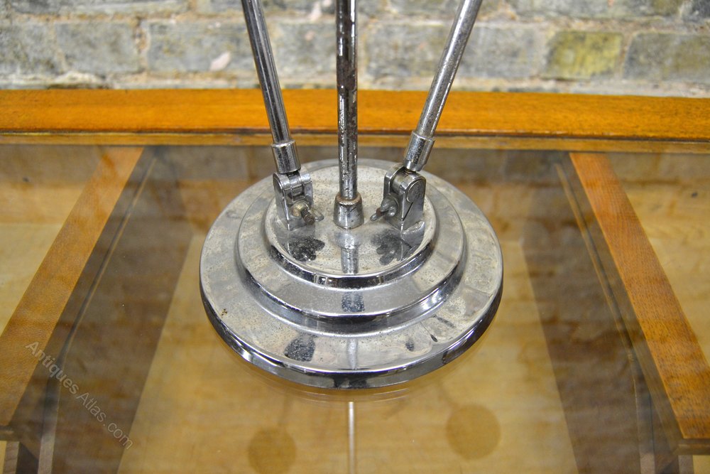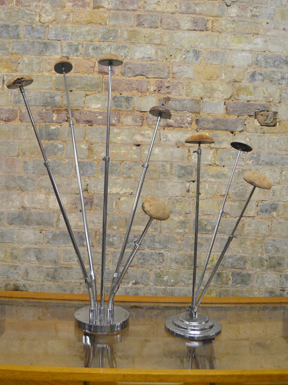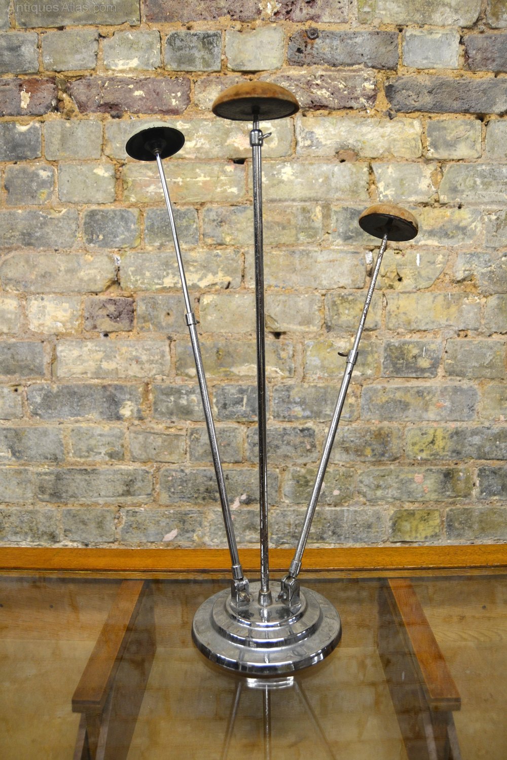 This is an original 1930s Art Deco chrome hatstand with three fully adjustable arms. The tops are covered with fabric. This is a fabulous rare display item ready for a new shop.