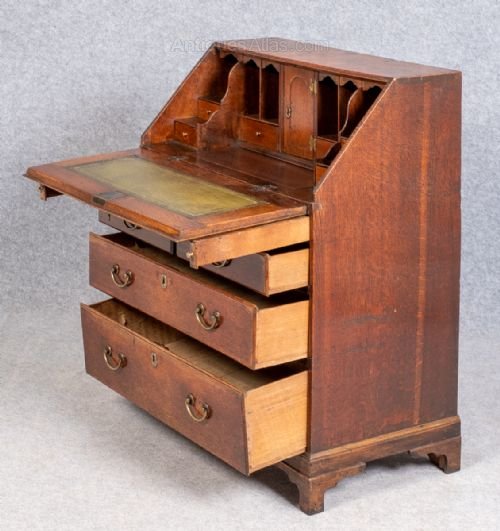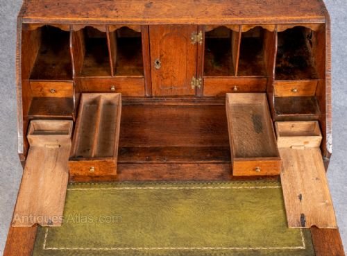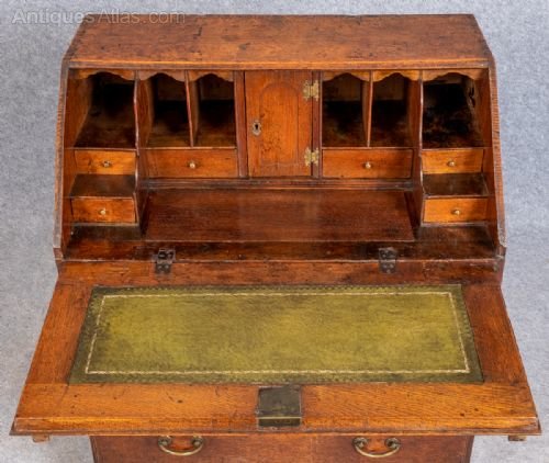 A small early 18th.Century oak bureau The sloping fall having an original shaped brass escutcheon with working lock and opens to reveal a stepped interior, 6 drawers, small cupboard and 6 pigeon holes. There are 2 secret drawers and a well which can be seen in the photos and the fall has a green and tooled leather writing surface. The bureau has 2 short over 2 long drawers all lined with 18thC written paper and retaining their original brass handles and escutcheons, the whole standing on offset bracket feet. Dimensions:- Height…39’’/ 99cm. Width…31’’/78.5cm. Depth…18.5’’/ 47cm. Delivery to most of U.K. mainland £50.