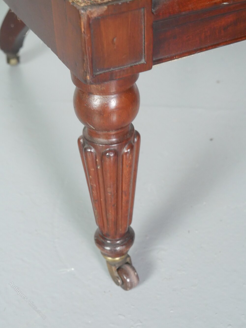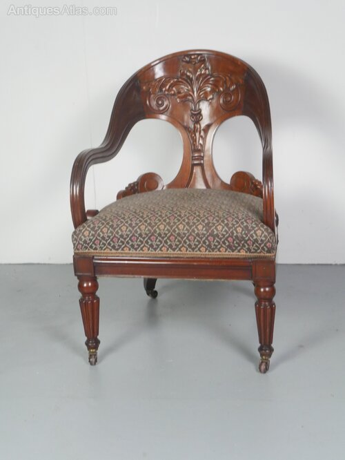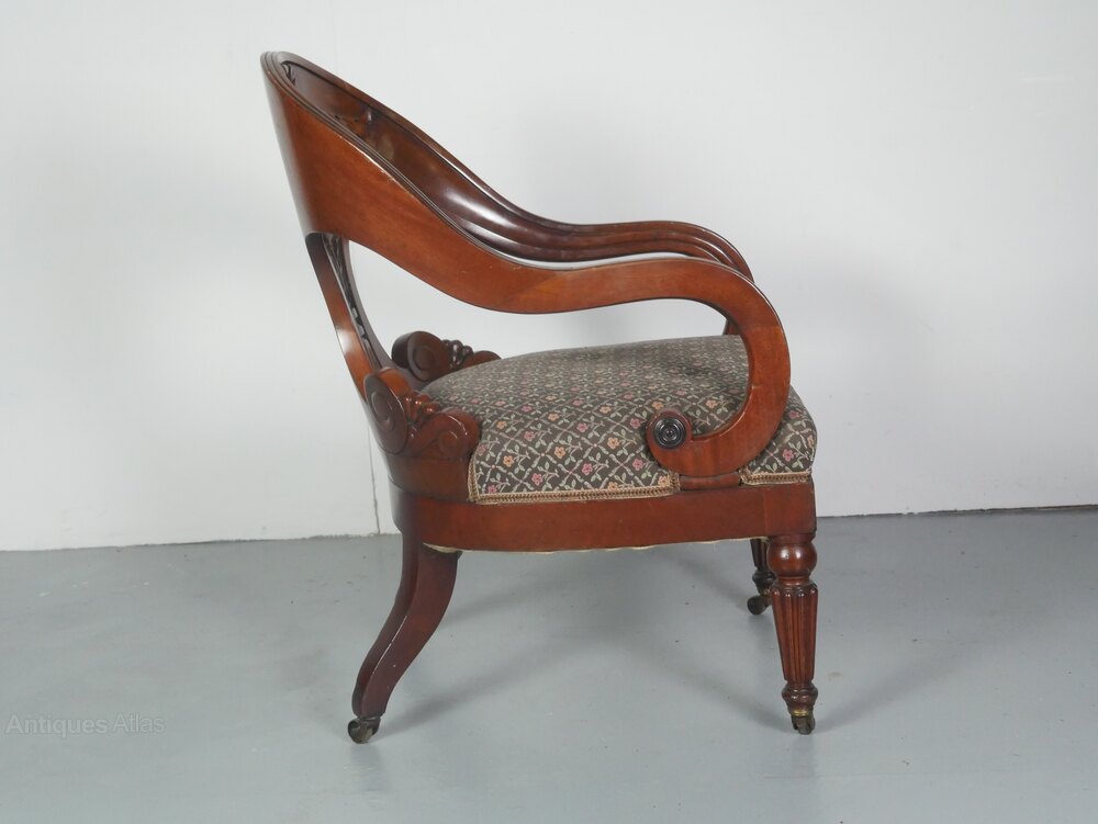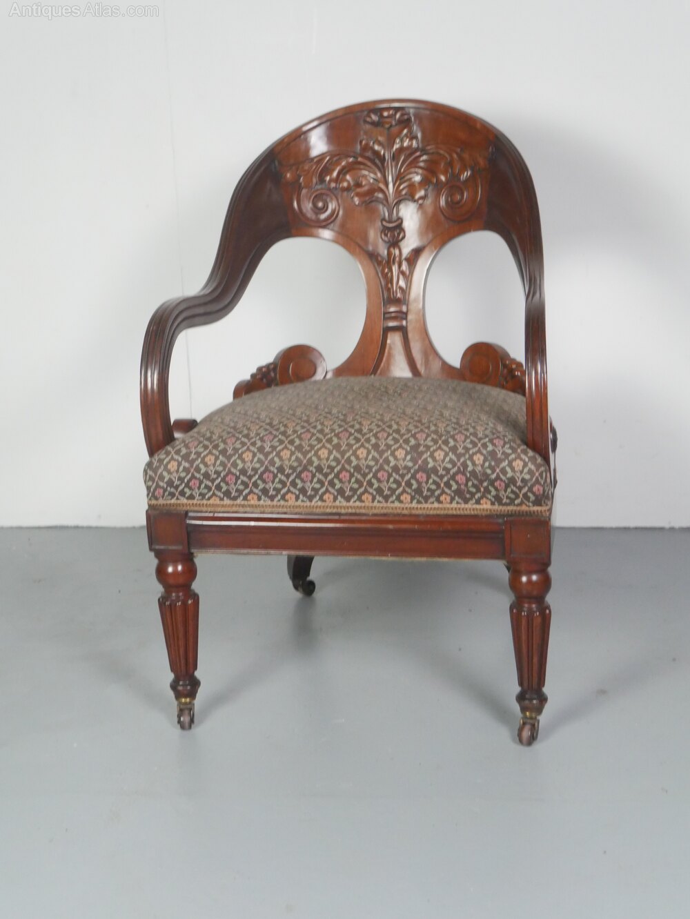A exceptional Regency period mahogany armchair, beautifully designed with a carved timber back, scroll arms, standing on lovely reeded front legs and a generous kick to the back legs, comfortable upholstered upholstery, all ready to enjoy.