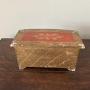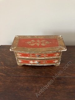 Small Made In Italy Florentine chest of two drawers in red and gold. Measures 10in x 5.25in x 5in and is in good structural condition. There are oases to the paint commemorate with age and usage but still a very attractive piece.