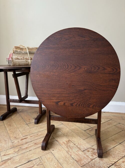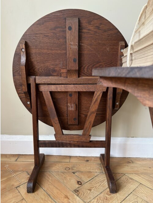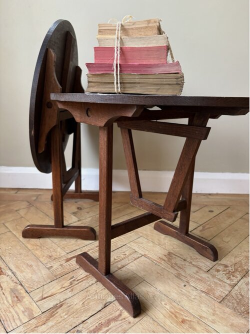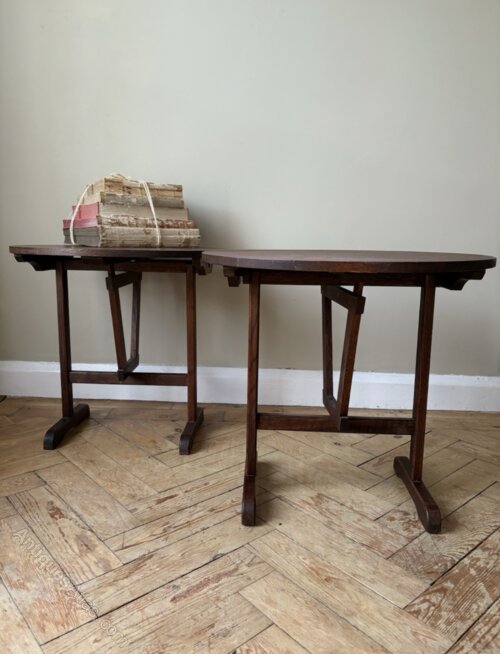 A fabulous matching pair of French Vendange tables. Smaller than the wine tasting tables you find making these a unique find. The size lends themselves to side or bedside tables but they’re so useful with the flexibility to fold down and store. Dark oak timber in good condition bar a few marks with minor expected wear commensurate with age. Great looking tables perfect for the busy home that loves to entertain.