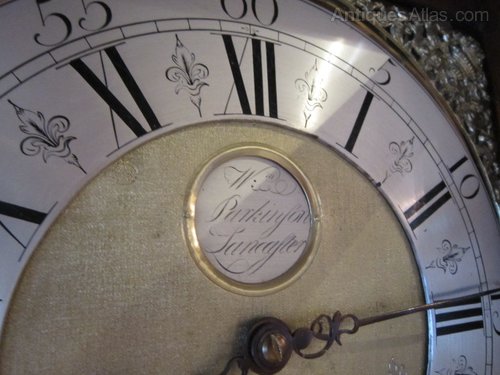 A Small George III period oak and mahogany cross banded longcase clock.c.1760. Brass and silvered dial with date aperture. Thirty hour movement striking on a bell to the hour. Made by William Parkinson of Lancaster(1739-99). Shaped top to the case door with turned columns, repeated to the moulded cornice hood. Small proportions stands 79" high. Full working order. Superb mid oak colour and patina.