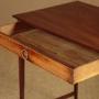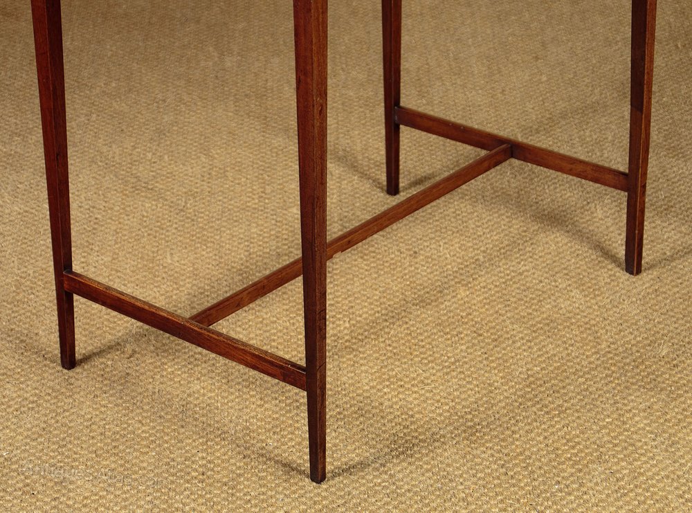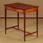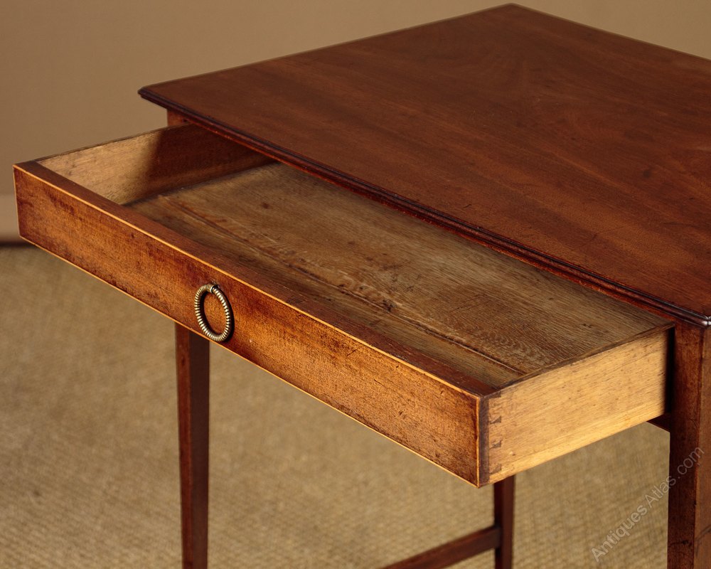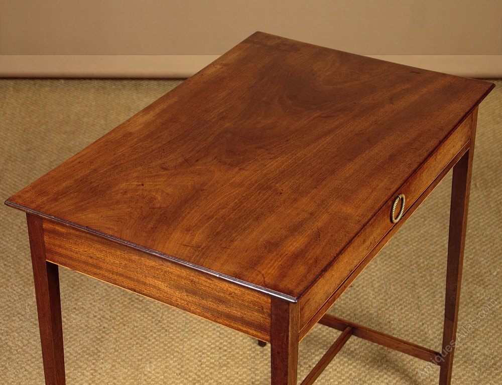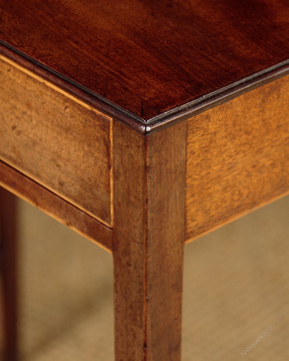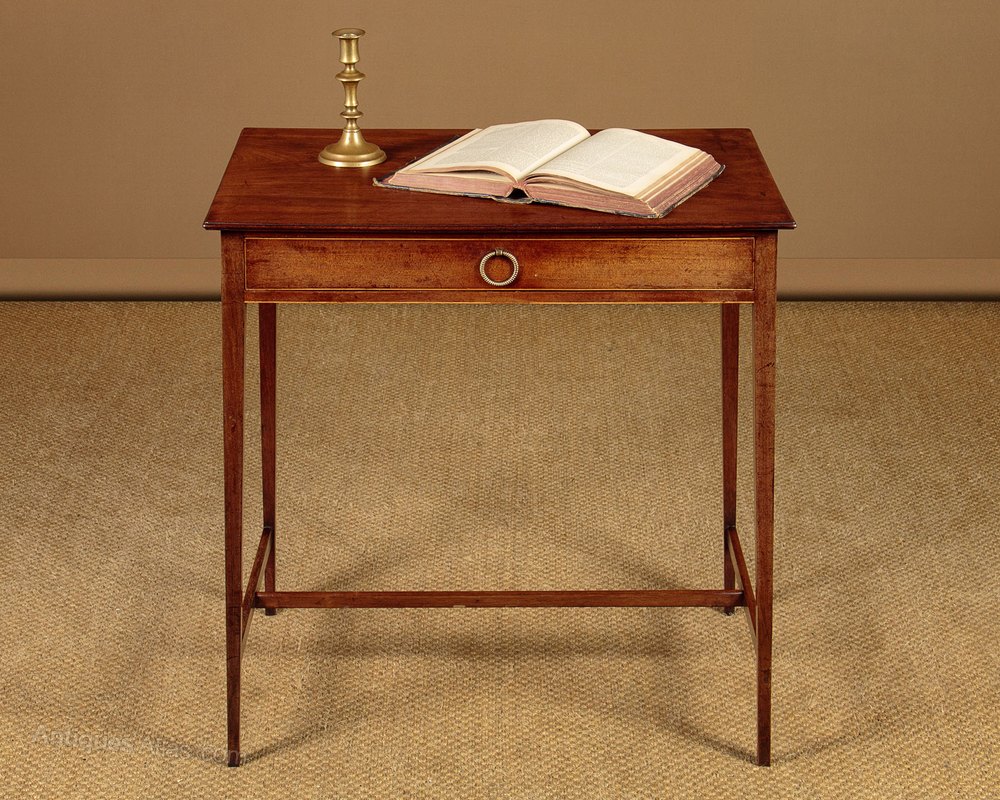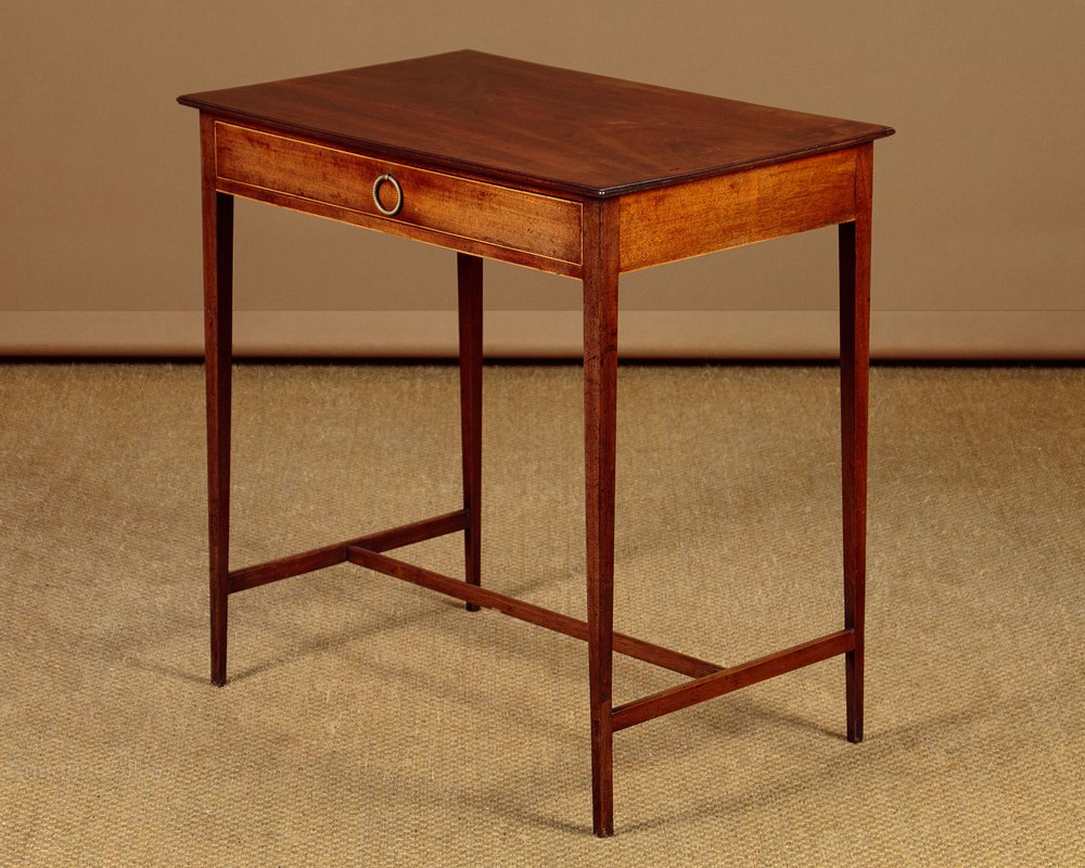 Very elegant little Georgian mahogany side table c.1800. Single piece solid mahogany top with a crisp moulded edge. Over a slim drawer with inlaid stringing to the drawer front and the original brass handle. Raised on unusually slim tapering square legs joined with an H stretcher. Mahogany veneered sides and rear, also with inlaid stringing to the bottom edge. Solid oak drawer linings. Very good condition and lovely original colour. Cleaned and waxed in our workshops.