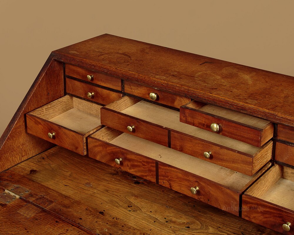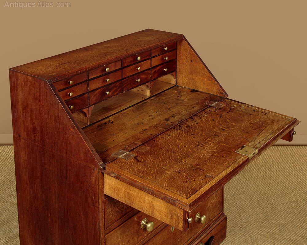 Delightful little George III country made oak bureau or writing desk c.1800. Useful small size, just 37" wide at the base. Open the fall to make a good sized work surface (height 31") with pigeon holes and ten small mahogany fronted stationery drawers above. Two short and three long drawers of graduated height below the desk. Oak drawer fronts with cockbeaded edges and large brass knobs. Moulded trim around the base and raised on shaped bracket feet at the front and sides. Solid oak sides, unusual lime wood drawer linings, note also the elm board used in the base of the bureau interior. Excellent colour and condition, restored cleaned and waxed in our workshops. Key supplied.