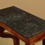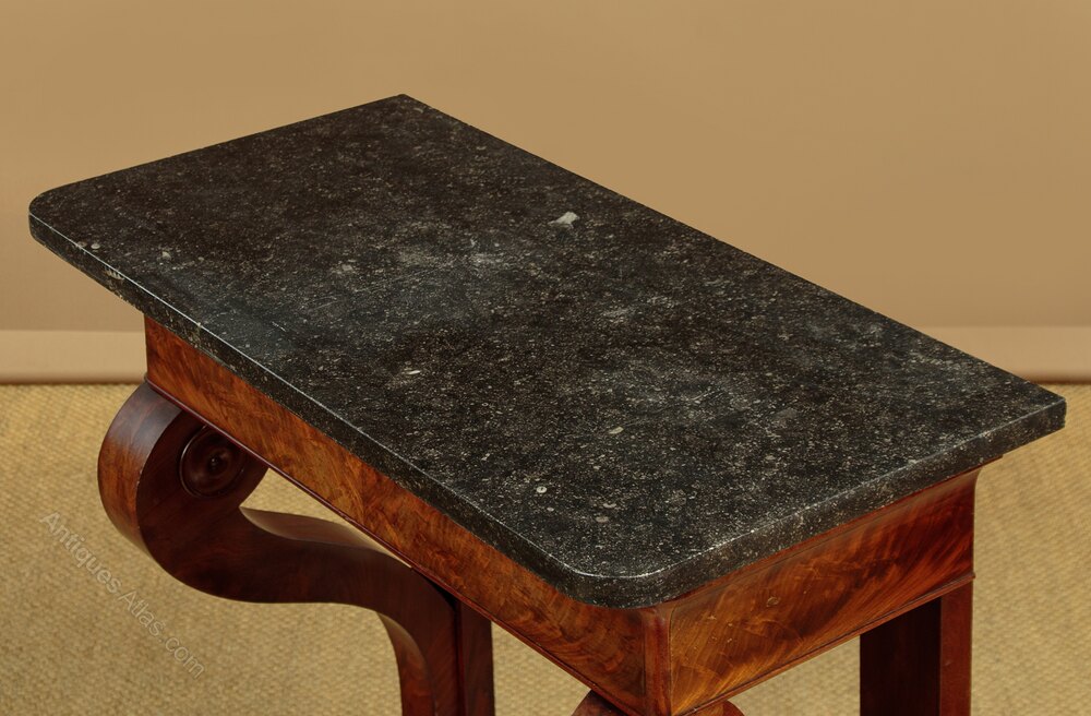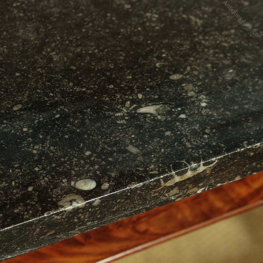 Handsome little mid 19th.c. mahogany and marble top console table c.1840. Just 32" wide. Original black marble top with rounded front corners and scores of tiny white fossils embedded in the stone. On a flame mahogany veneered base with a single oak lined drawer in the apron. Curving bracket front supports with turned roundels and moulded detail where they join the rear stiles. Over scrolling corbels with carved detail to both sides and to the front. On a plinth with concave front edge, veneered to match and raised on carved claw feet. With an obvious scratch to the marble and some wear and repairs to the veneers. Otherwise excellent colour and condition, cleaned and waxed in our workshops.