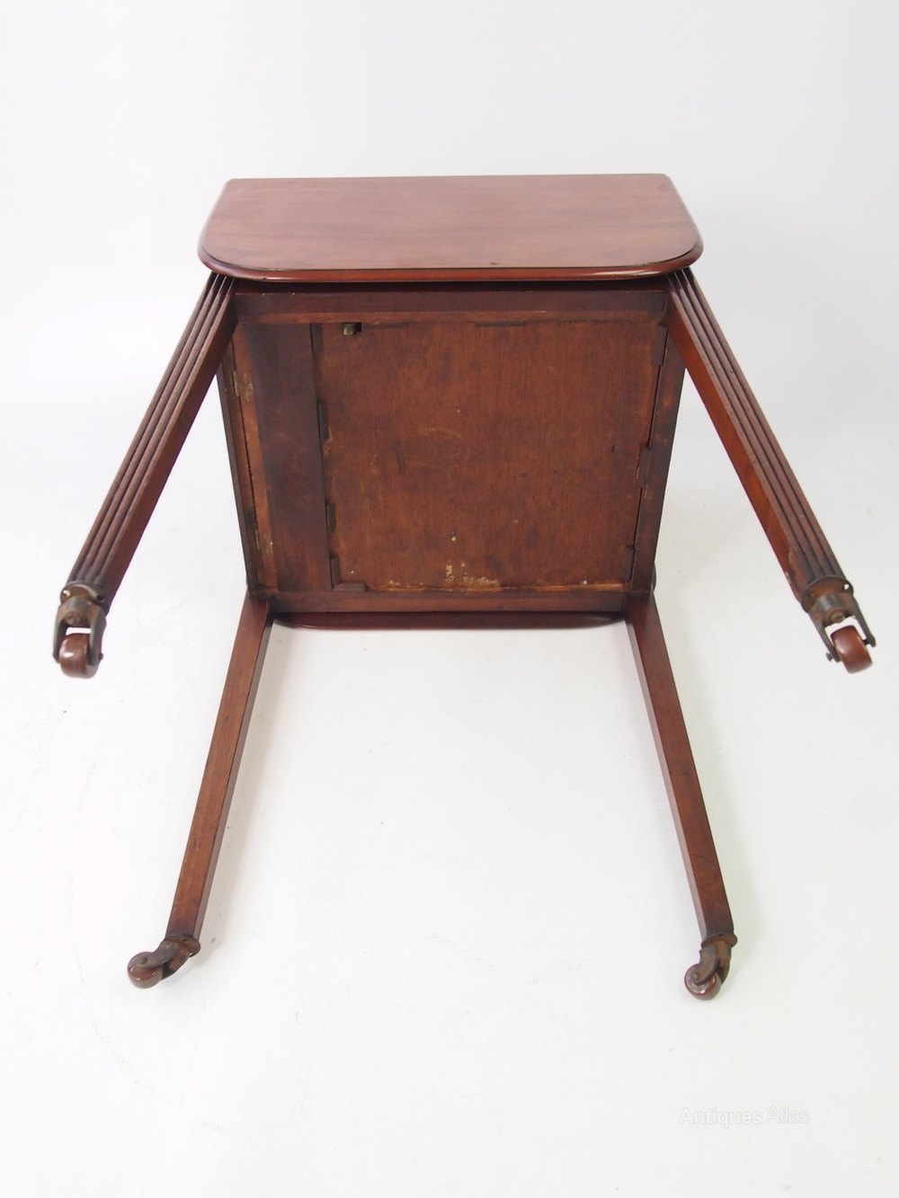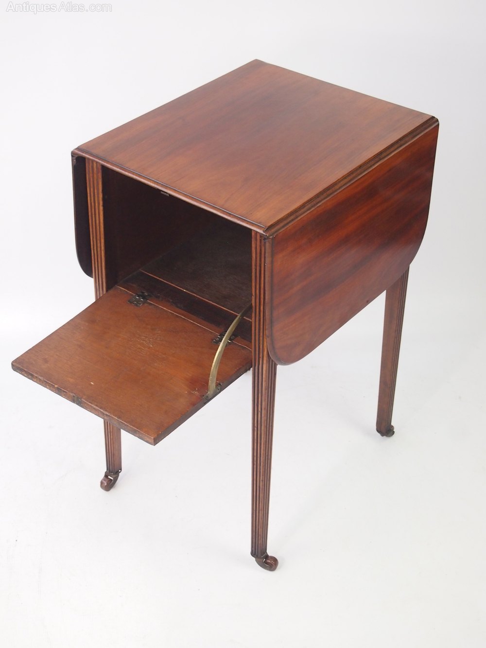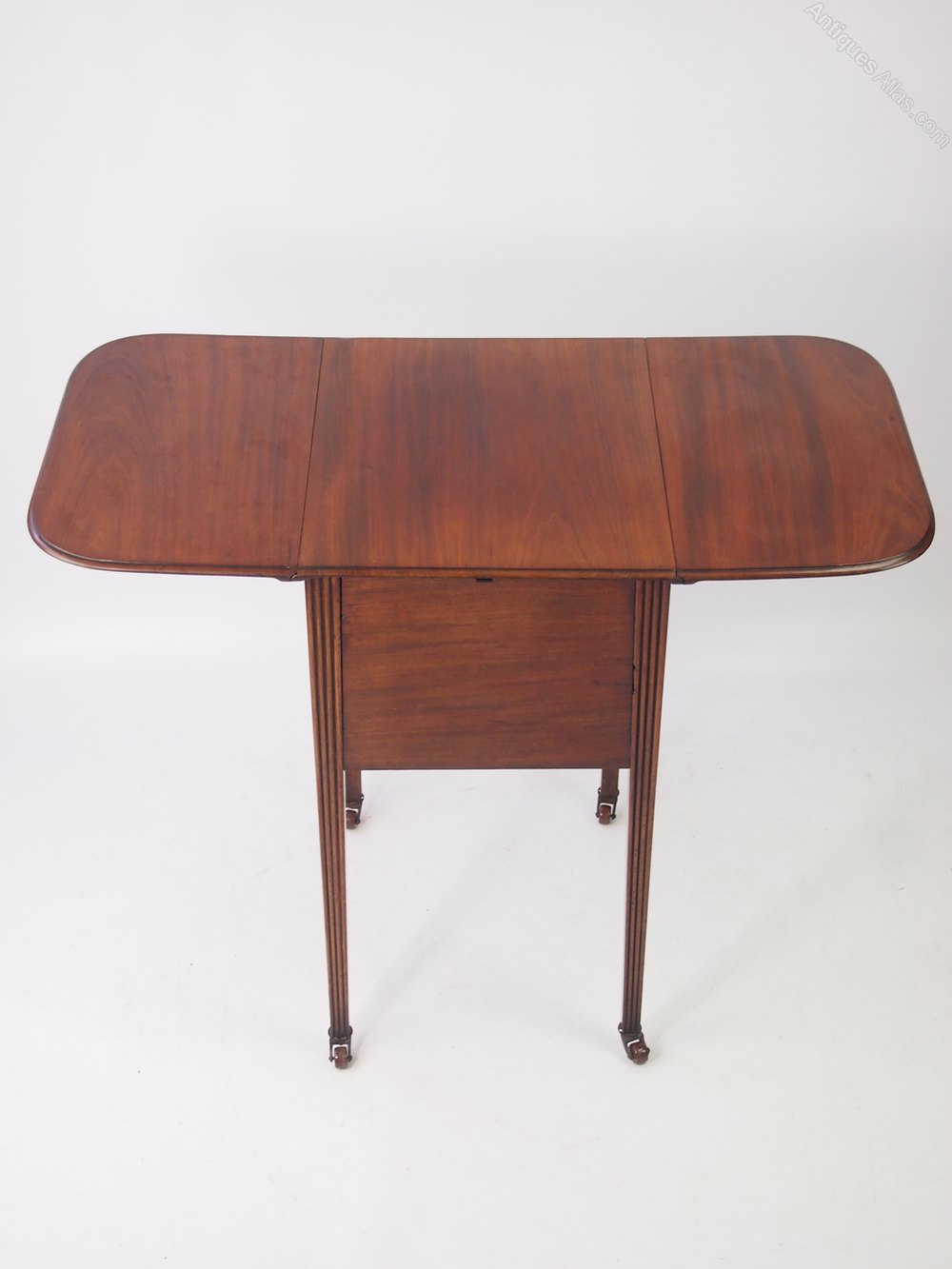 A charming small antique Victorian mahogany drop leaf table with secret compartment. This occasional table stands on 4 reeded legs with ceramic casters to the feet. It has two drop leaves are supported by push-out wooden supports. In good condition, with beautiful colour and figuring and patina. The secret compartment is opened by simultaneously pressing a small trigger to the front and pressing a brass lever at the bottom. A stylish and small sized piece of antique furniture.