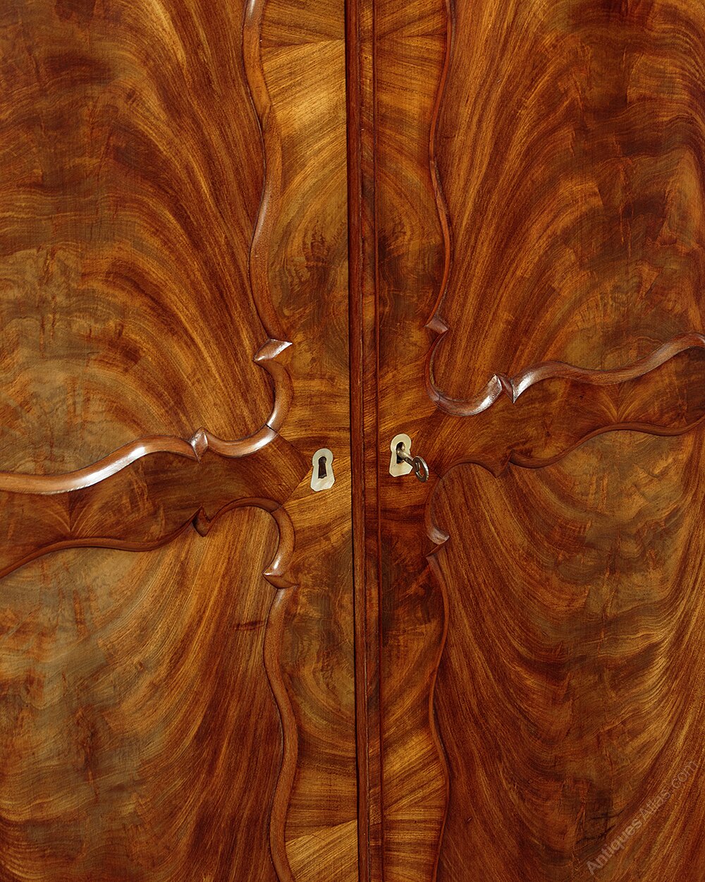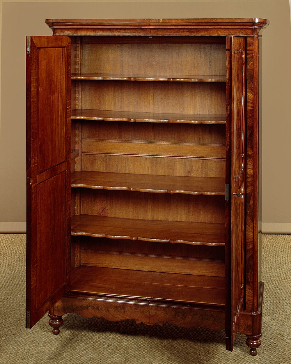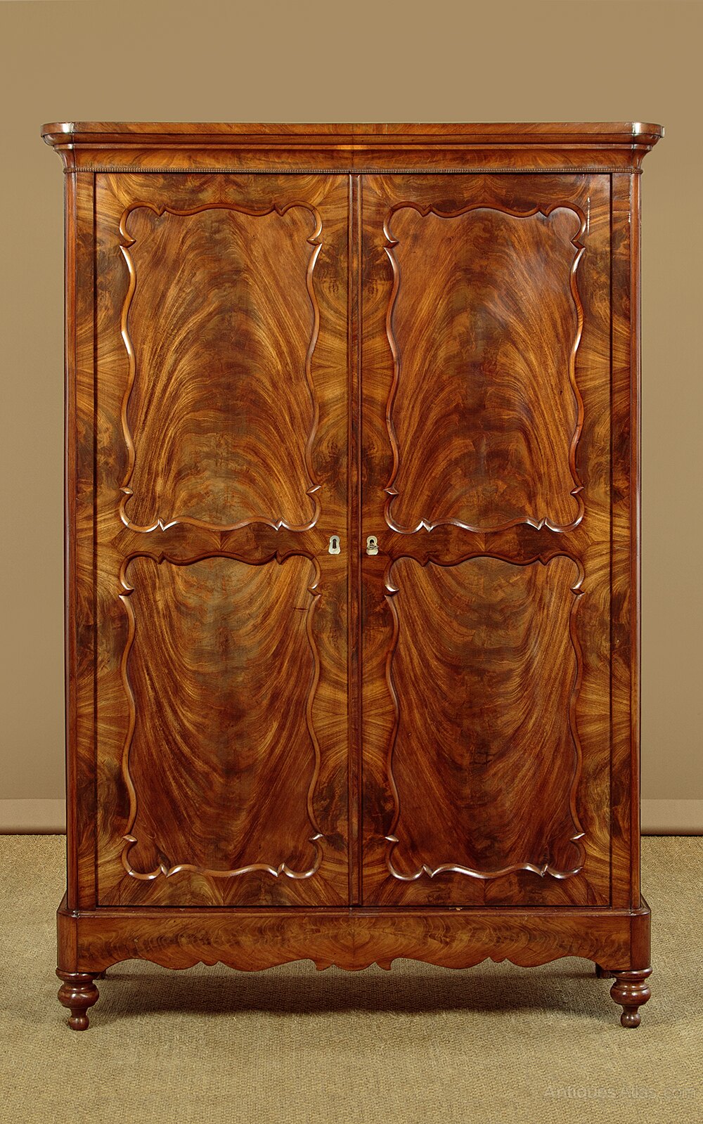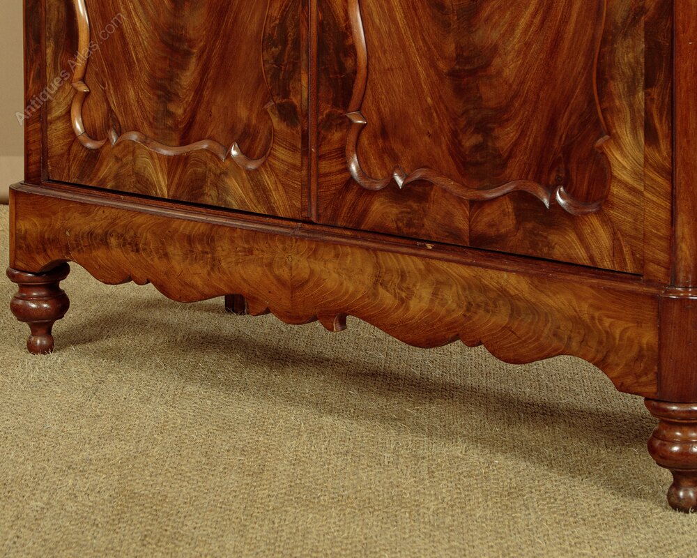 Smart little early 19th.c Biedermeier style mahogany wardrobe or cupboard c.1820. Two door cupboard fitted with four adjustable shelves inside (internal depth 13"). Flat polished top and moulded cornice which also features a remarkably fine applied carved moulding. Door fronts with spectacular flame mahogany veneers laid in a symmetrical pattern across the panels and continuing on the attractively shaped surrounding frames and on the cabinet sides. Note the large inlaid mother of pearl escutcheons. Shaped front edge to the shelves and shaped bottom edge to the plinth. Raised on the original turned front feet. Oak lined interior and back boards. Excellent colour and condition, restored cleaned and waxed in our workshops. Key supplied.