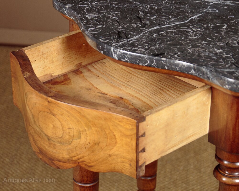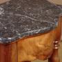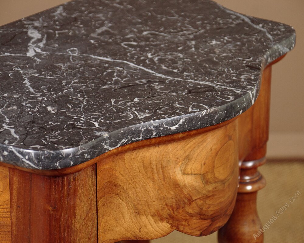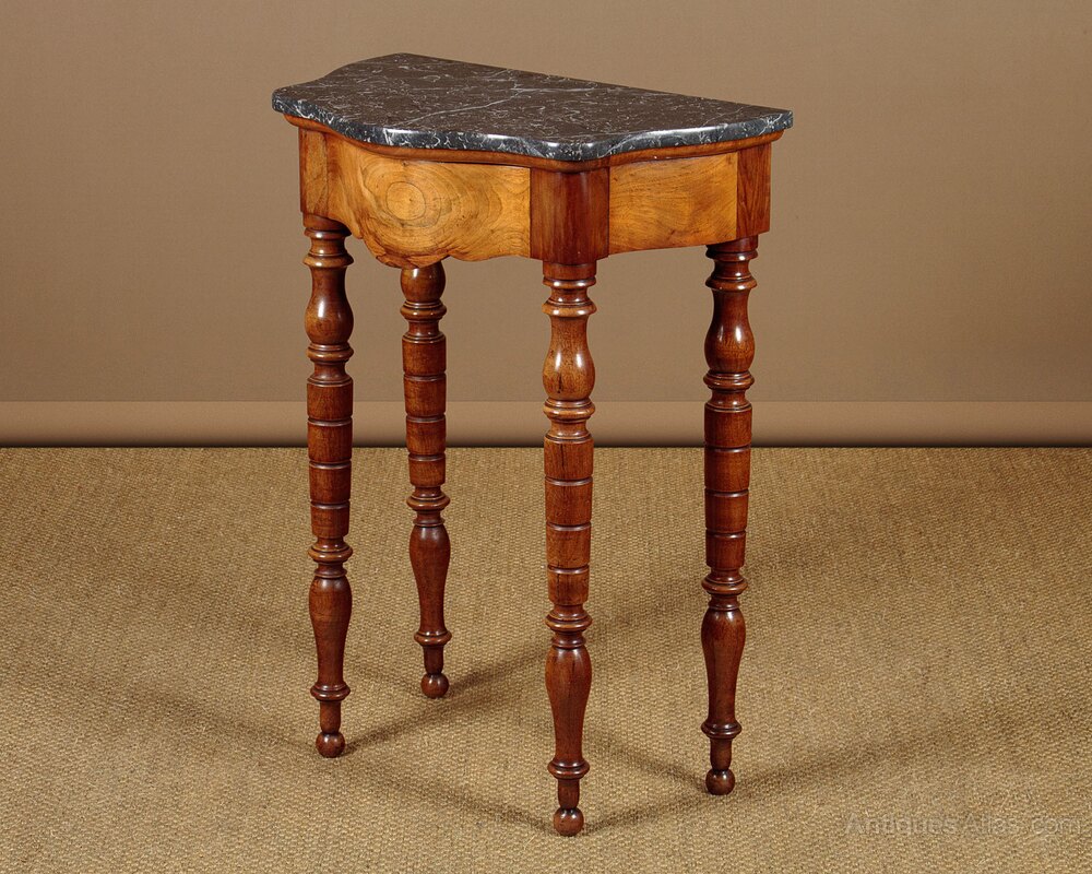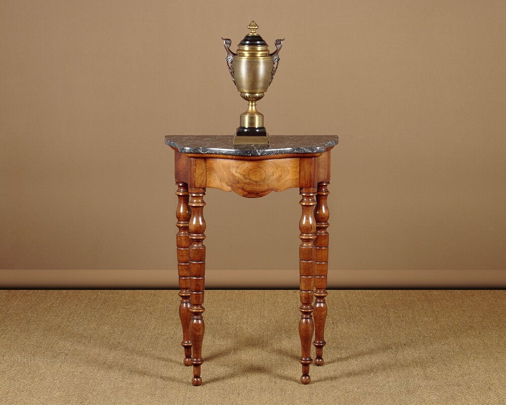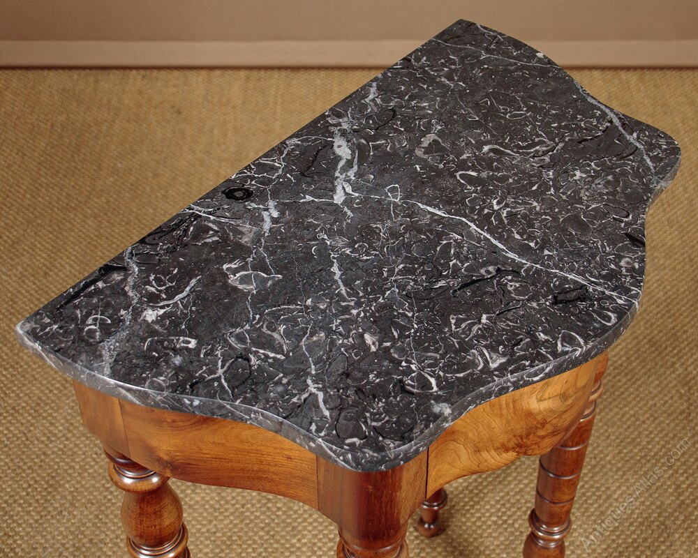 Delightful little serpentine shaped walnut and marble top console or hall table c.1880. Just 25½" wide. Shaped top in grey marble over a conforming apron in well figured walnut featuring a useful little drawer at the front. Raised on particularly good turned legs front and rear, in solid walnut, tapering to attractive ball finial feet. Excellent colour and condition, cleaned and waxed in our workshops.
