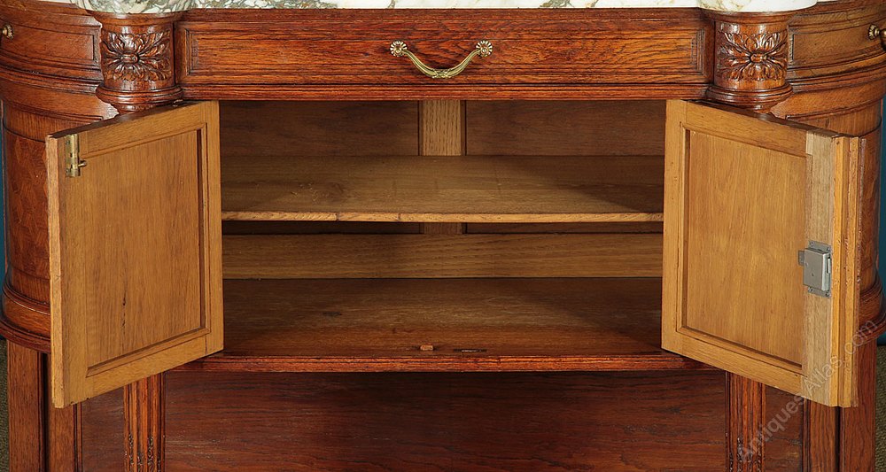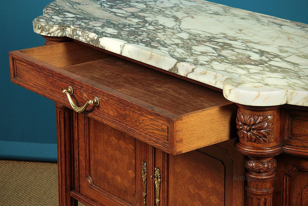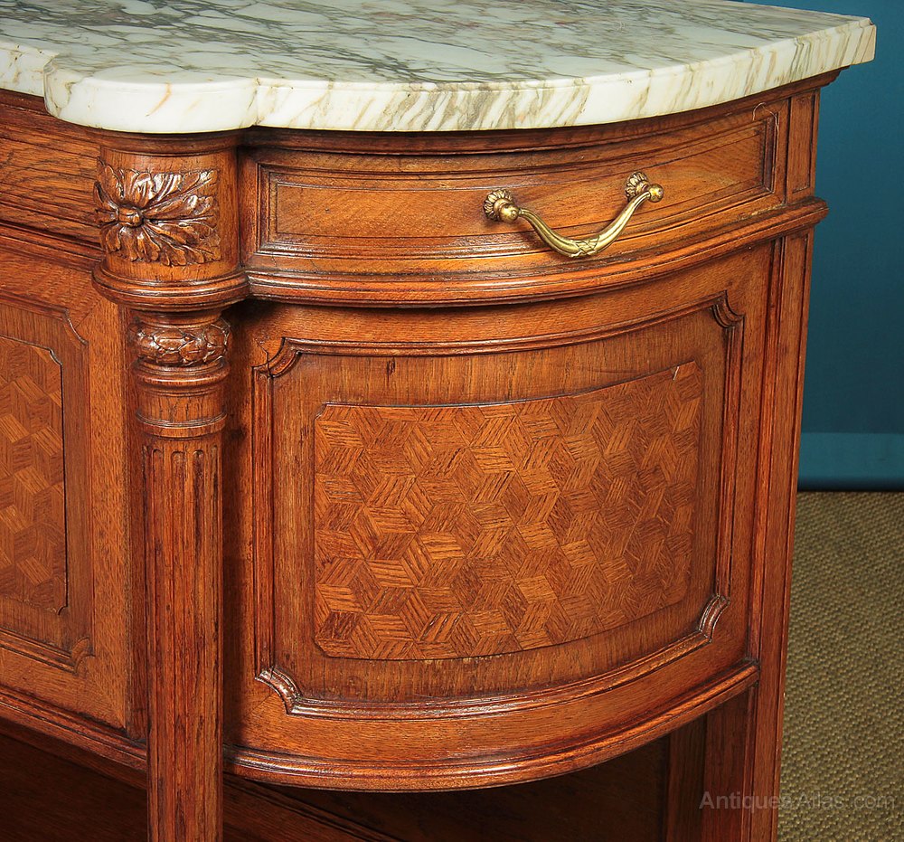 Superb quality Edwardian era French marble top bow front side cabinet c.1910. Original highly figured thick white marble top with a shaped and thumb moulded edge. Single drawer over a two door cupboard flanked with curved sides featuring dummy drawer fronts over fixed panels. Raised on carved and fluted column stiles over an open potboard display shelf. Shaped and raised panels with oak chequerboard parquetry fronts within moulded surrounds. Large and original gilded drawer handles and escutcheon plates. Oak drawer linings and back panels. Excellent condition, cleaned and waxed in our workshops. Key supplied.