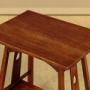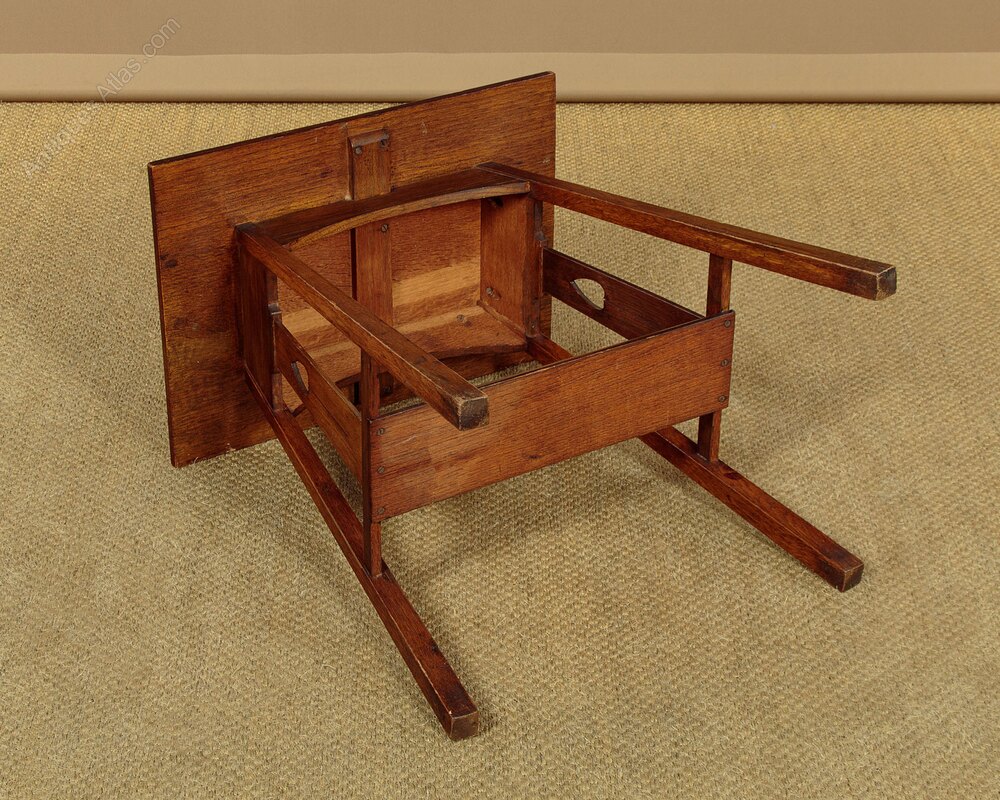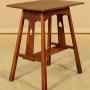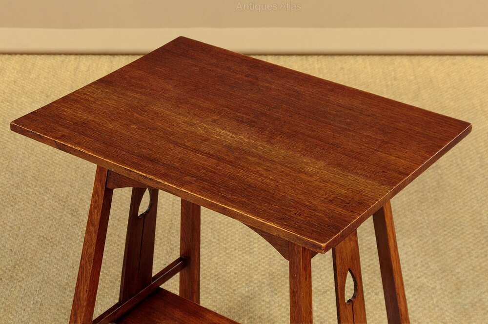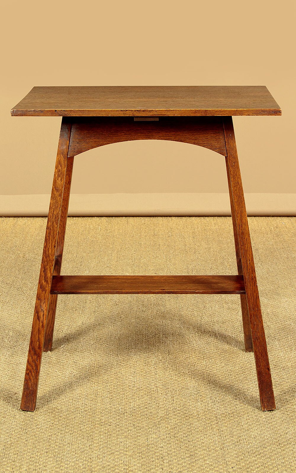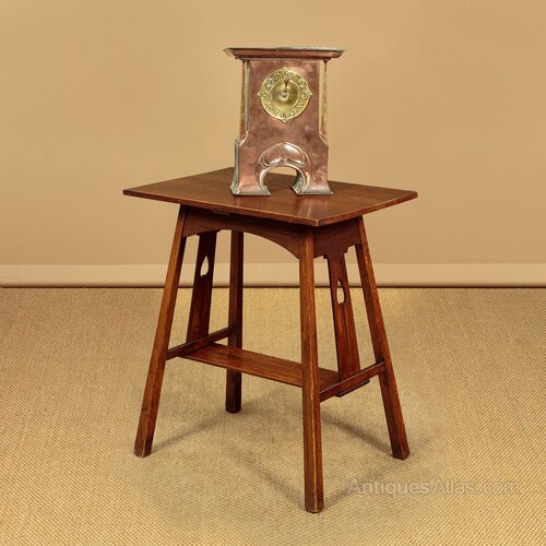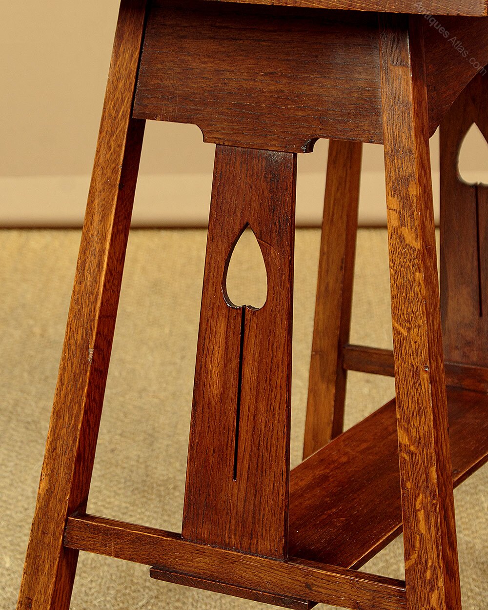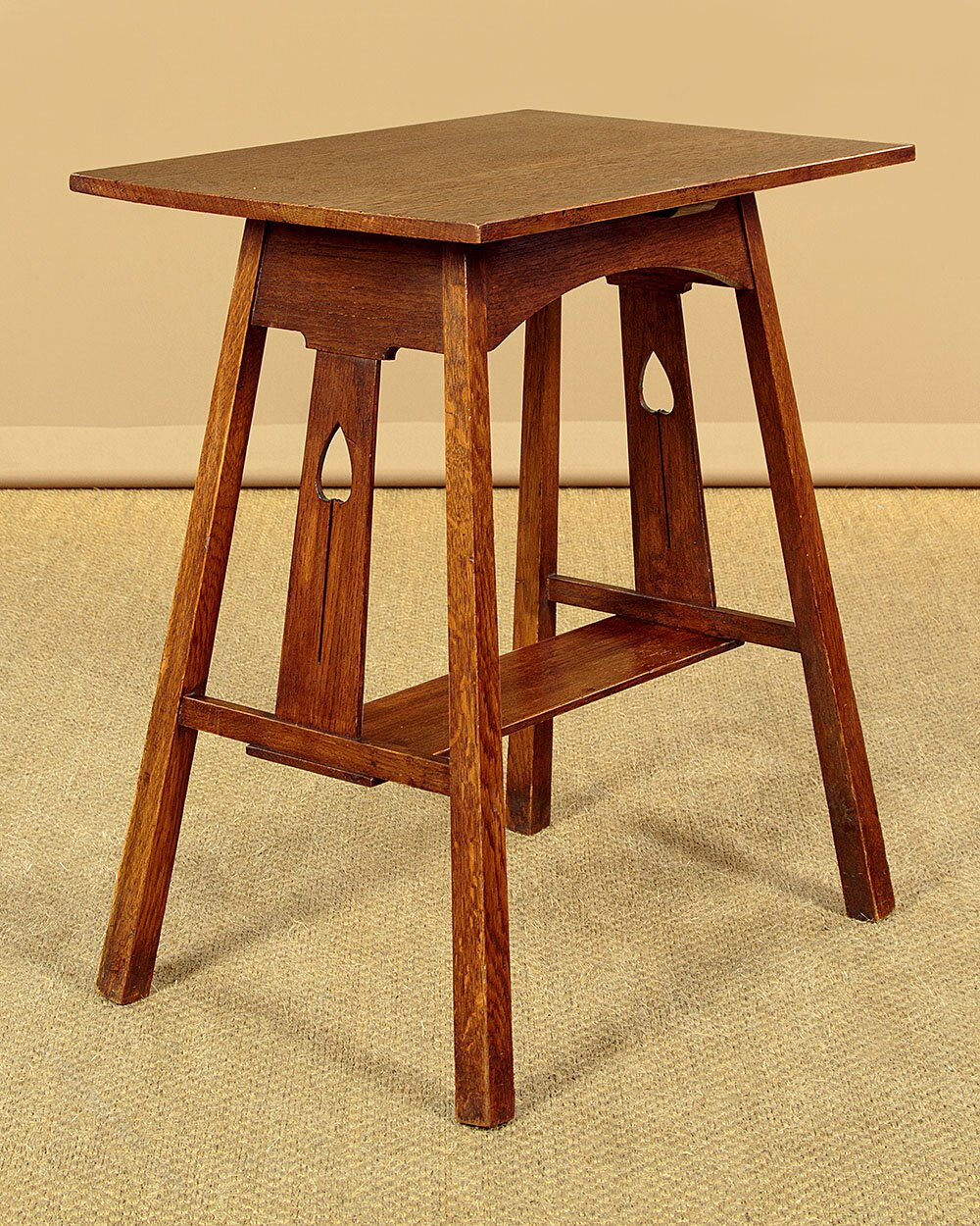 Charming little Arts & Crafts or Liberty style oak side table c.1900. 22" x 16" top over a shaped apron and raised on square stiles, flaring slightly as they descend and set at a pronounced angle (note the bearer underneath the table top to provide extra support for top). Joining the apron to the side stretchers are vertical elements pierced with a distinctive spade, heart or flower head motif. The legs are joined with slim stretcher shelf. No maker's marks though the design is attributed to E.A Taylor for the Glasgow firm of Wylie & Lockhead. Excellent colour and condition, cleaned and waxed in our workshops.