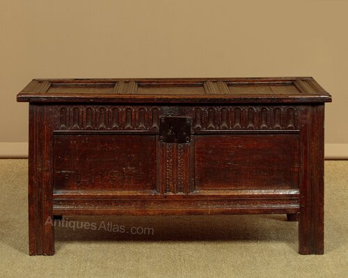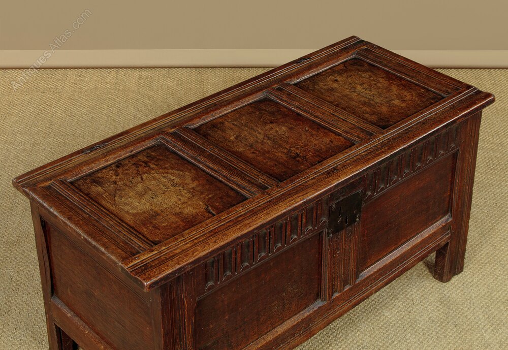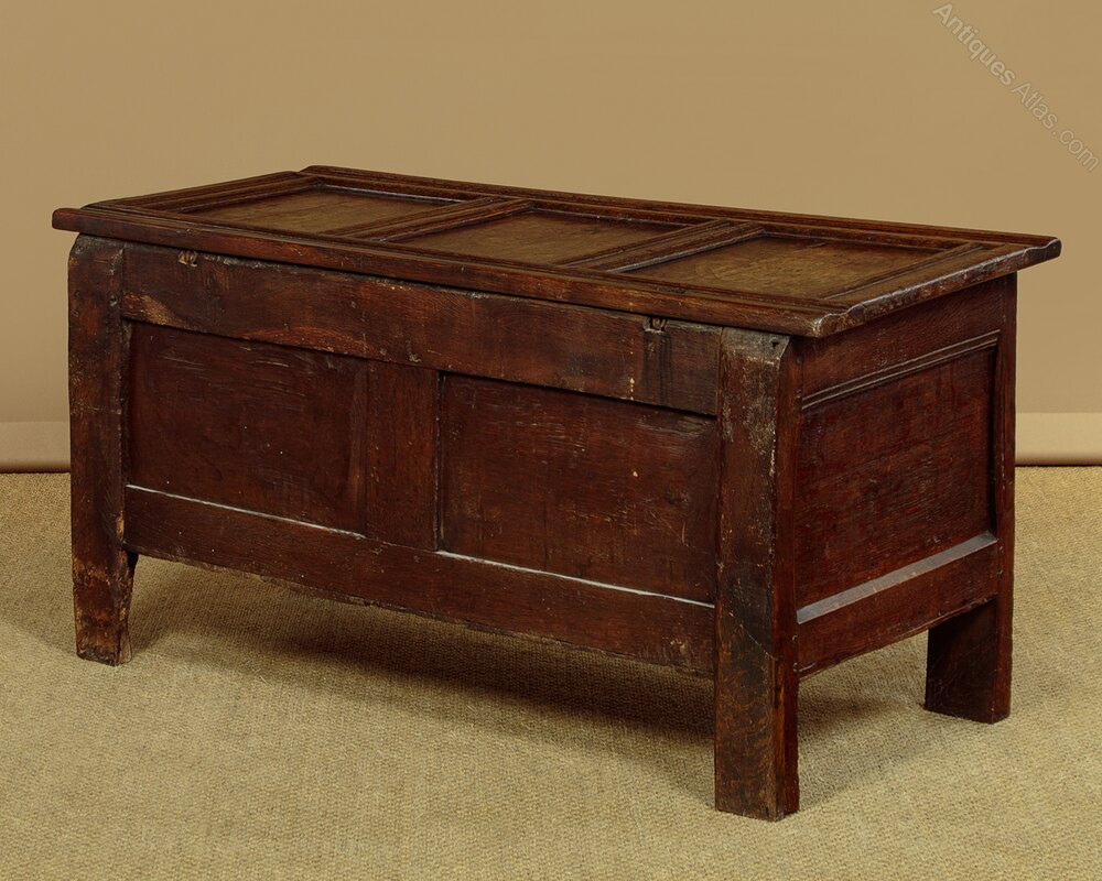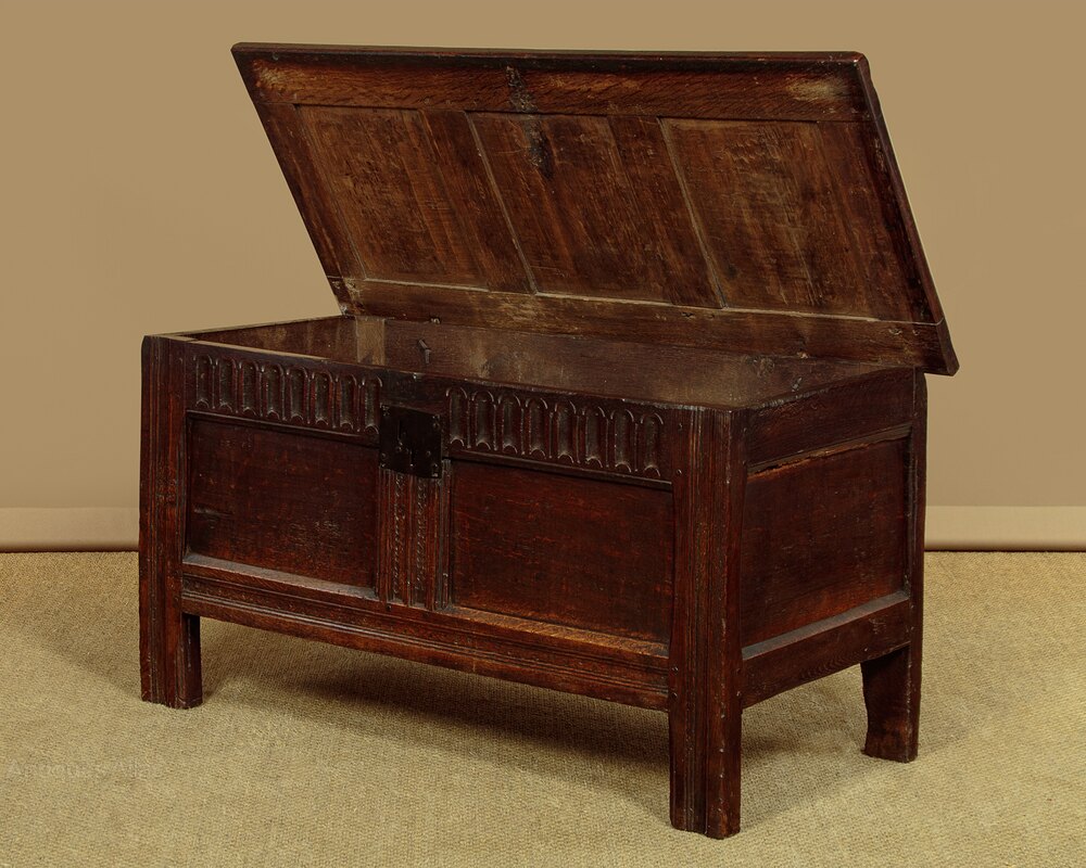Small mid 18th.c. oak coffer c.1740. Three panel lid with moulded rails and mullion opening on the original iron hoop hinges. Front of the coffer with original repeated arch carving to the top rail and a charming stamped flower head decoration centre mullion and to the bottom rail. Original iron lock plate and good long stiles. Panelled oak sides and rear, oak floor boards. Very good colour and condition, cleaned and waxed in our workshops.