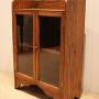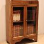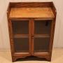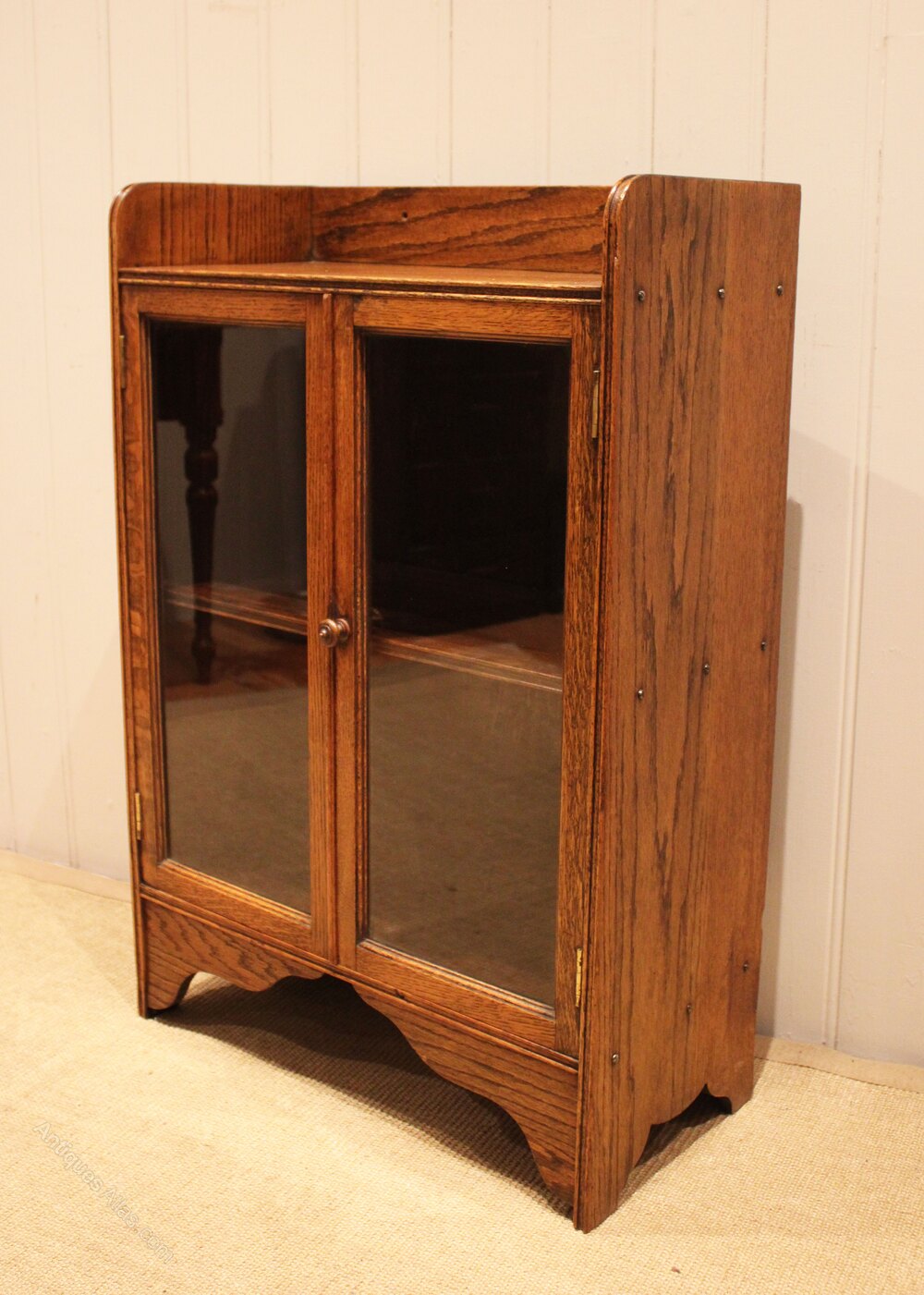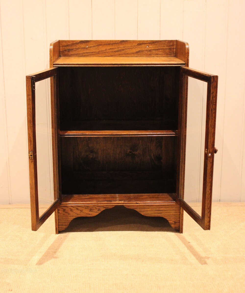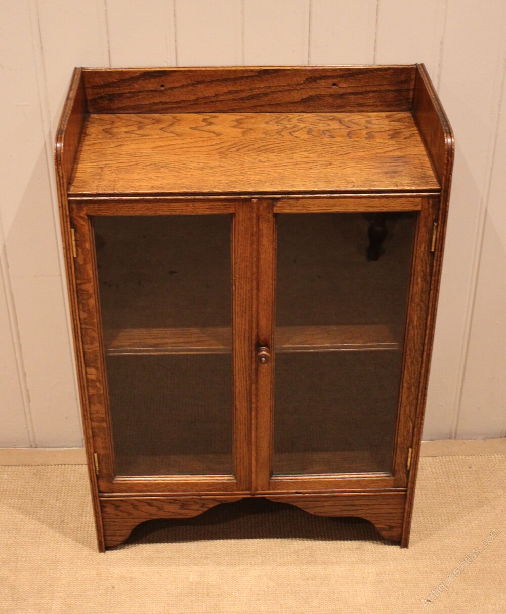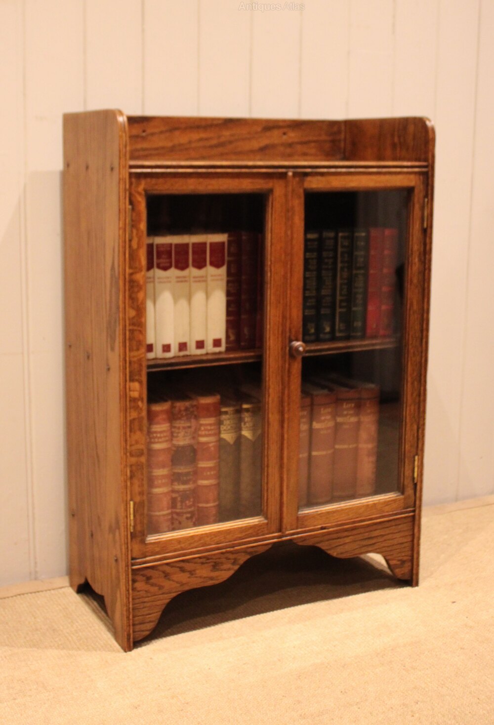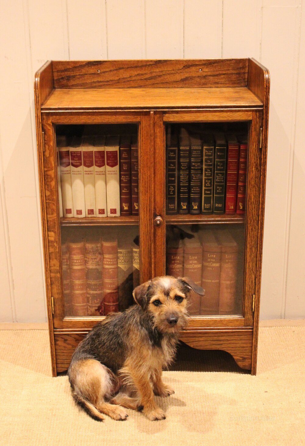 Small oak glazed bookcase having a fixed internal shelf with an upper tier , raised on bracket feet. each shelf measures 24cm deep x 57 cm wide and 30 cm high