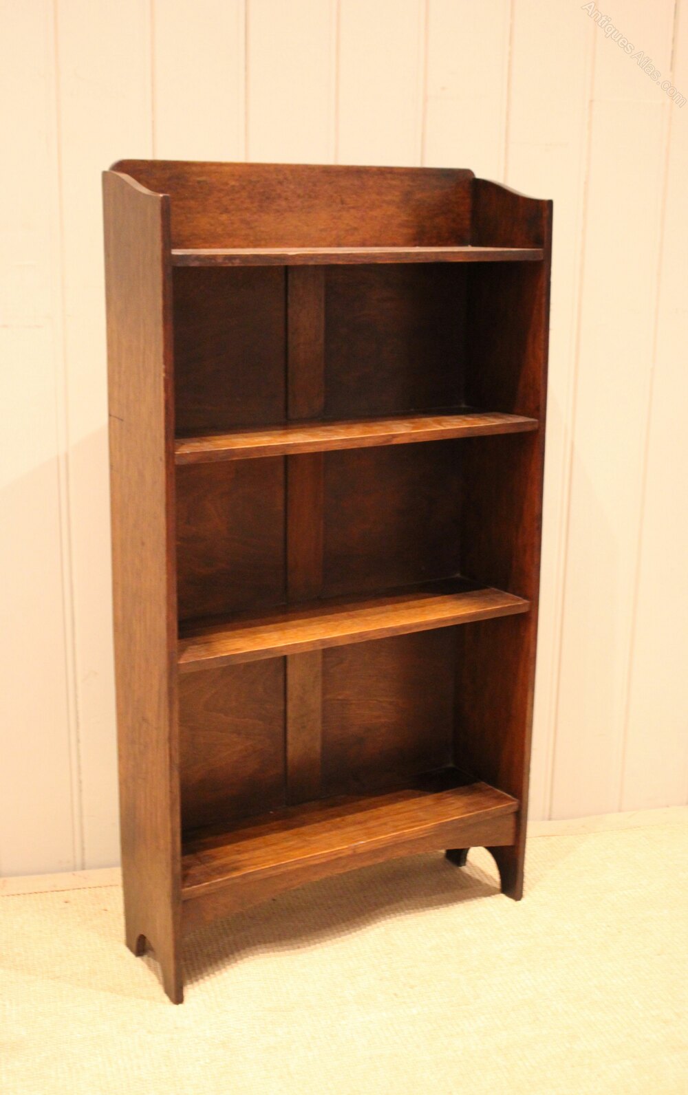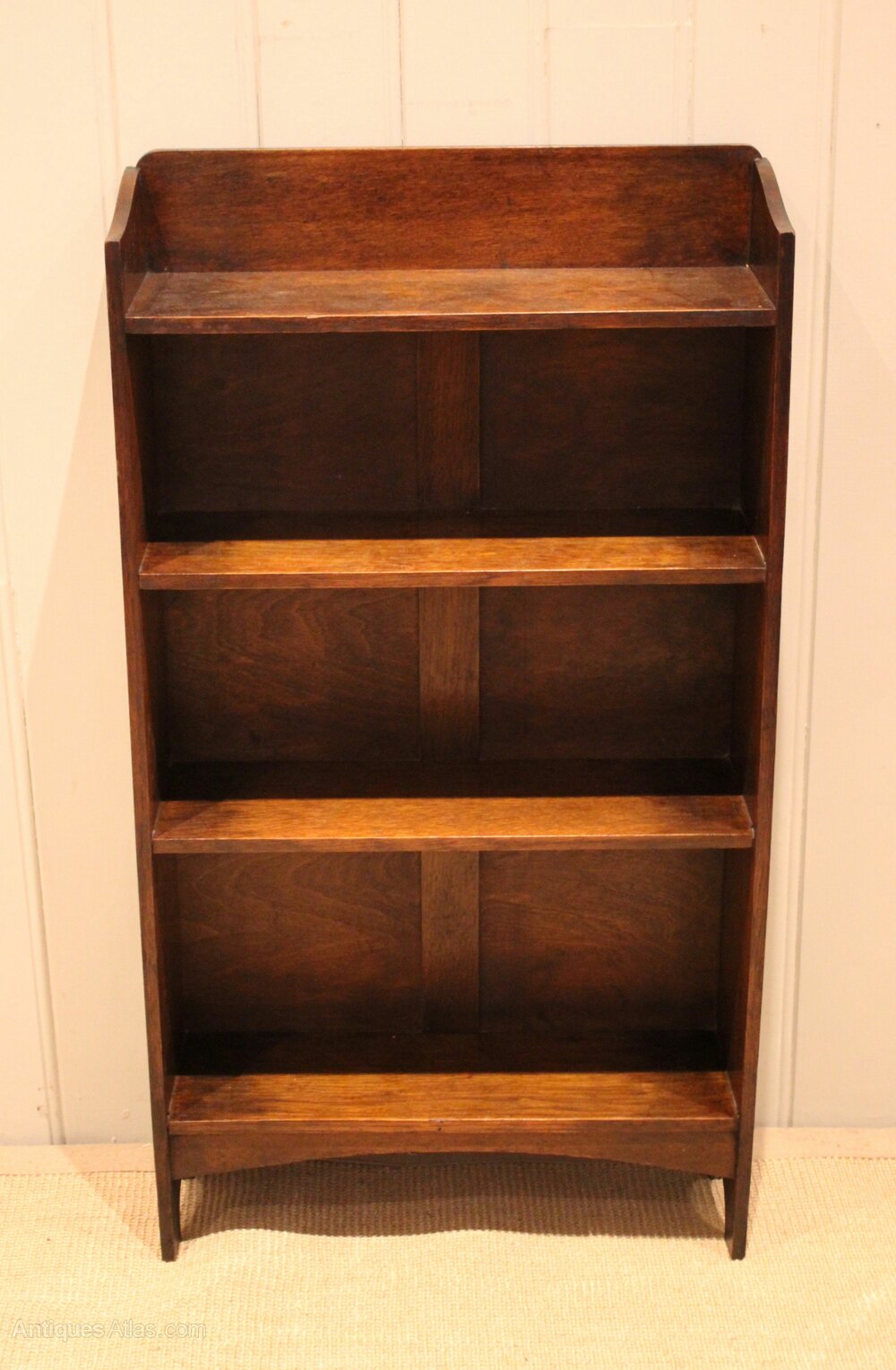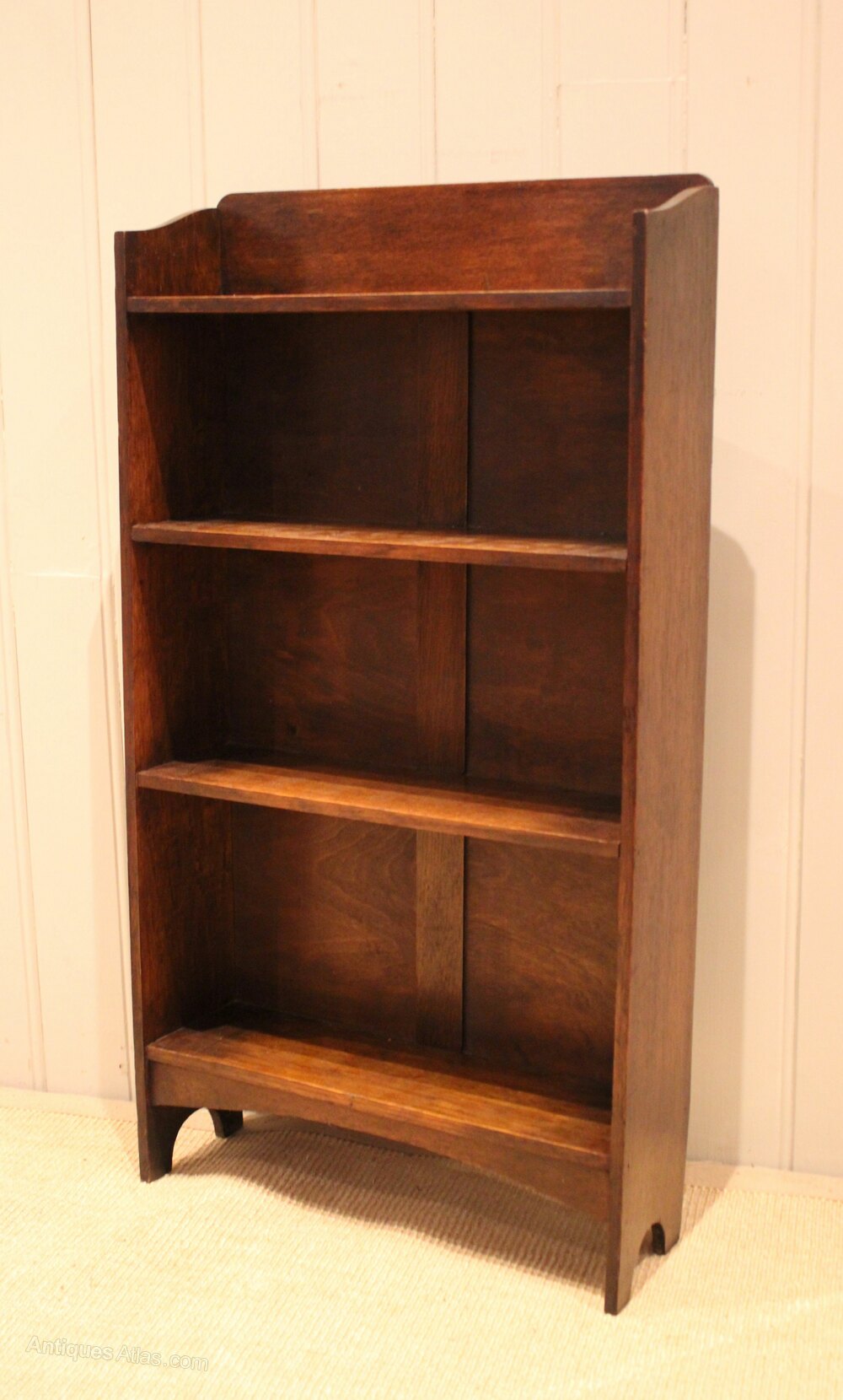 Small solid oak open bookcase having three fixed shelves , with a shaped back , raised on side brackets . The shelf dimensions are 14.5 cm deep , 48.5 cm wide and from the bottom up 25.5 cm high , 21.5 cm high and at the top 18.5 cm high. Pair Available