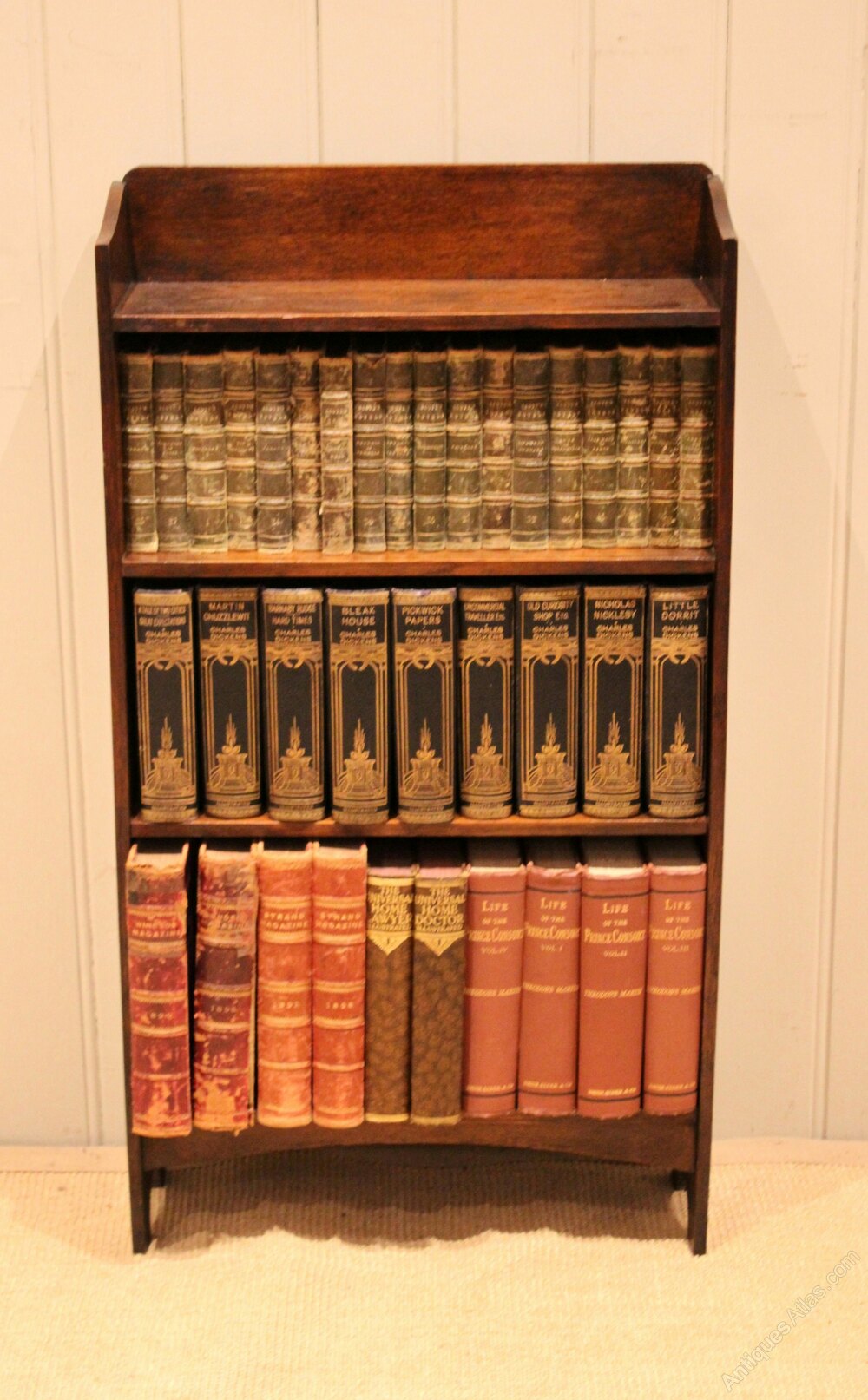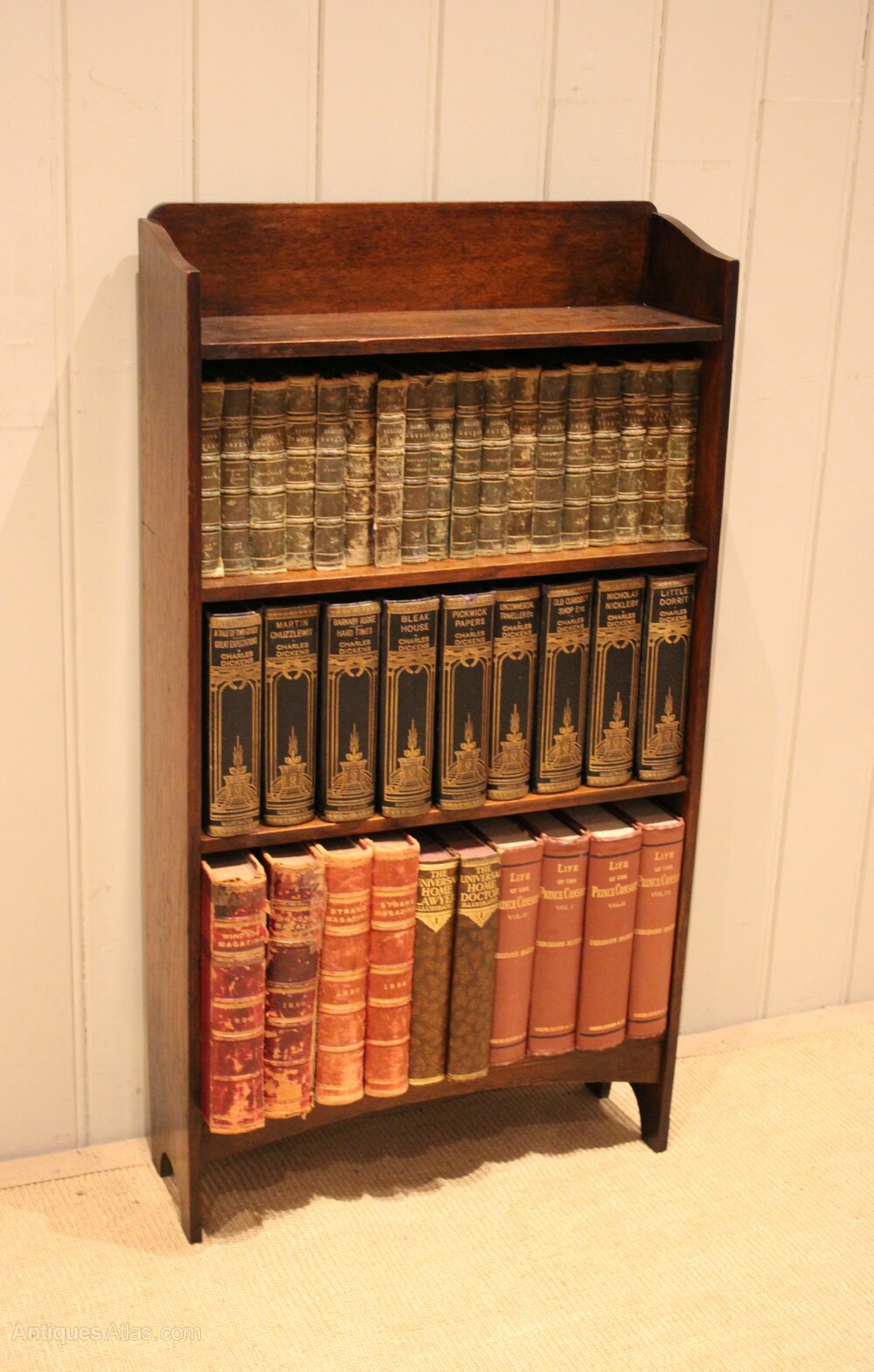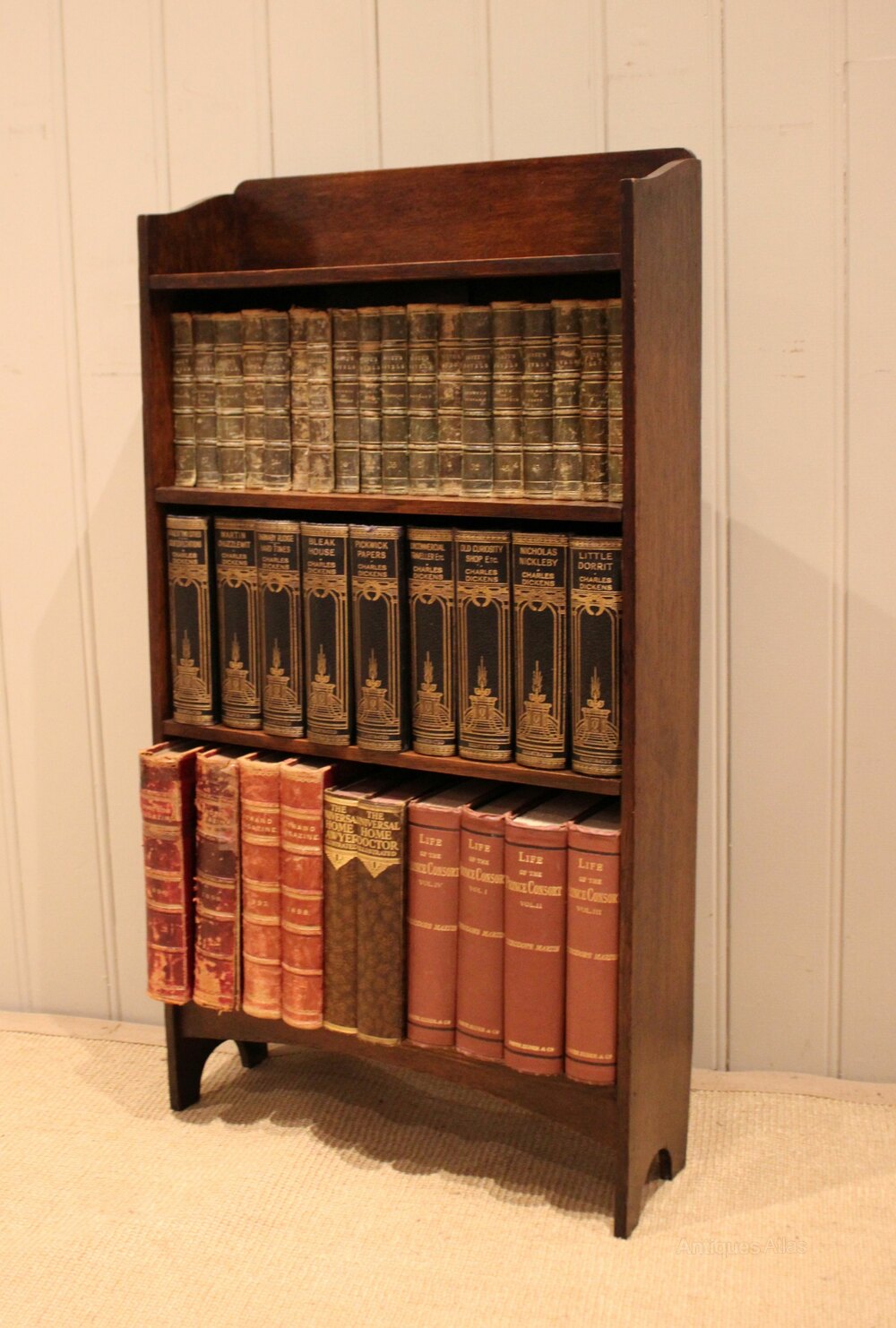 Small solid oak open bookcase having three fixed shelves , with a shaped back , raised on side brackets . The shelf dimensions are 14.5 cm deep , 48.5 cm wide and from the bottom up 25.5 cm high , 21.5 cm high and at the top 18.5 cm high. Pair Available