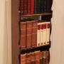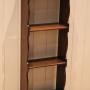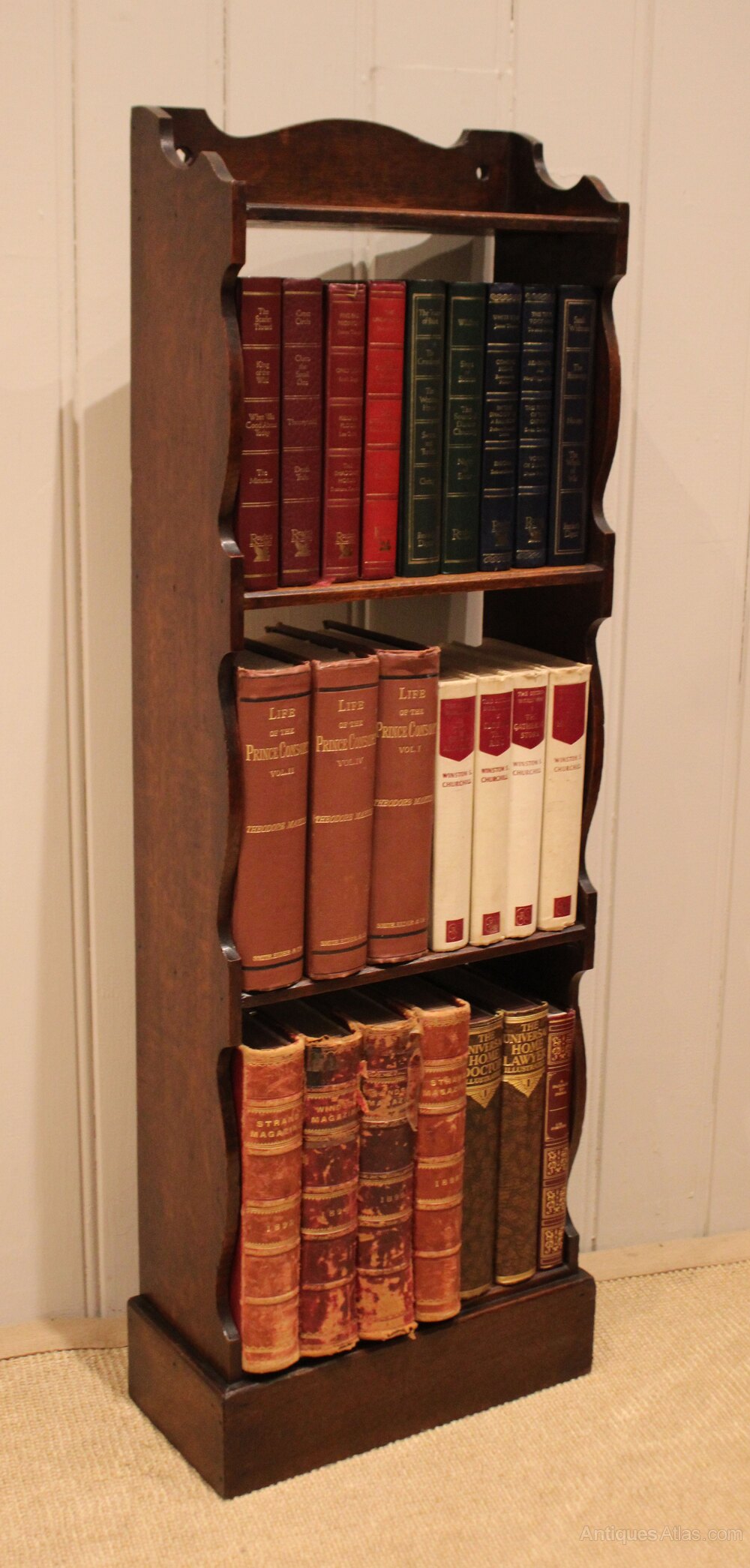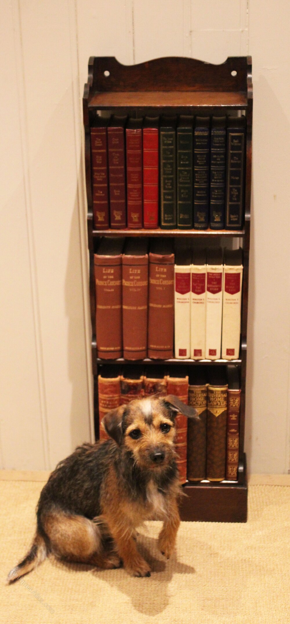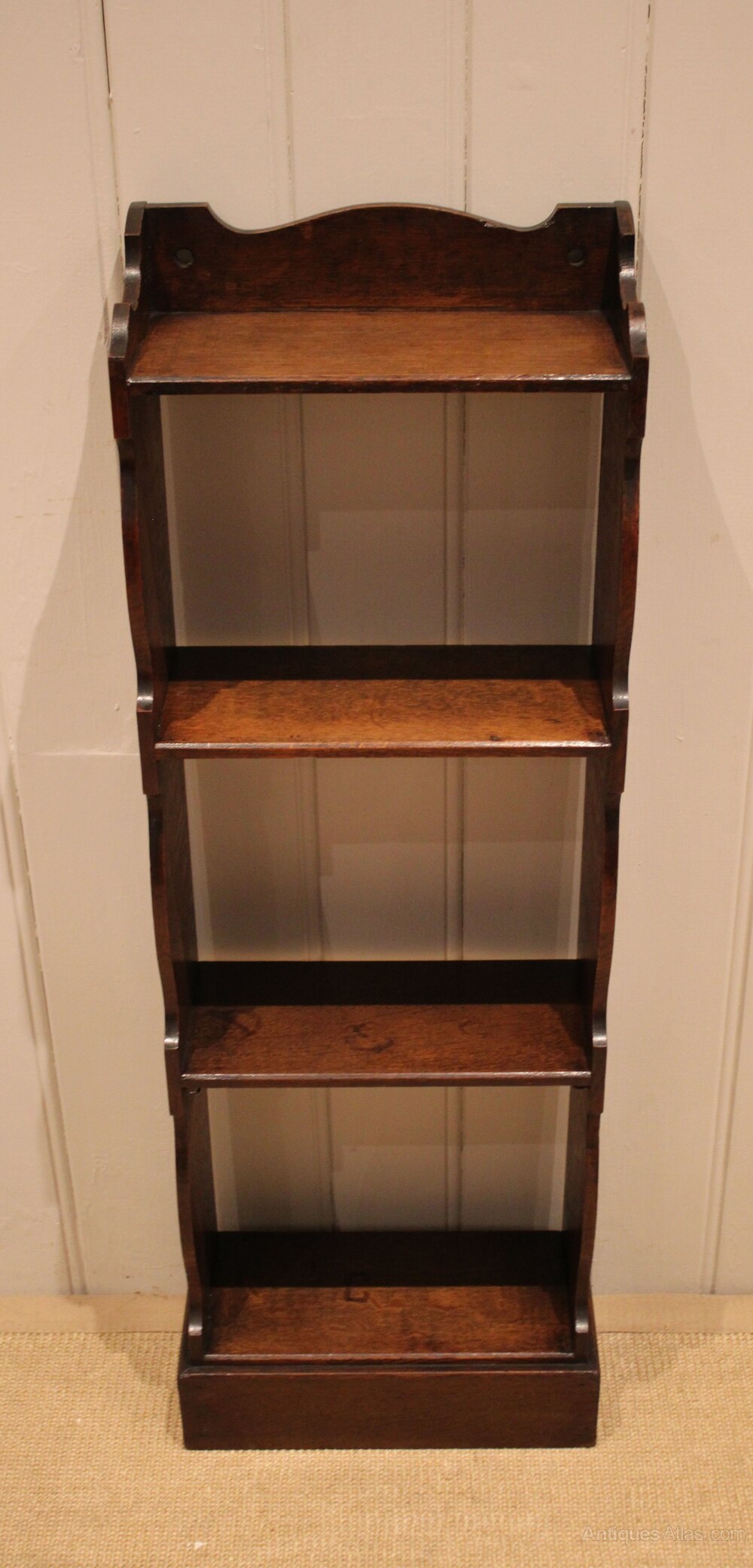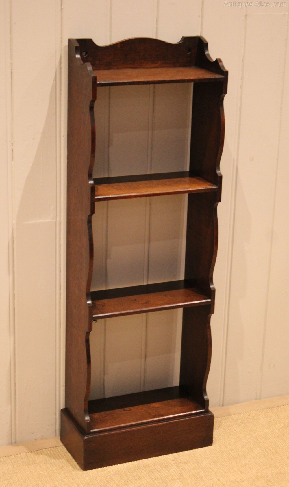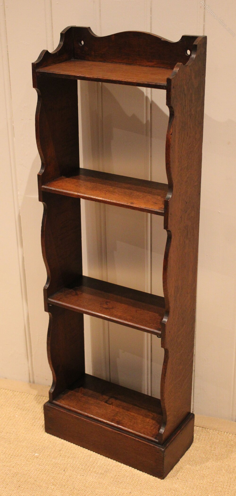 Solid oak open bookcase having two fixed shelves with open backs , a shaped top and sides , raised on a plinth base . The shelf dimensions are 30 cm wide , 13 cm deep and from the bottom up 28 cm high , 27 cm high and at the top 24 cm high .