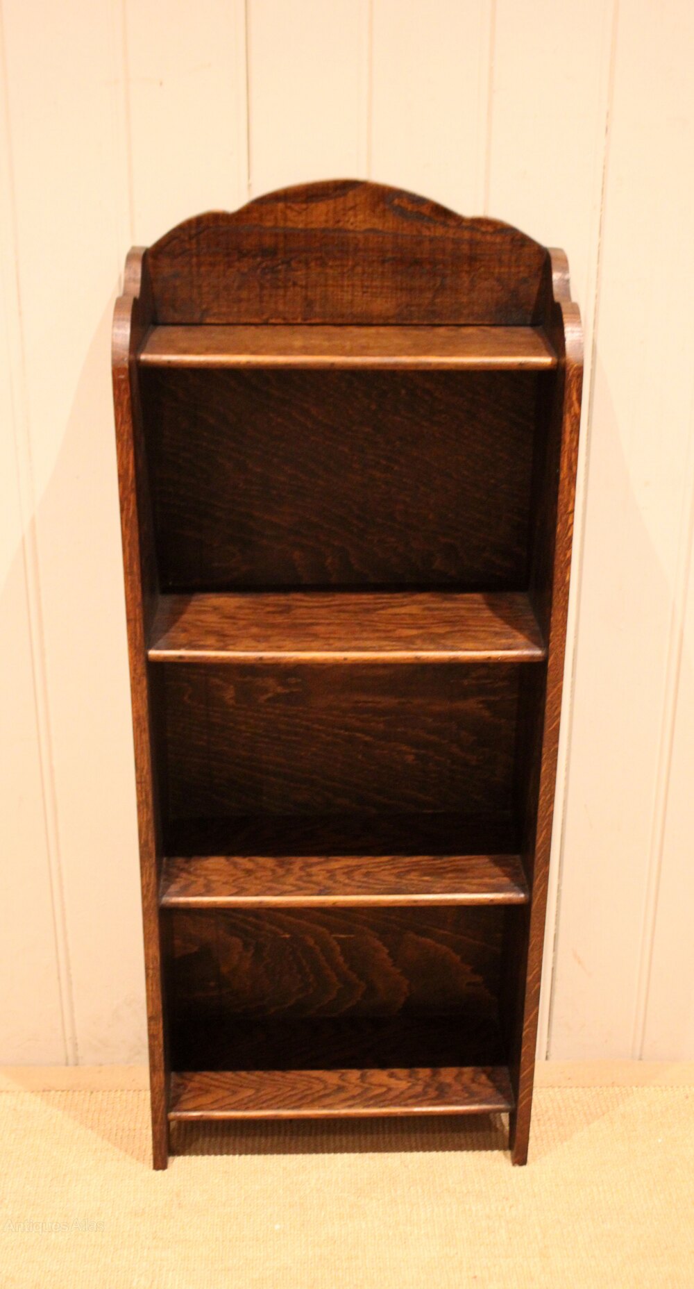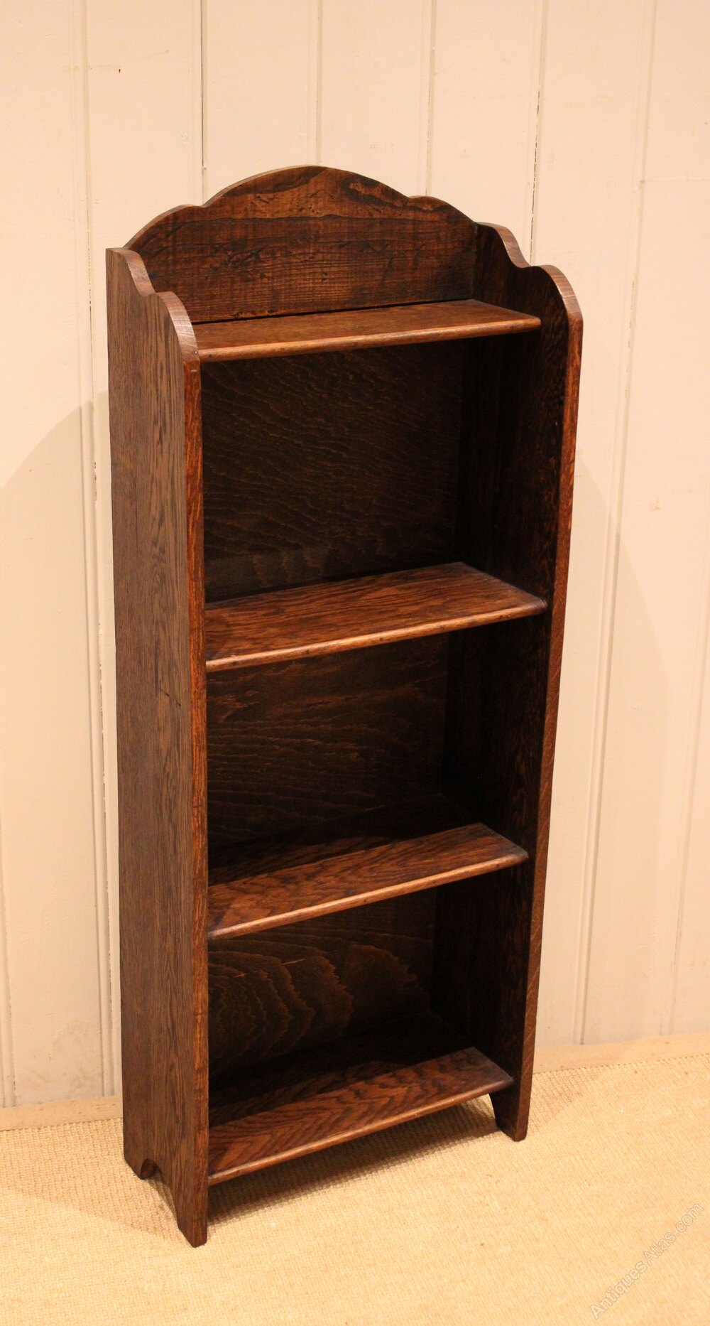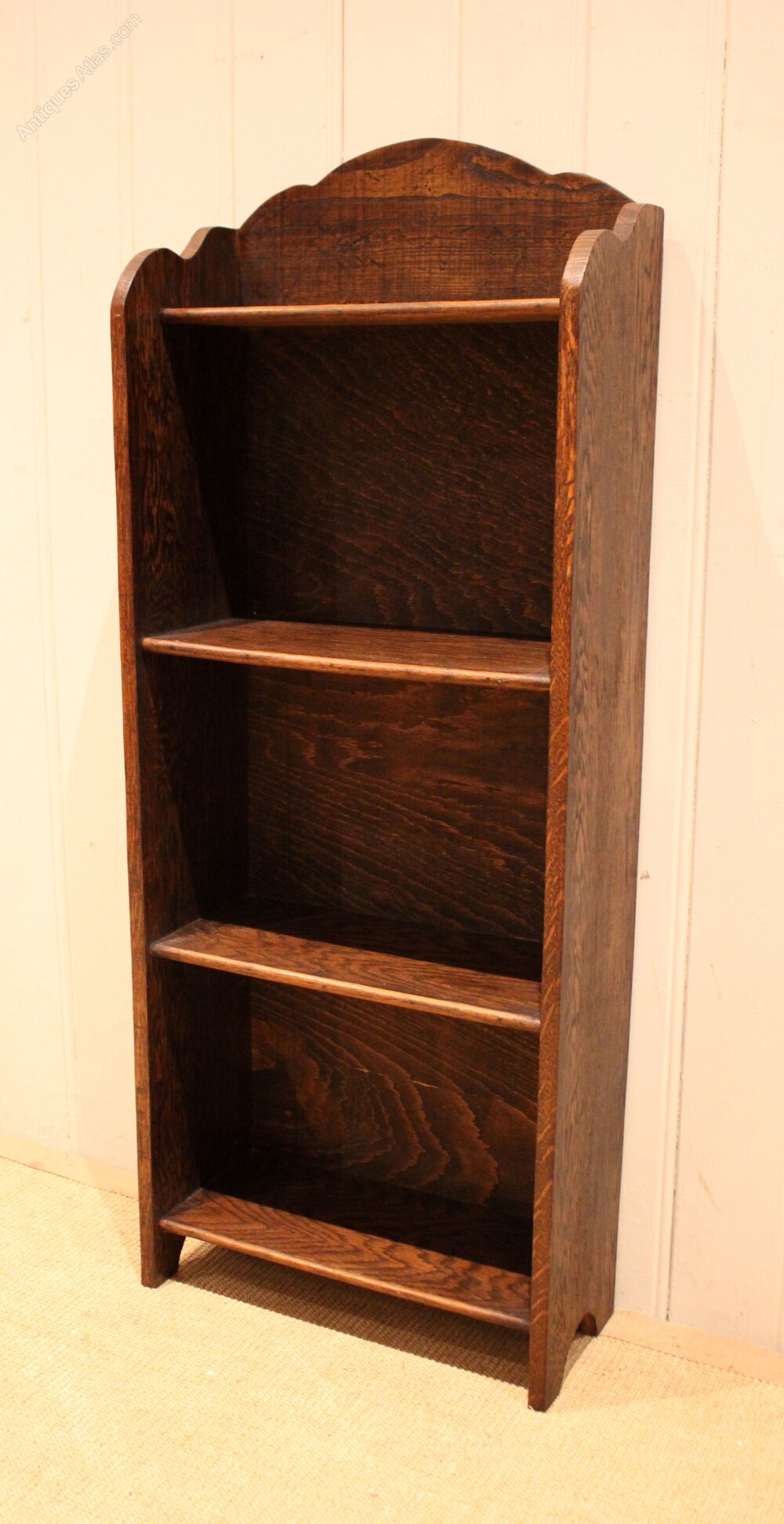 Small proportioned oak open bookcase having a shaped arch top with four fixed shelves , raised on side brackets . The shelf dimensions are 26.5 cm high , 38.5 cm wide and 16.5 cm deep .