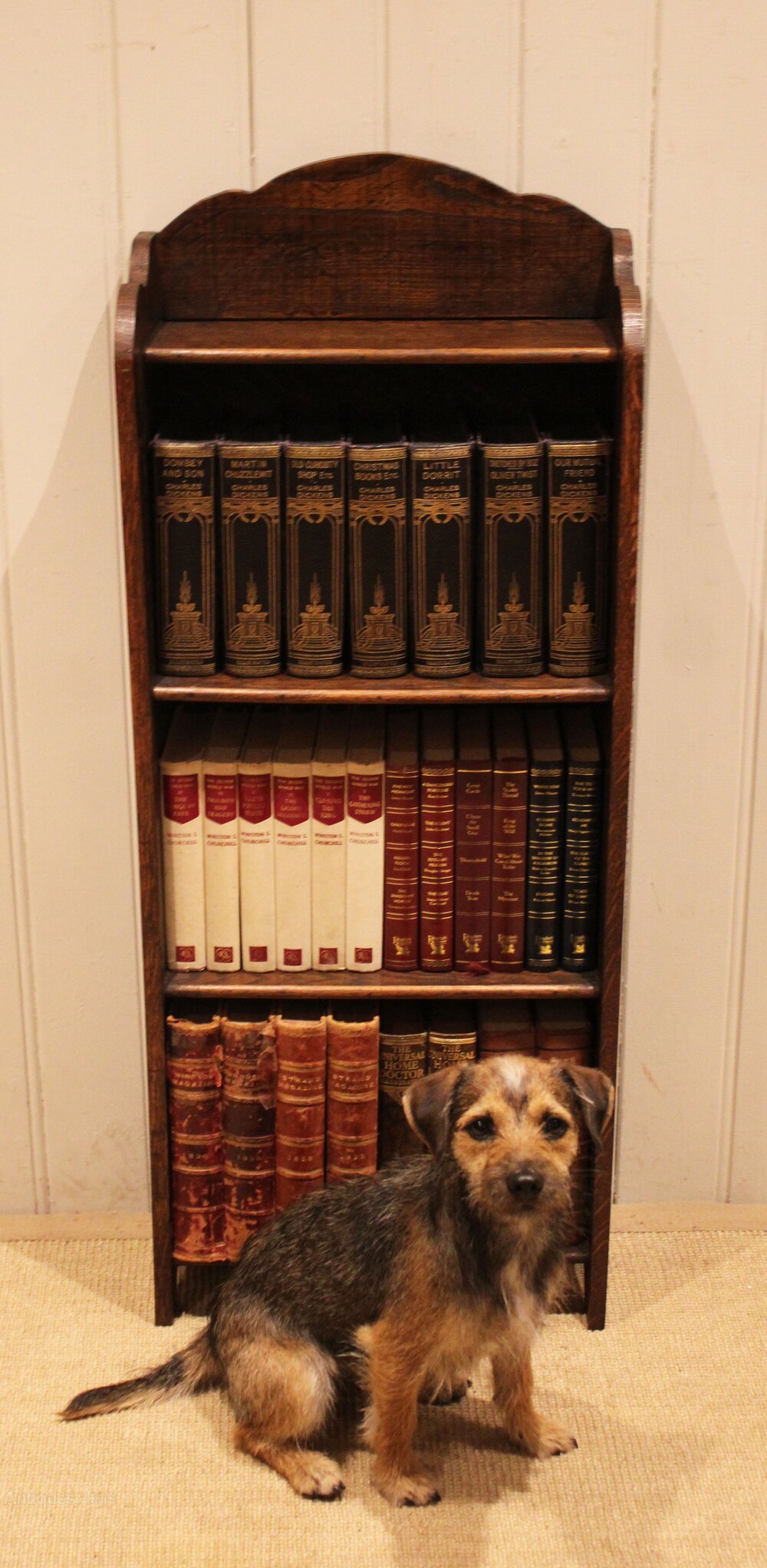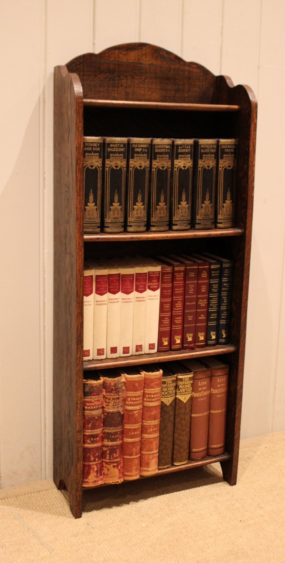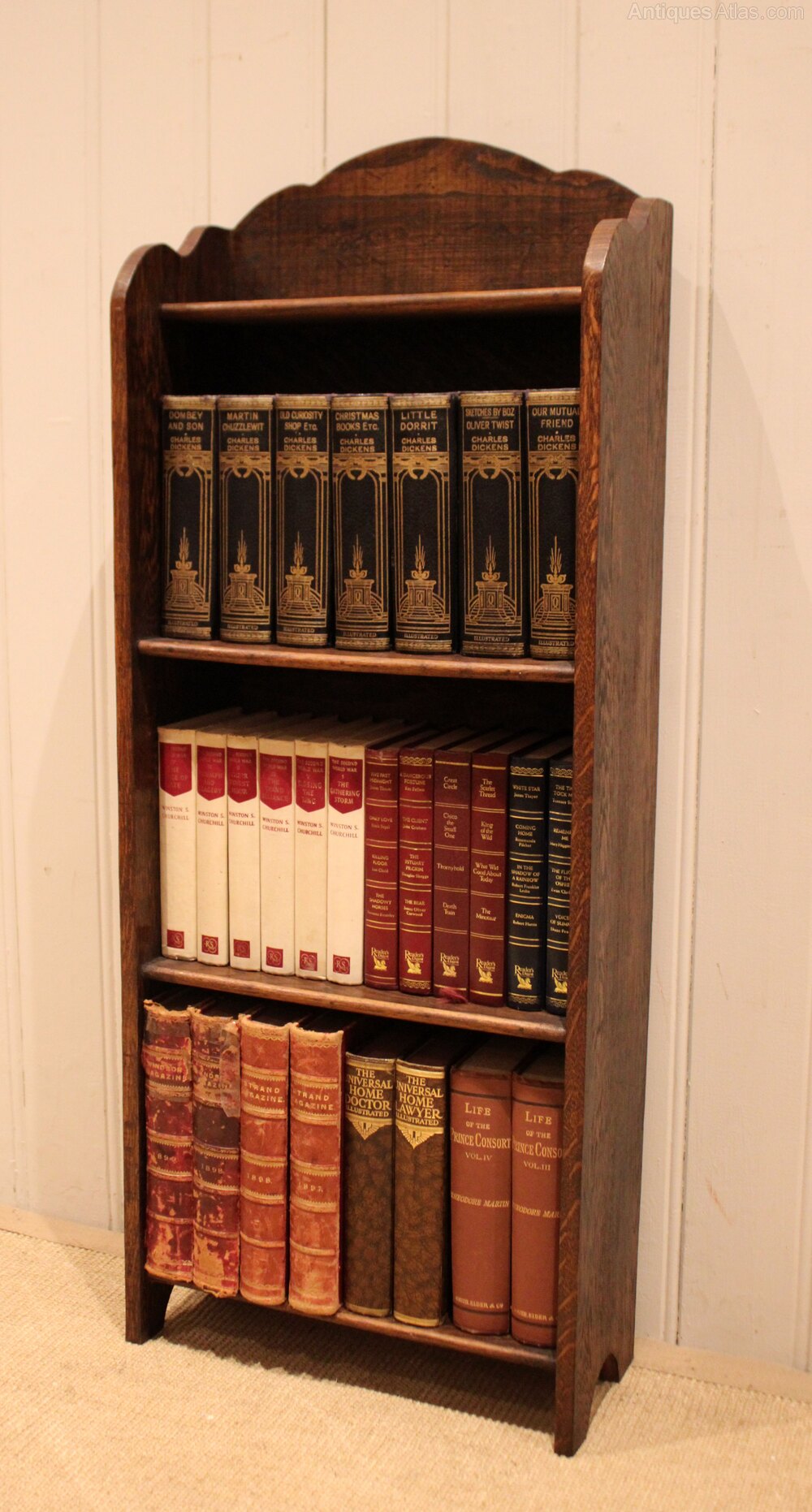 Small proportioned oak open bookcase having a shaped arch top with four fixed shelves , raised on side brackets . The shelf dimensions are 26.5 cm high , 38.5 cm wide and 16.5 cm deep .