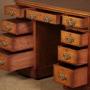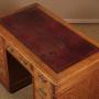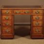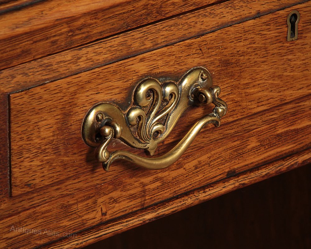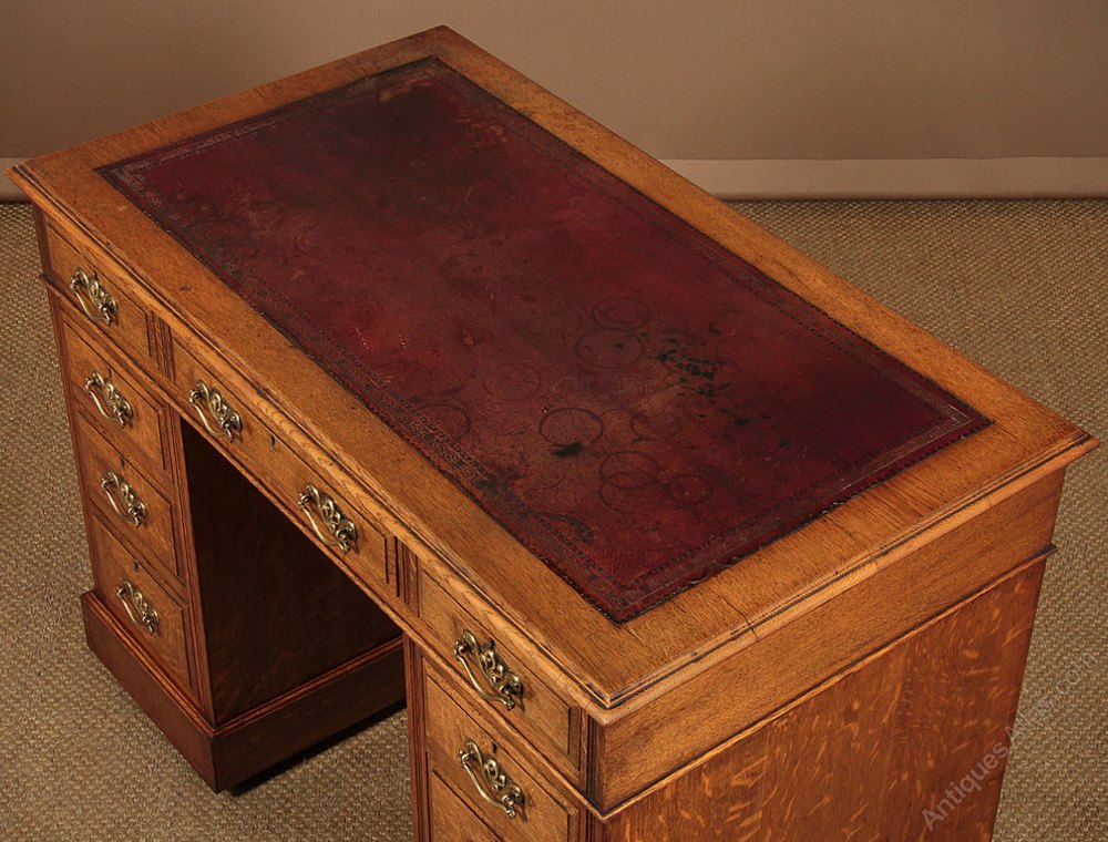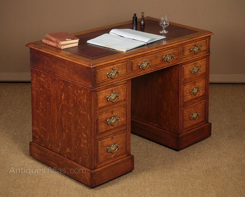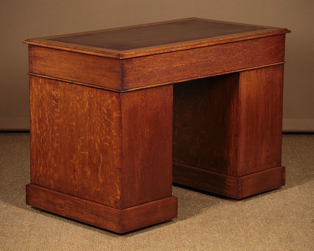 Late 19th.c. oak pedestal desk c.1890. 42″ x 24″ top with original tooled leather skiver and an ogee moulded edge over three drawers. Raised on twin pedestals, each with three drawers of graduated height. Moulded drawer fronts with the original and unusual brass handles (note the registered design number on each backplate). Reeded uprights and moulded plinths raised on the original ceramic castors bellow. Solid oak sides and mahogany drawer linings. Obvious wear to the leather which could be replaced if preferred. Ohterwise excellent colour and condition, repairs to the corners of the plinths, cleaned and waxed in our workshops. Key supplied.