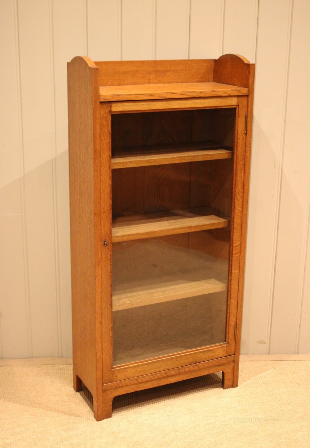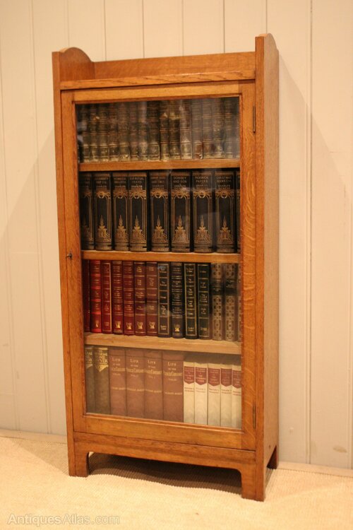 Small Arts & Crafts style light oak bookcase having a single glazed door with three internal adjustable shelves , raised on short shaped feet.