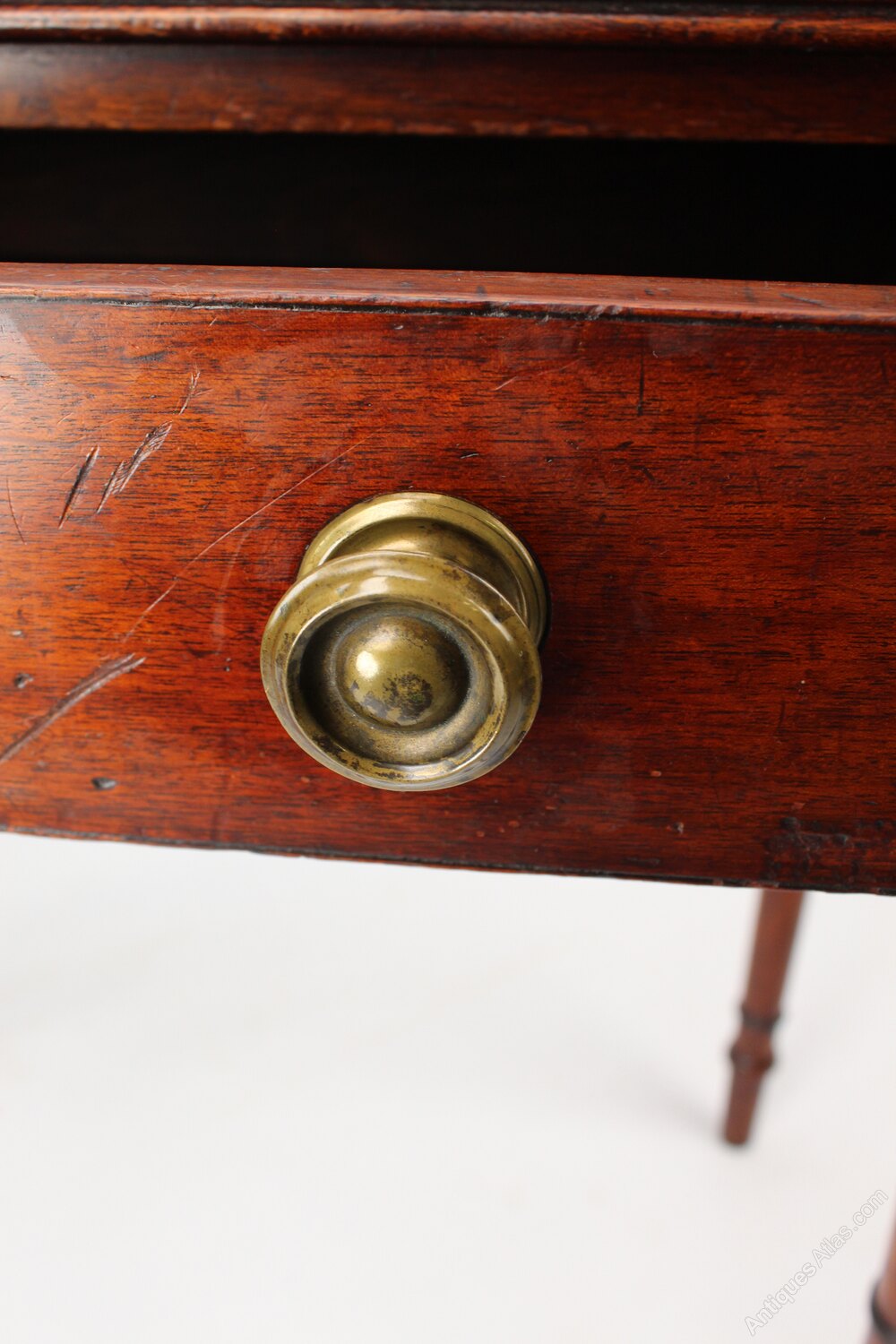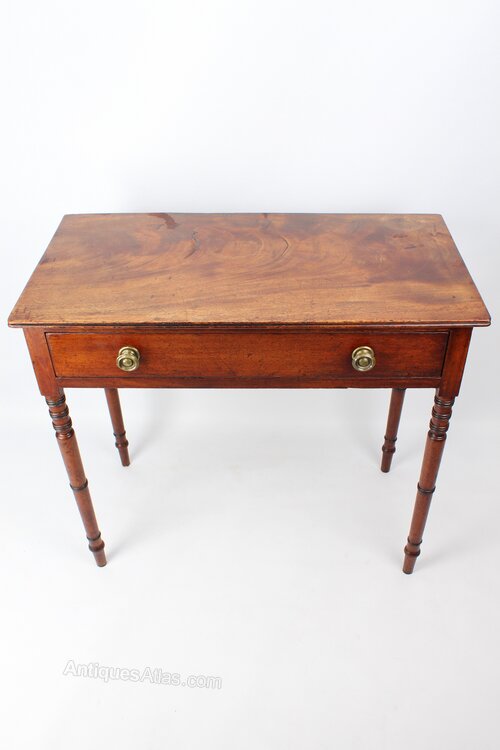 A small elegant antique regency mahogany writing desk or side table with single drawer dating from circa 1820. In a wonderfully figured mahogany with a rich patina it stands on slender ring turned legs and has a two chunky turned brass handles to the drawer front. A small useful size it would make an attractive hall table, side table or be perfect as a small desk.