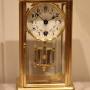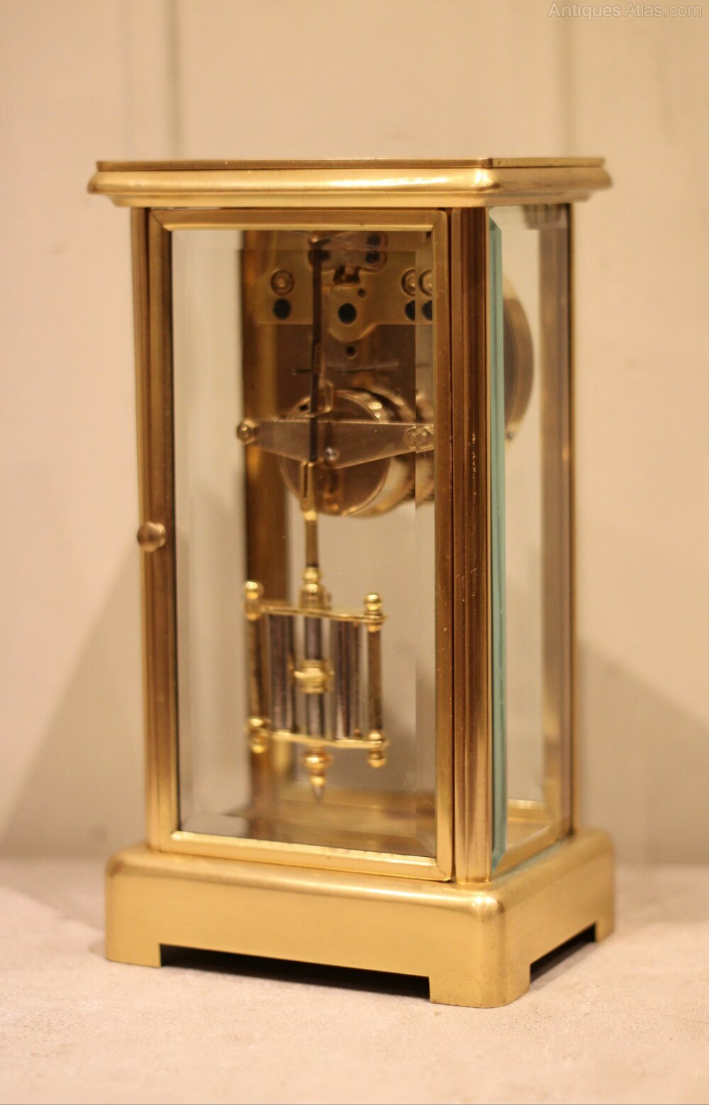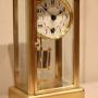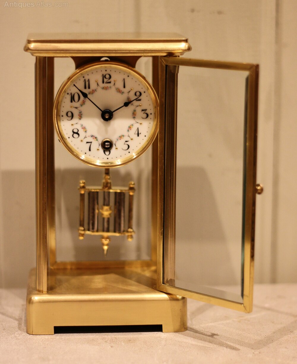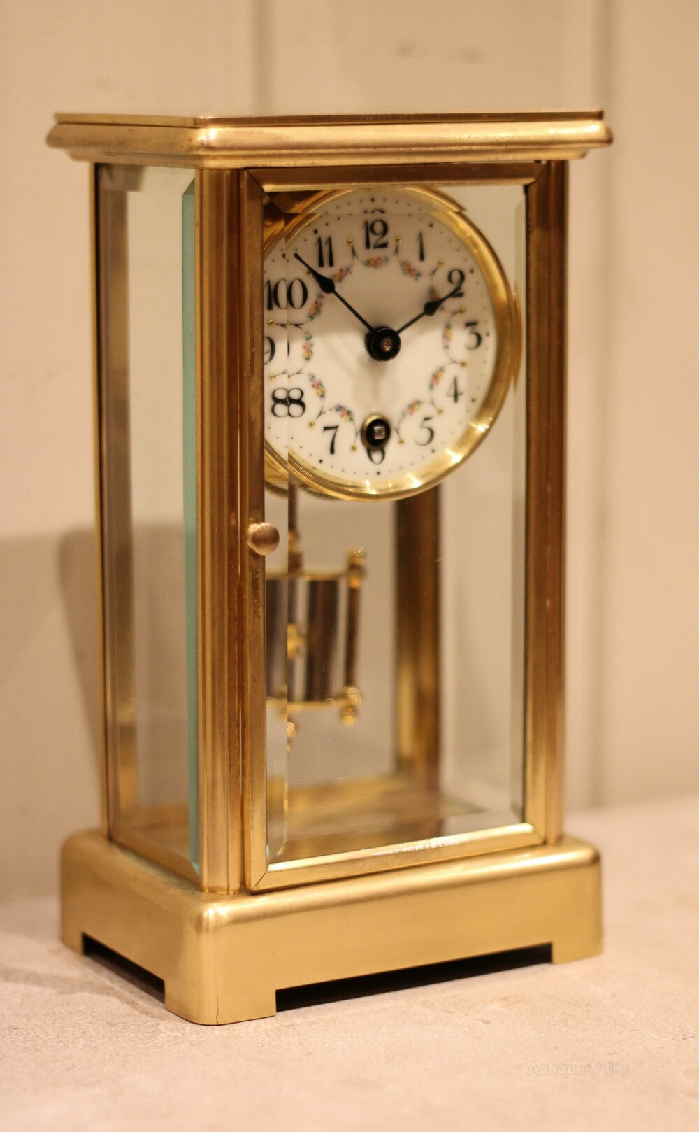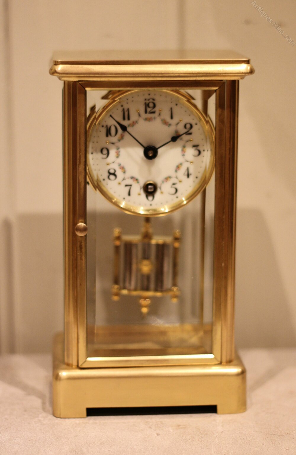 A small, timepiece four glass clock, having a plain brass case with bevel edge glass to the sides, and front. It has an 8 day pendulum movement, with a floral enamel and a simulated mercury pendulum.
