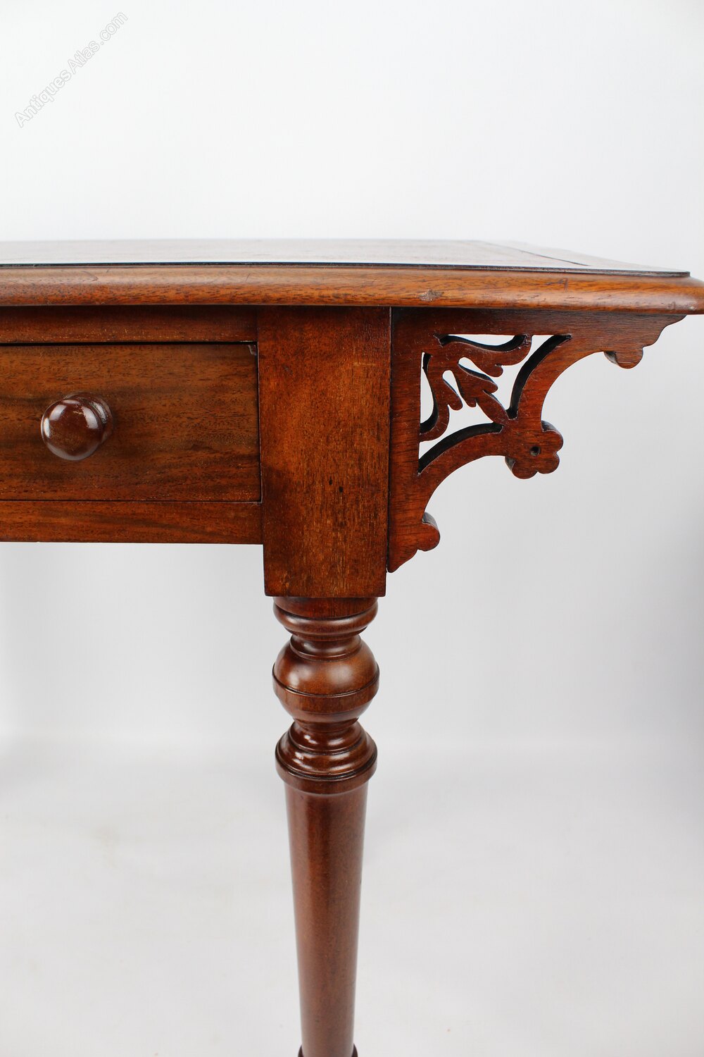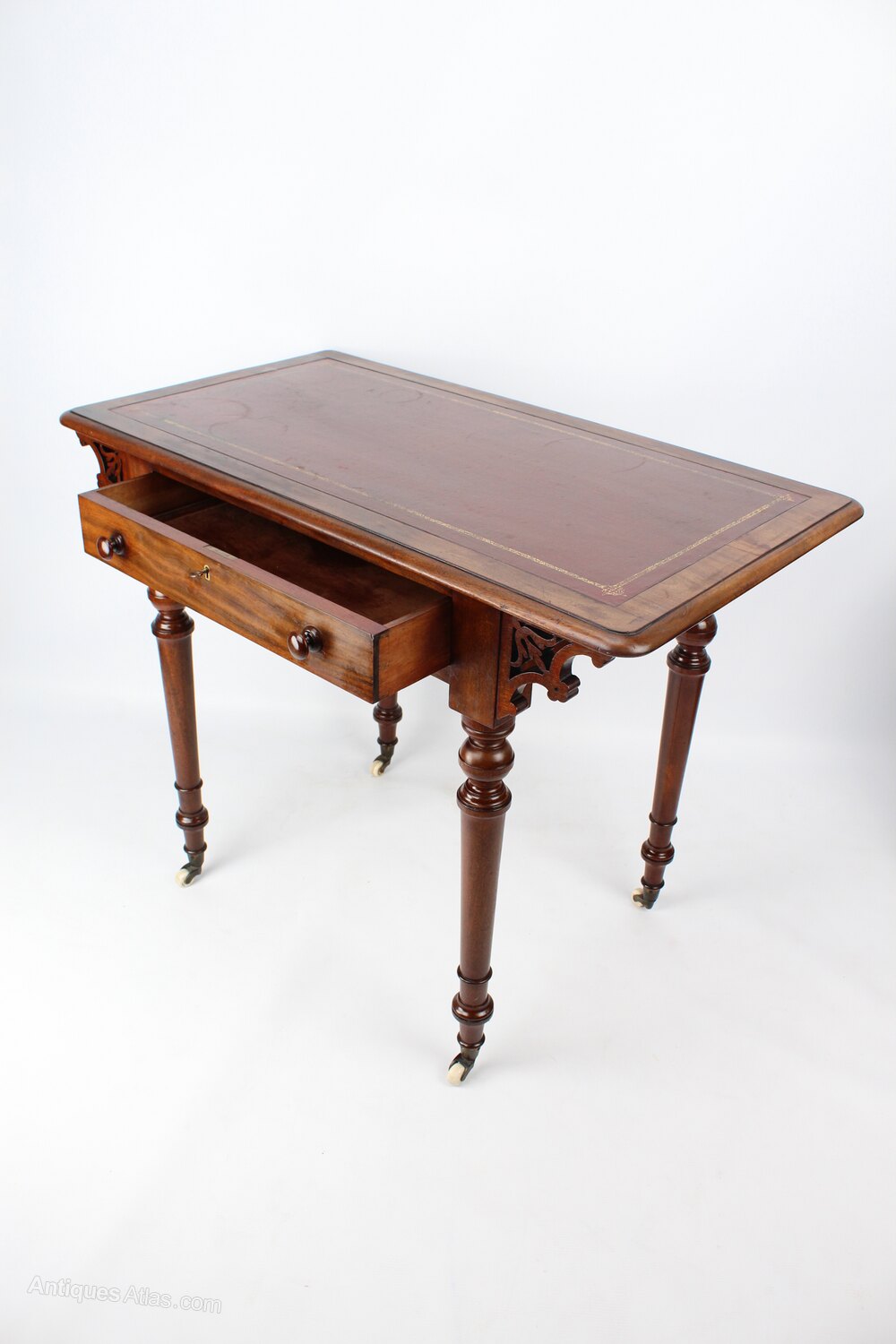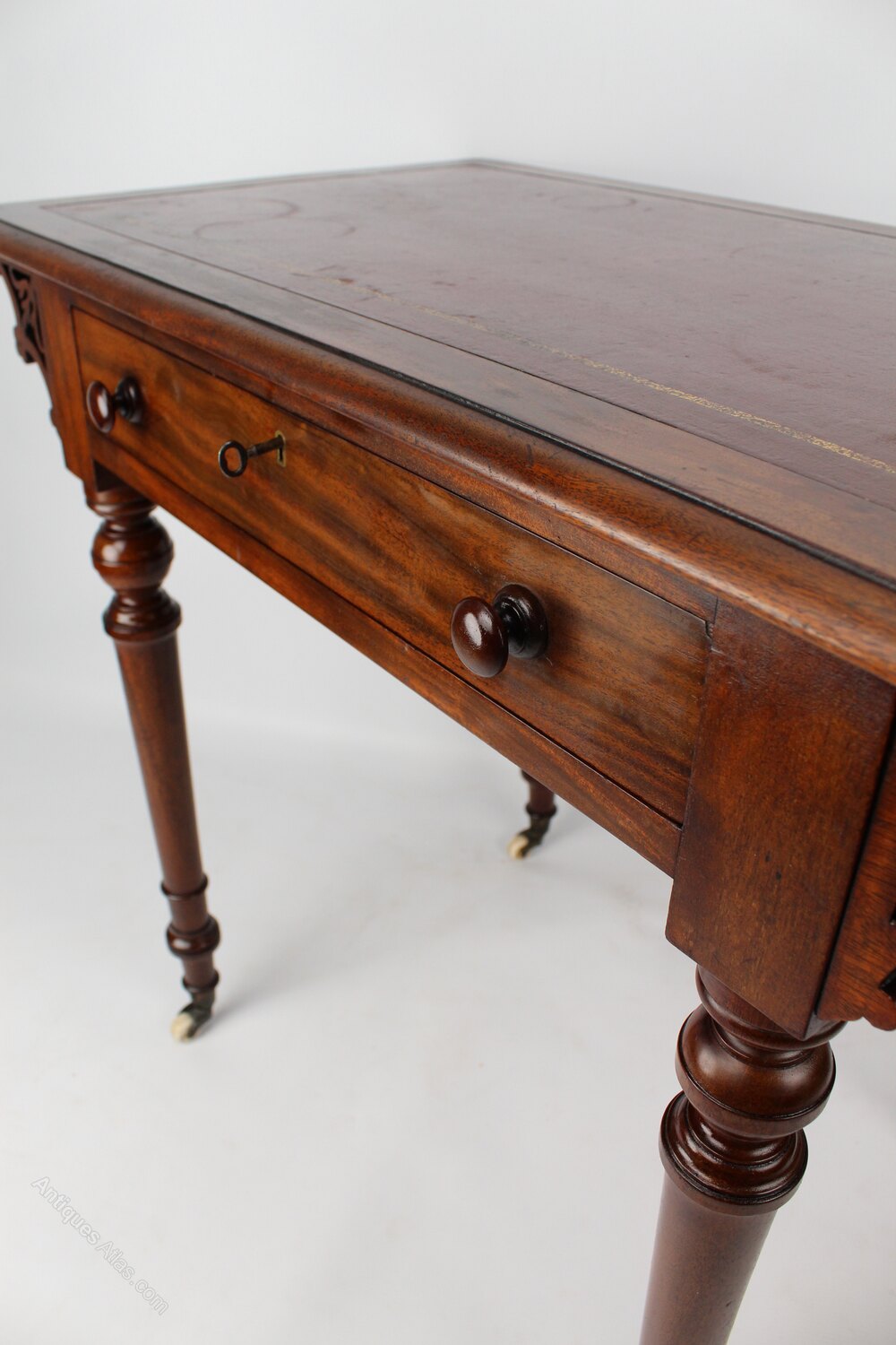 An elegant small sized antique Victorian mahogany desk or writing table, dating from circa 1860. Good quality with a beautiful and stylish design the over-sailing rectangular top has an inset tooled red leather writing surface above a single drawer with original turned handles, brass thread escutcheon and working brass lock with key. The sides are decorated with elegant scrollwork and it stands on nicely turned and tapered legs culminating in brass and ceramic Cope and Collinson casters. A good sized desk at only 91cm wide, but still offering plenty of work space and storage.
