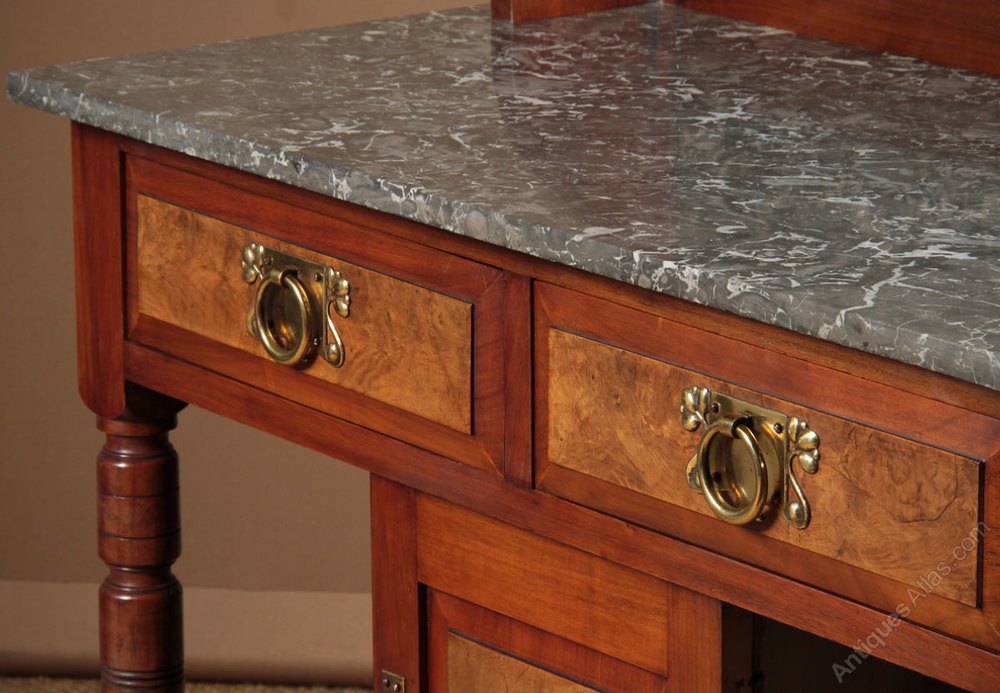 Small late 19th.c. walnut and marble top washstand or dressing table c.1895. Just 36″ wide. Well figured marble top with a tall matching splash back with walnut surround and shaped brackets. Over two drawers and a small cupboard flanked with open shelves. Ideal for conversion into a sink unit (with the cupboard to hide the plumbing). In solid walnut with moulded drawer and door fronts veneered in burr walnut with original Art Nouveau pattern brass handles. Raised on turned legs with original ceramic castors. Excellent condition, cleaned and waxed in our workshops.